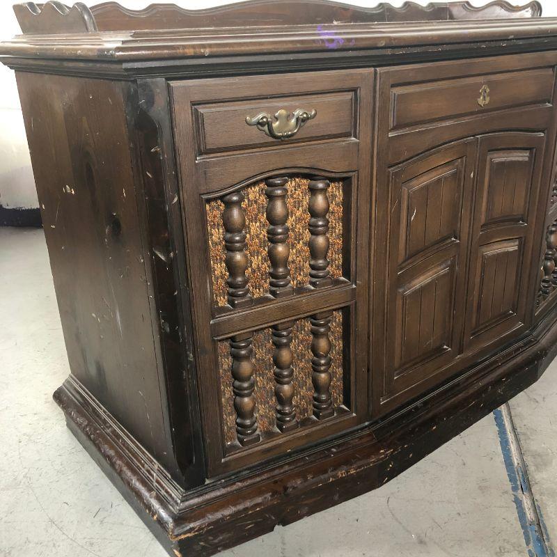 Lot 32 ~ 1950 - 1960 Sylvania record player/8-track tape/ radio console cabinet.