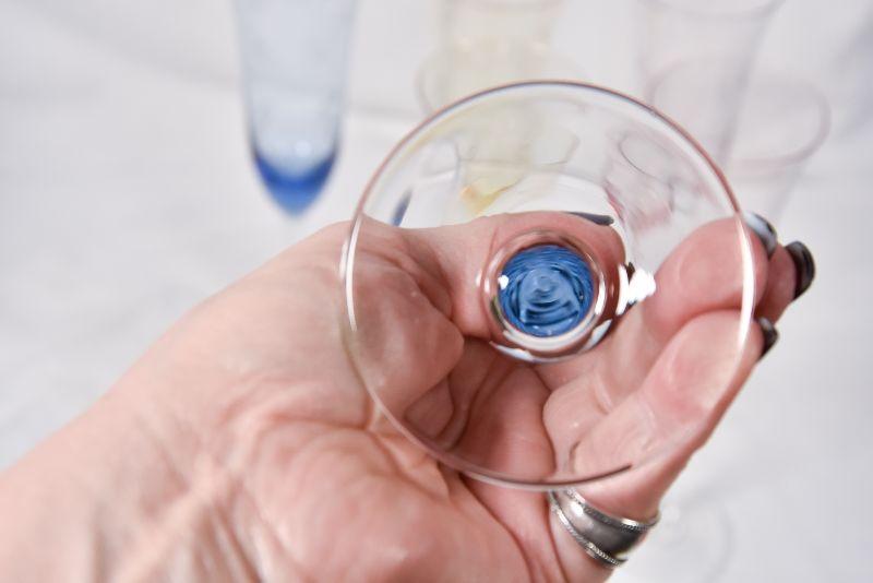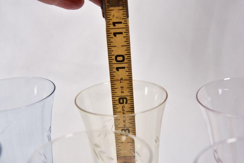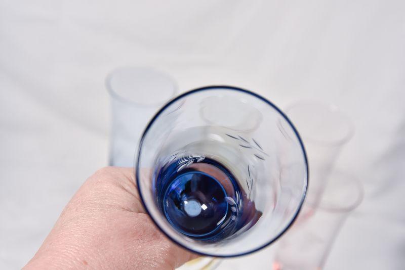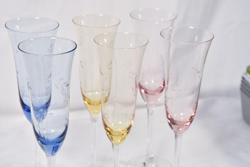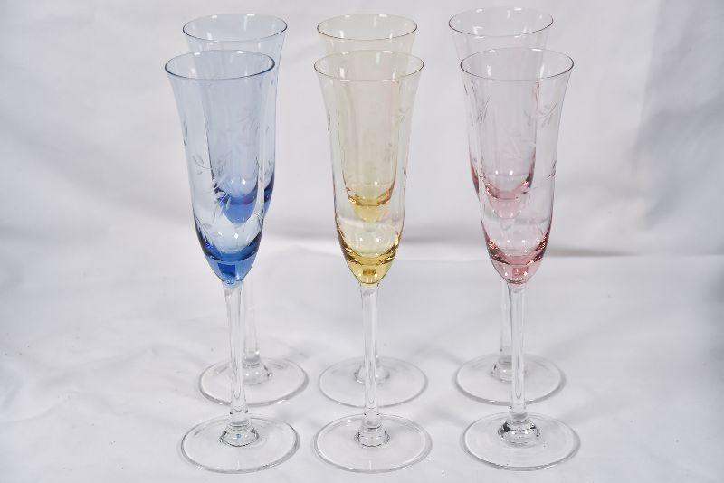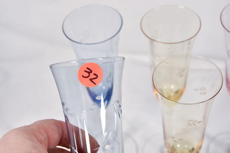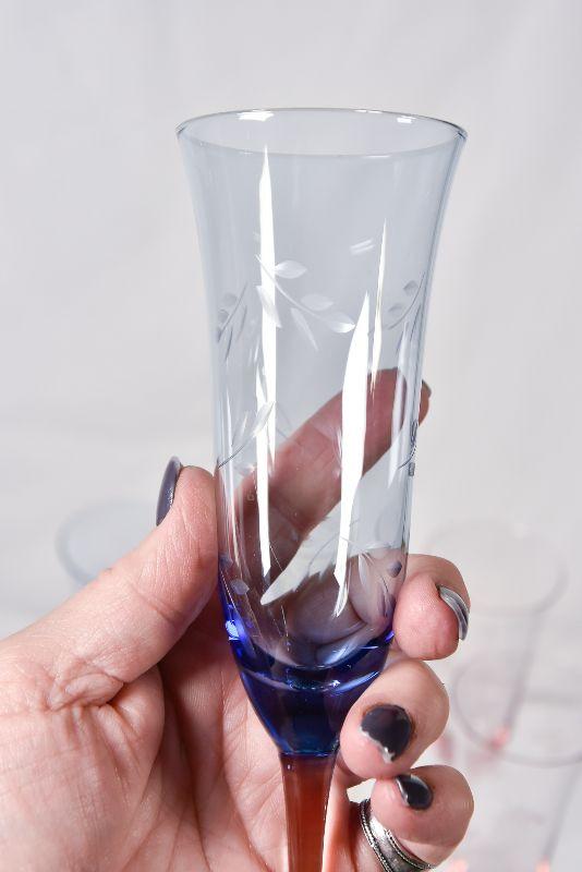 Beautiful etched, colored glass flutes.