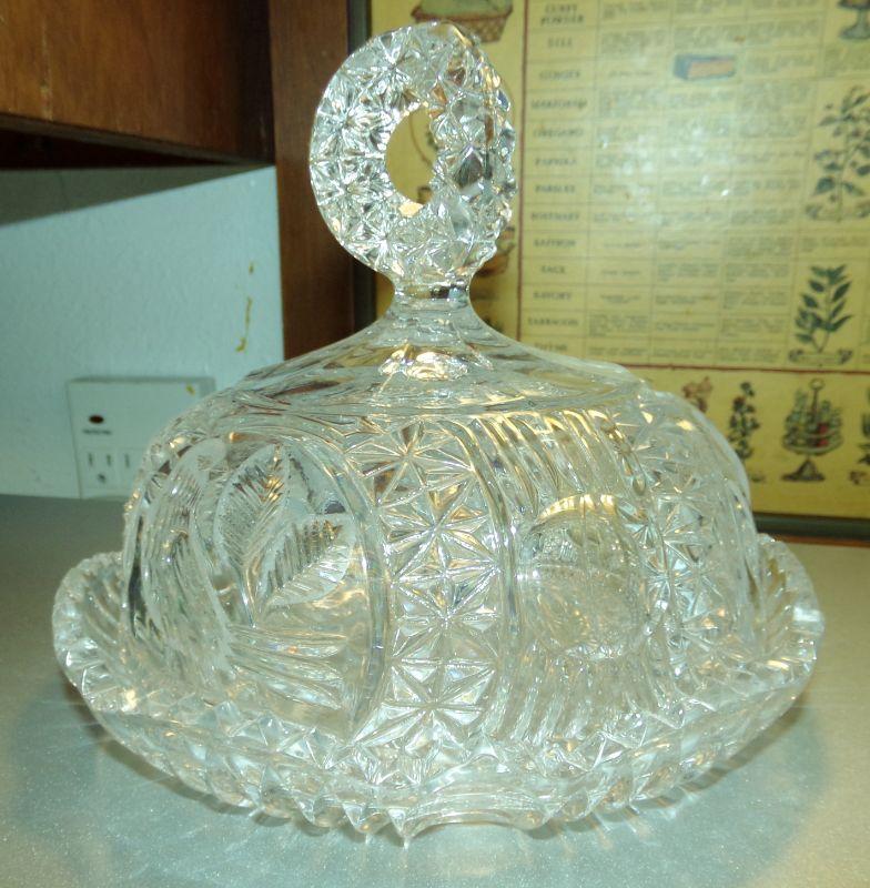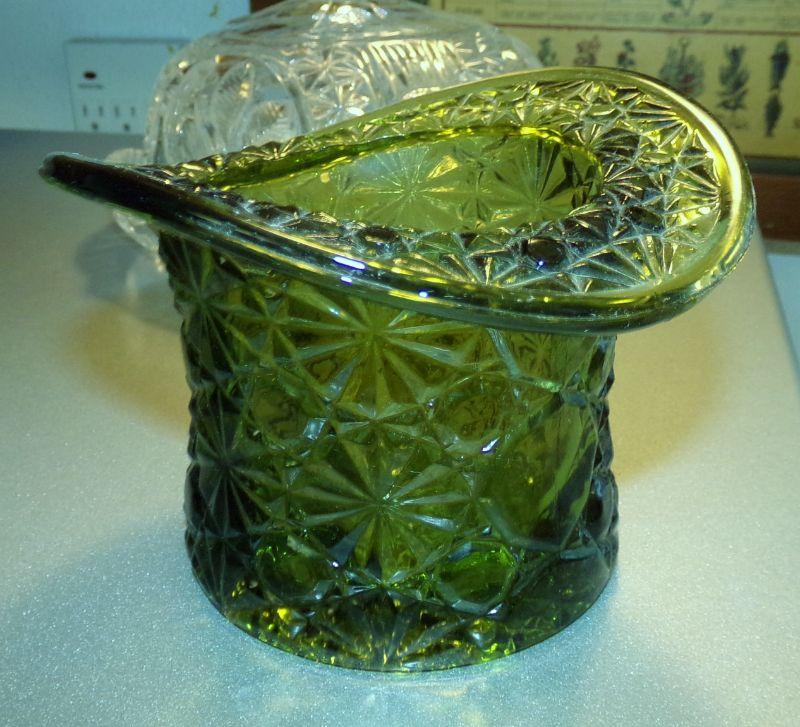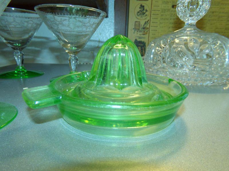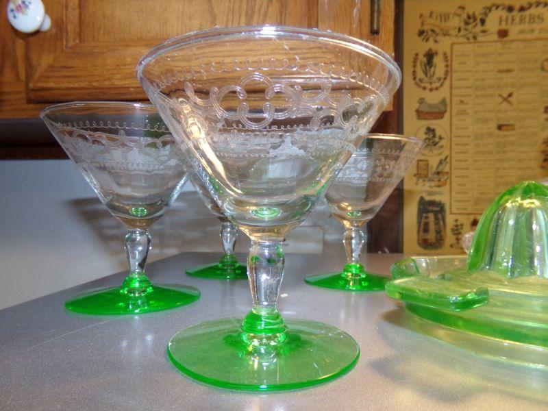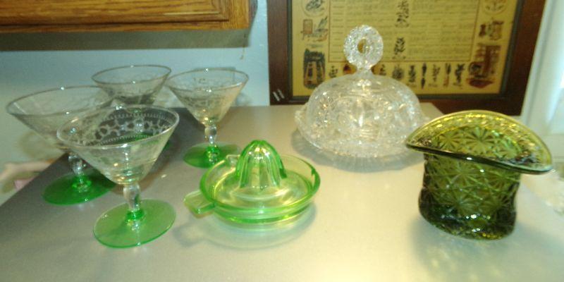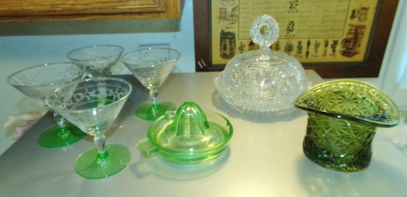 4 ETCHED DEPRESSION STEMMED GLASSES, JUICER, GLASS TOP HAT, CRYSTAL BUTTER OR CHEESE DISH