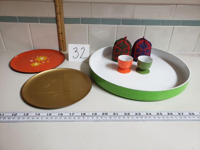 Lot 32: Mid Century Modern Georges Bertrand Green Tray, (2) Egg Cups & Cozies, 2 Plates