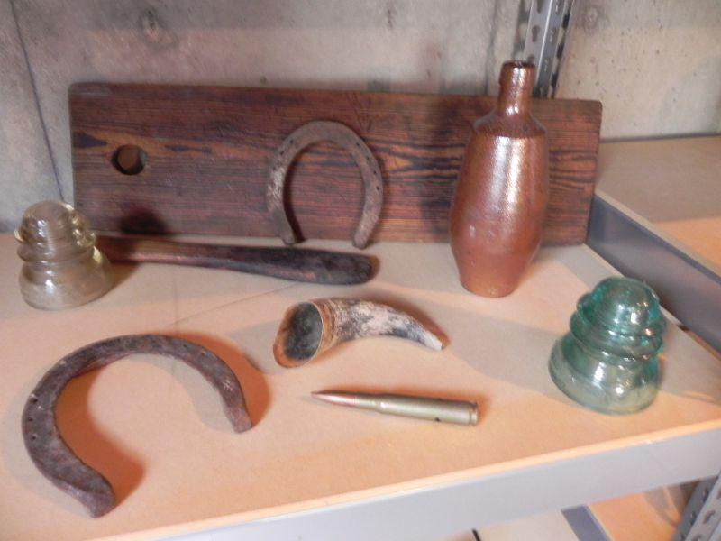 HORN HORSESHOES, CLAY BOTTLE, INSULATORS, BULLET