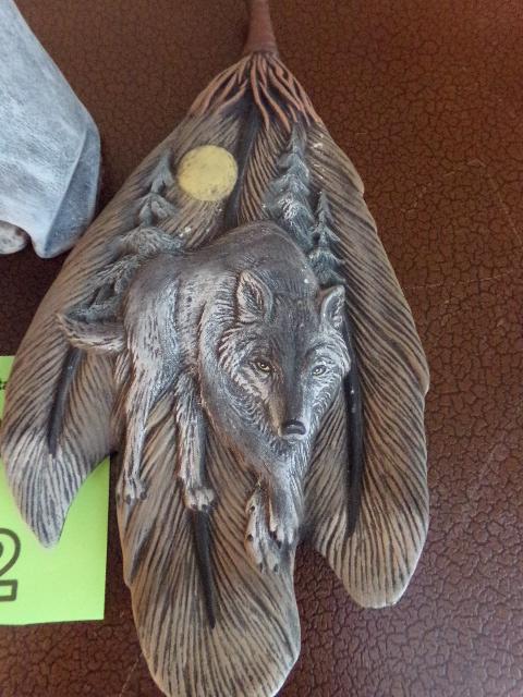TURTLE SHELL RATTLE & RESIN FEATHERS WITH WOLF WALL HANGING