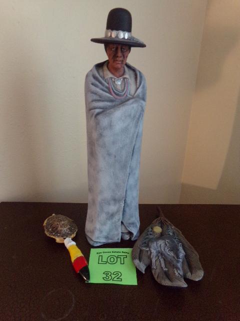 LOT 32 INDIAN STATUE & TURTLE SHELL RATTLE