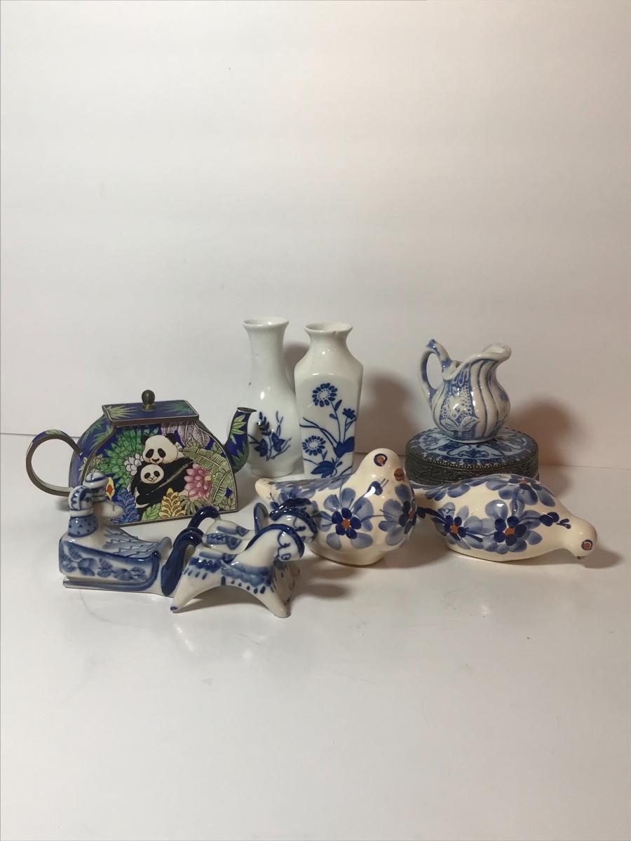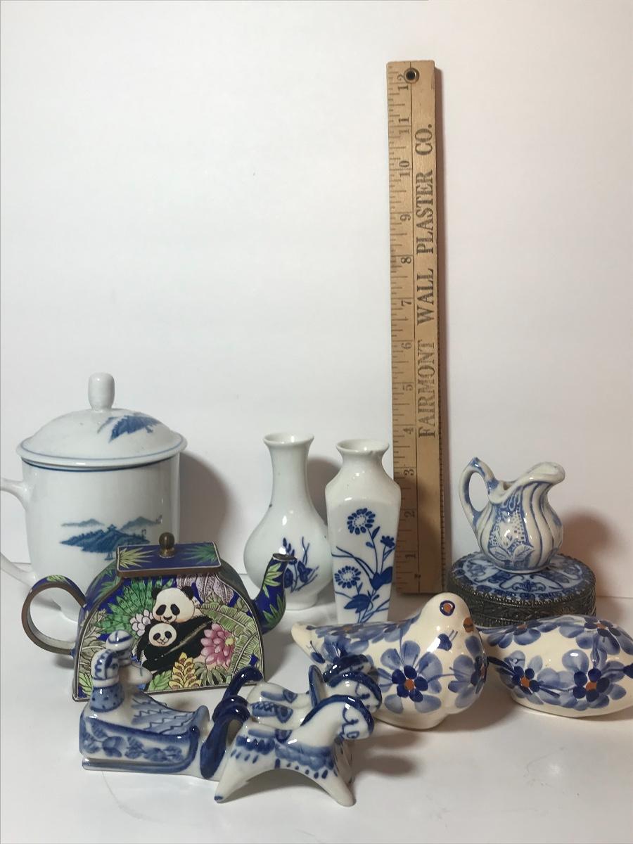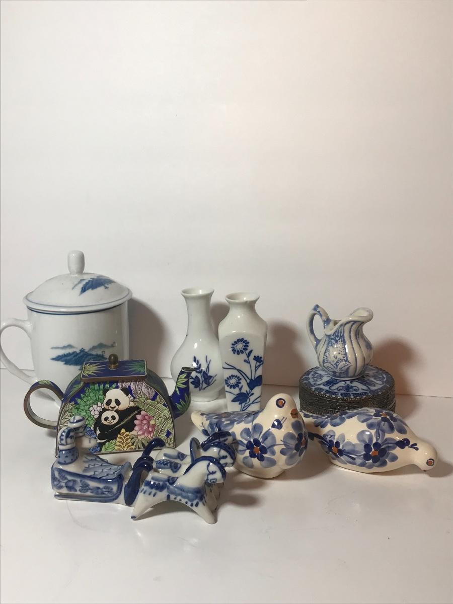 Blue and white collection, including porcelain trinket box with engraved, metal trim. Kelvin Chen enameled tea pot. Please see all pictures as they are the best representation of the items. The pictures show condition, measurements if taken, and what is included in the lot. Due to the large amount that we photograph and the time frame, we are not always able to take measurements. All items unless noted, are pre-owned and have been used. If you purchased furniture, you must bring help. We do not allow one person to carry large furniture out on their own. Bring help, tools and a truck for the safety of our client’s homes, and your personal safety. Company policy. Thank you.