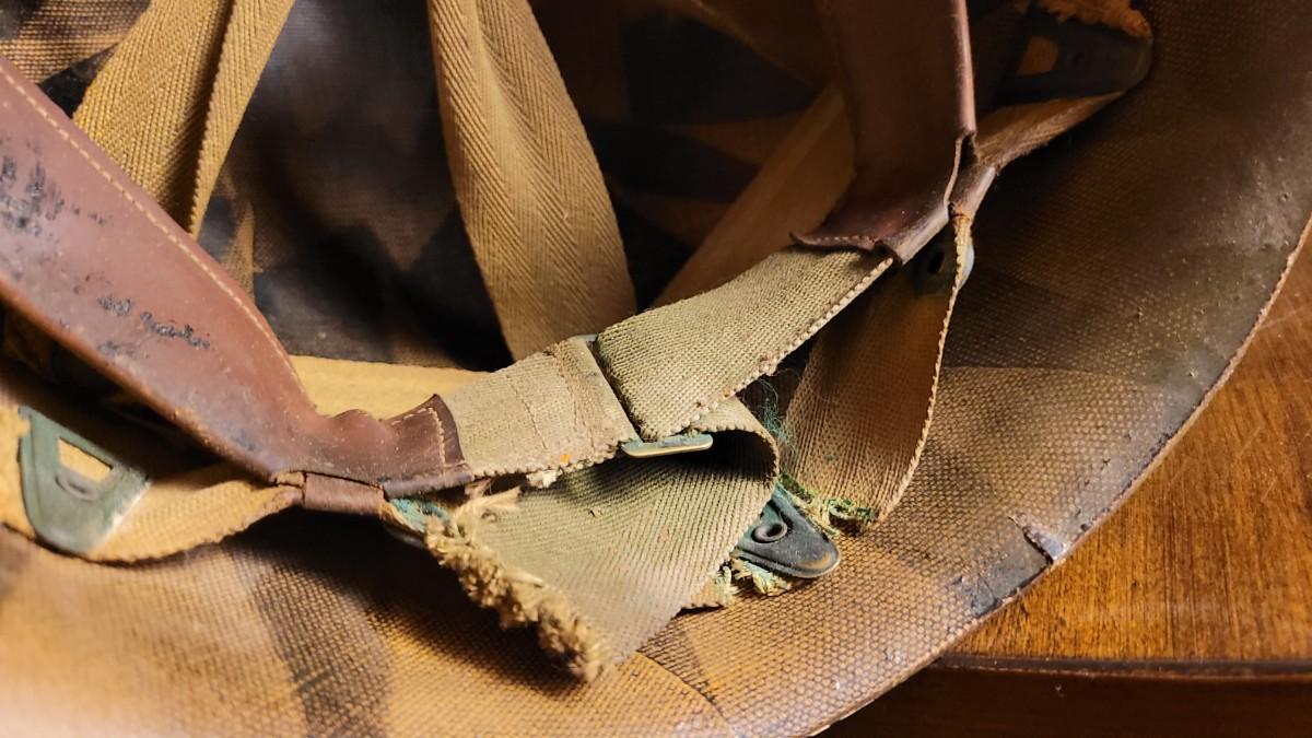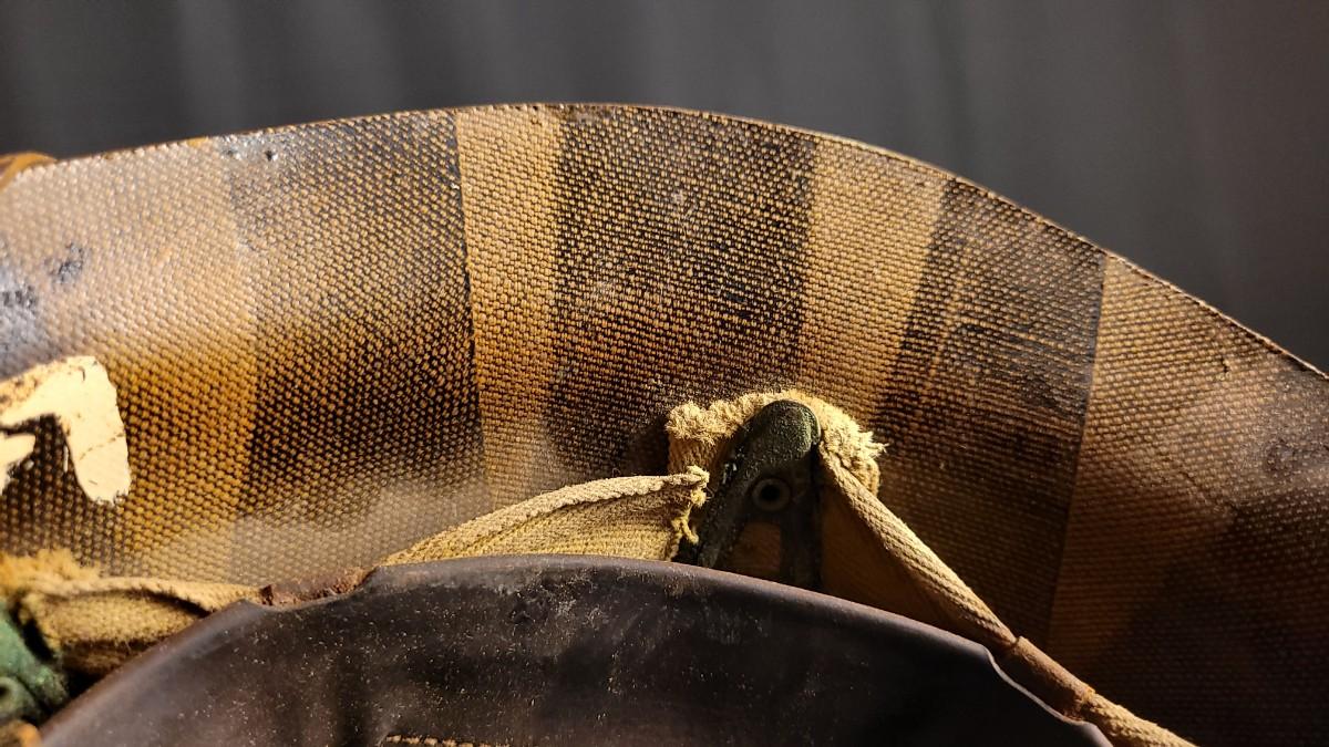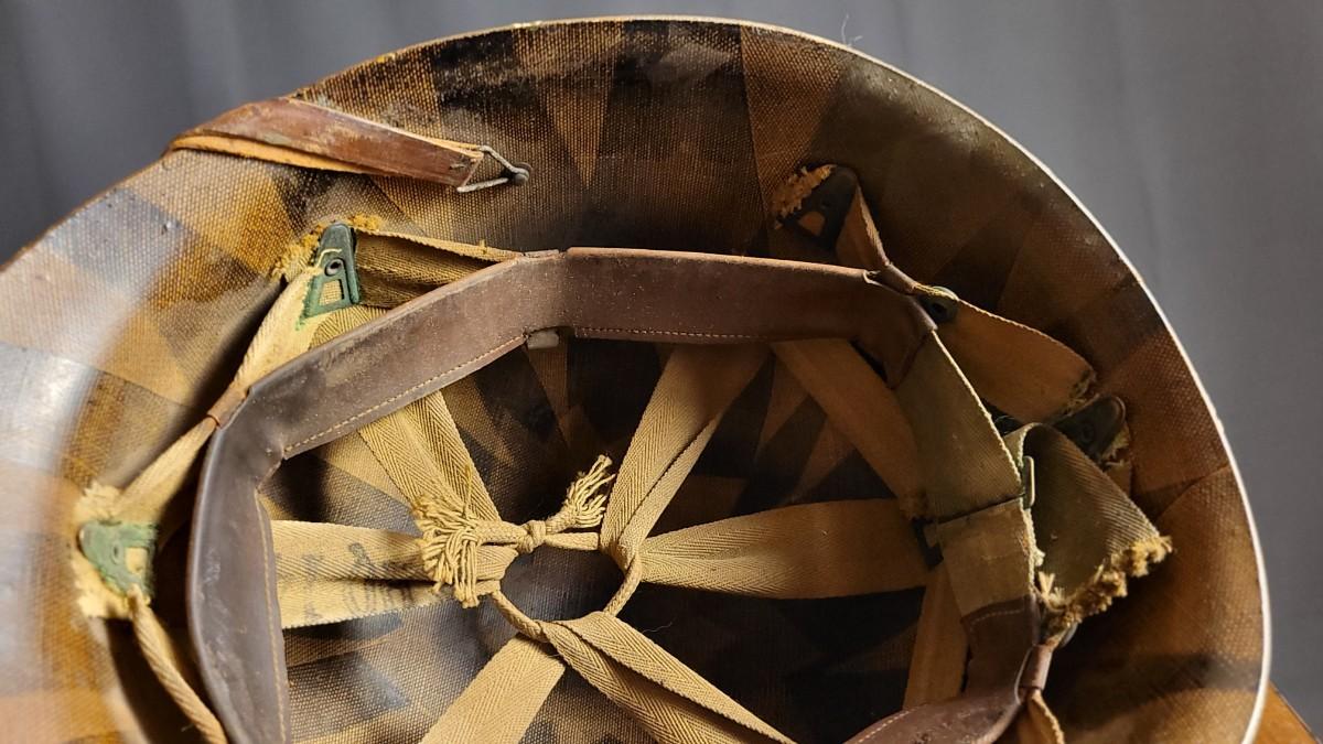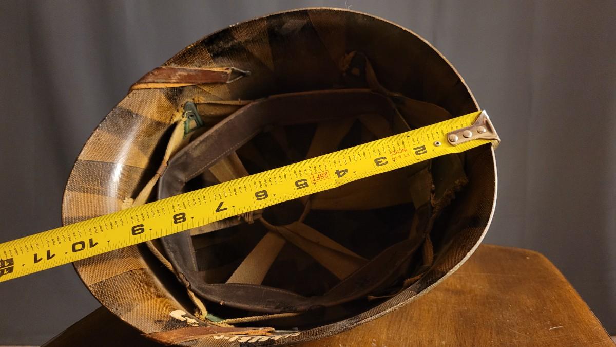 Authentic United States Military Combat Hat with Original Dual Decals and Complete Interior Webbing. Name and Rank Designation is clear. Measurement is shown in photos. A fine example of an Early American Military Collectible.