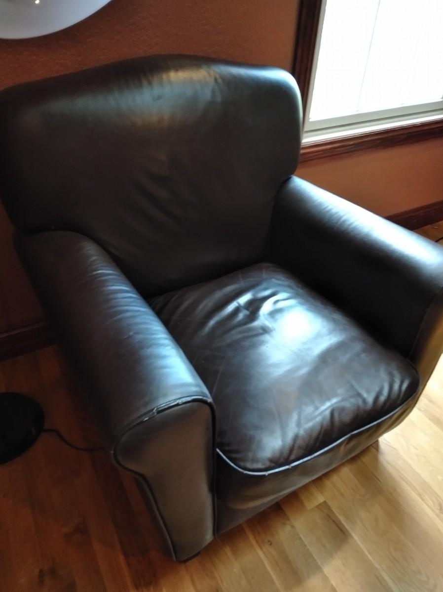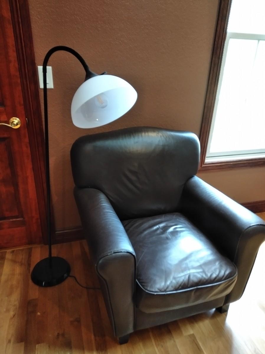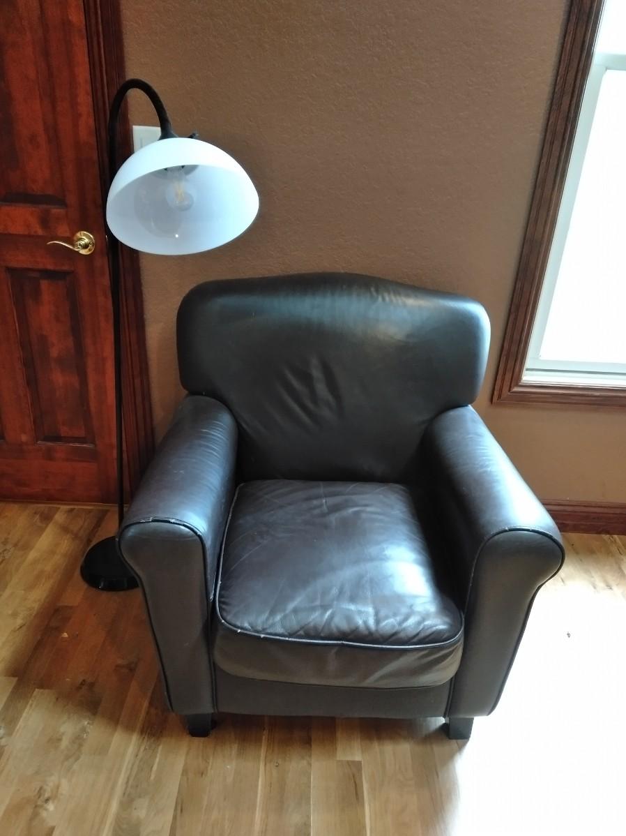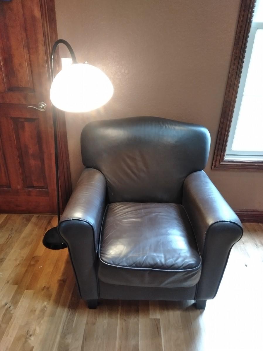 NICE BROWN PLEATHER CHAIR WITH BLACK FLOOR LAMP. CHAIR HAS SCRATCHES AND A CHIP OUT OF THE LEG AS SHOWN.