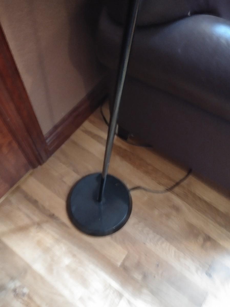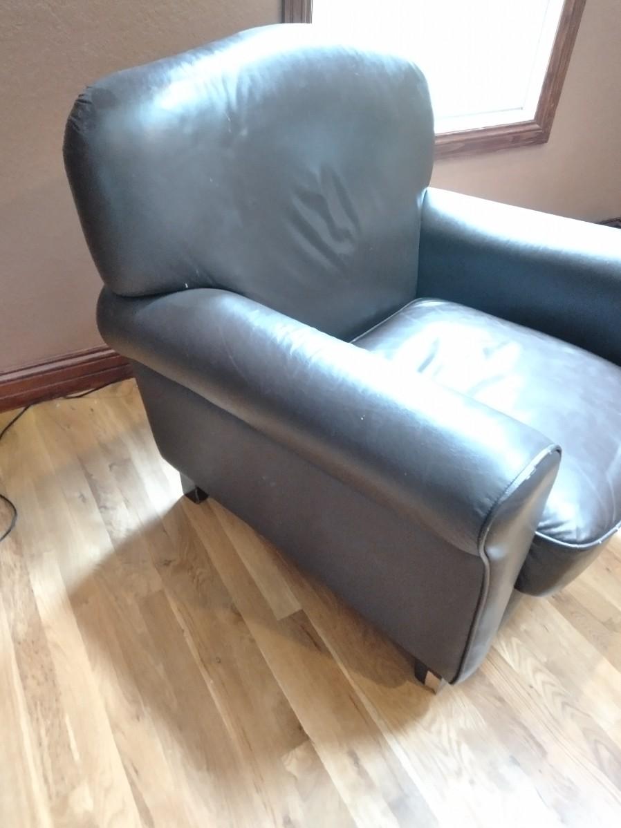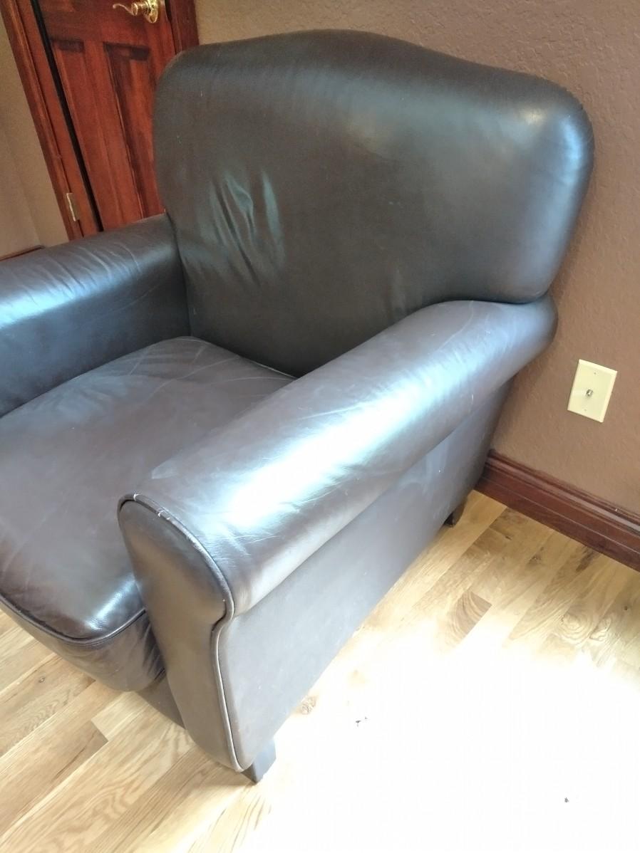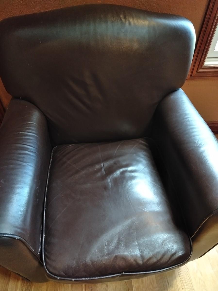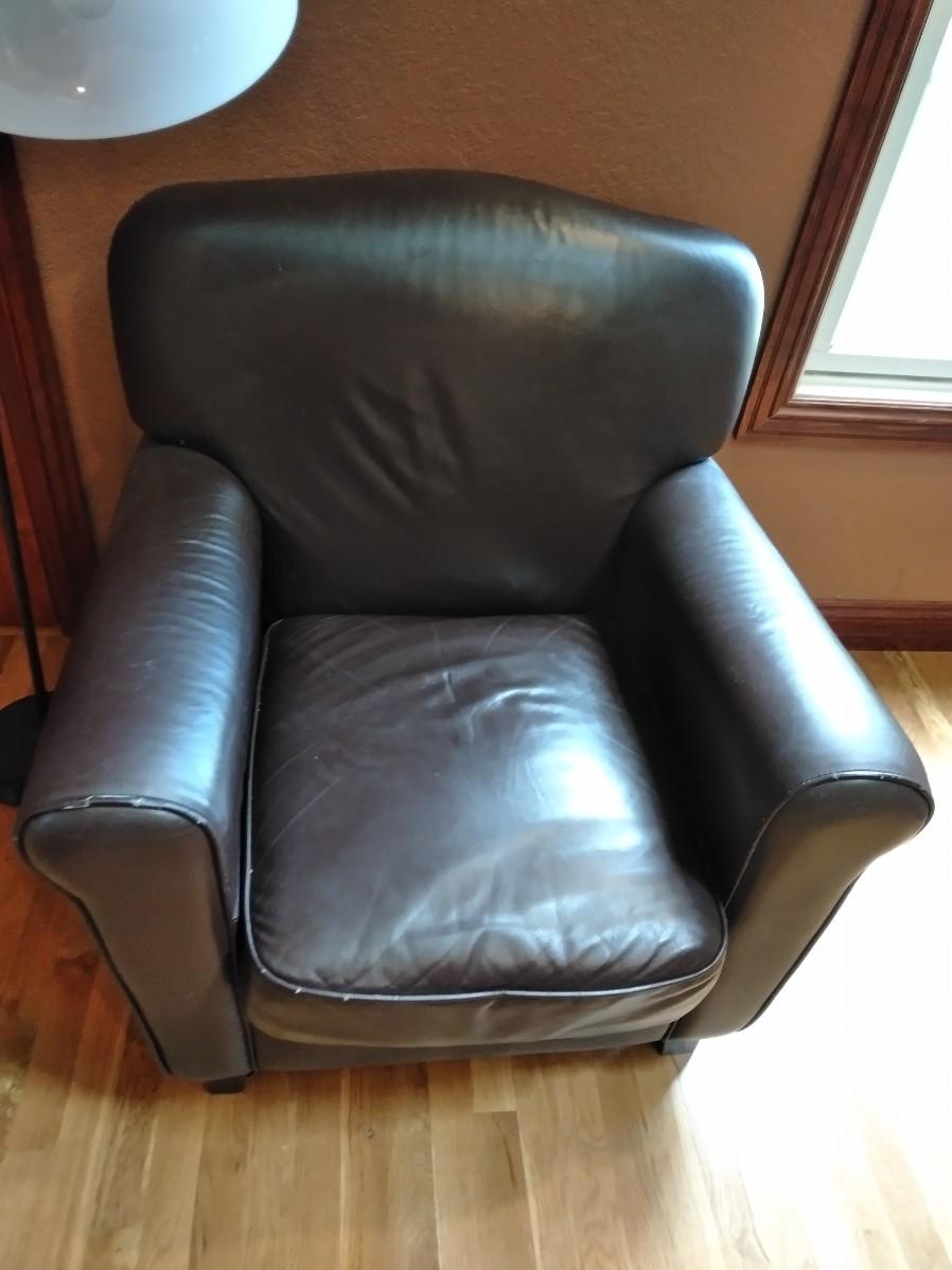 NICE BROWN PLEATHER CHAIR WITH BLACK FLOOR LAMP. CHAIR HAS SCRATCHES AND A CHIP OUT OF THE LEG AS SHOWN.