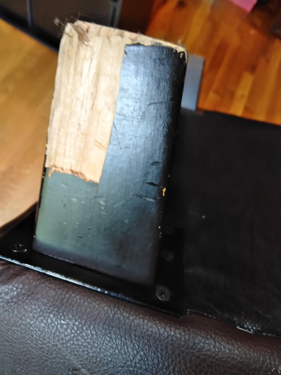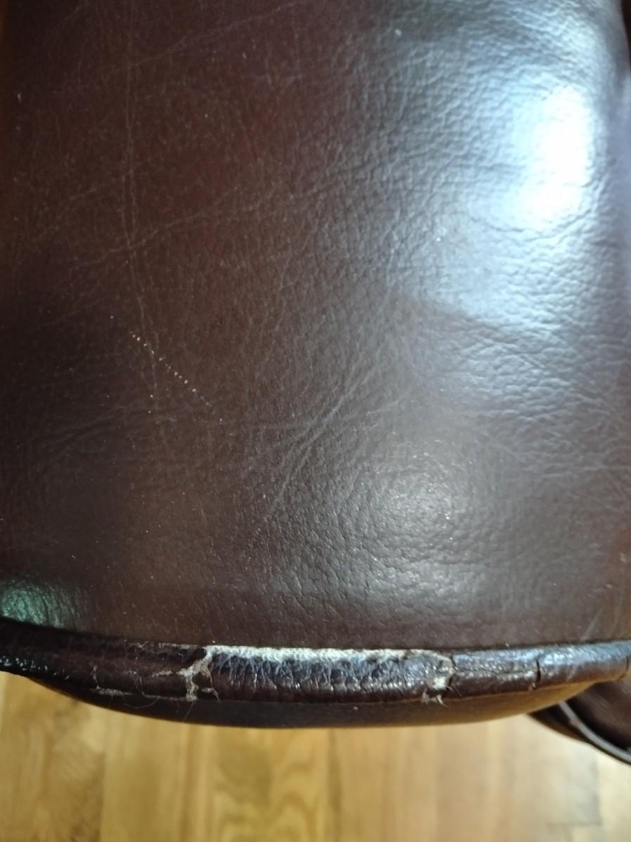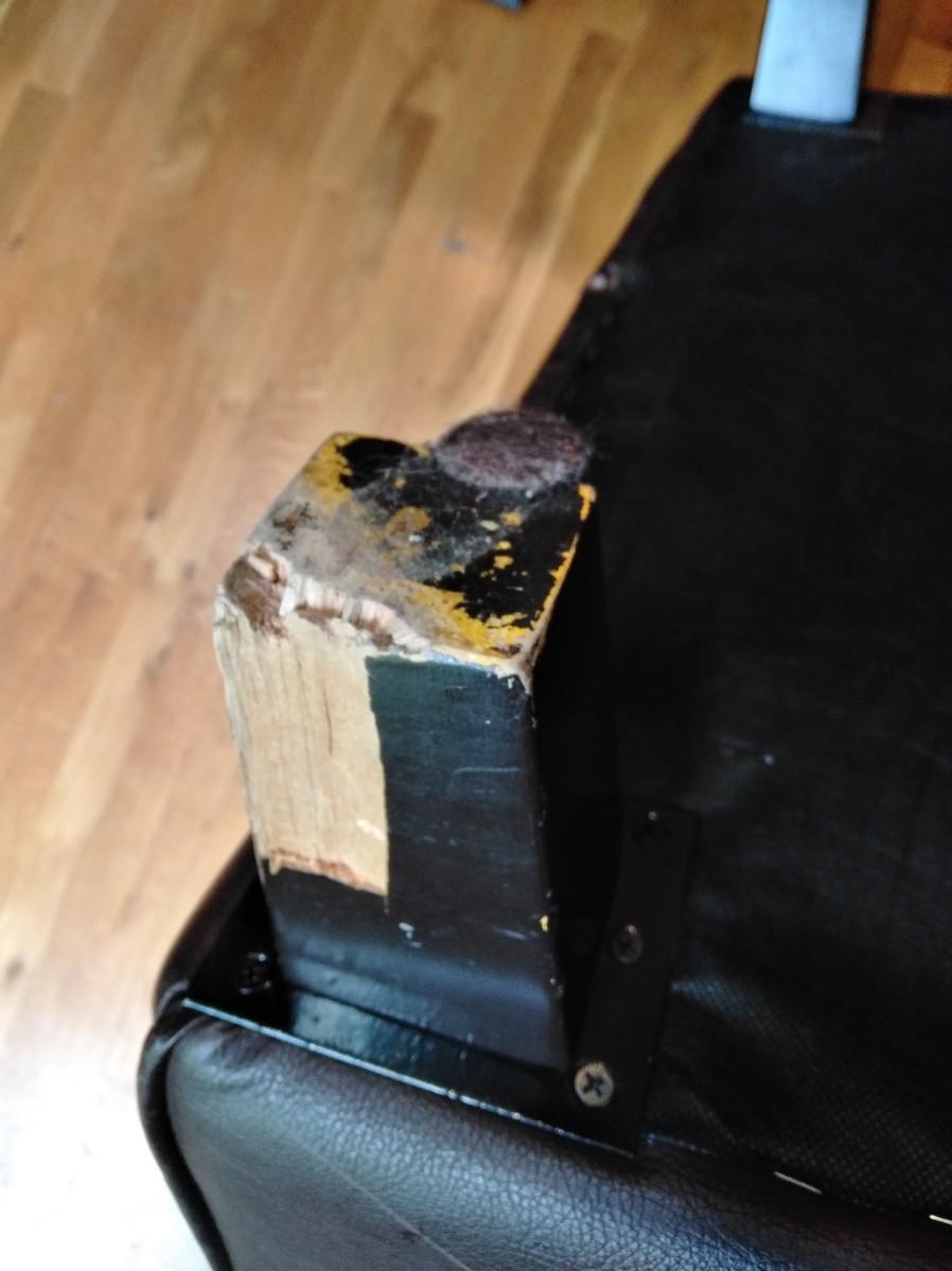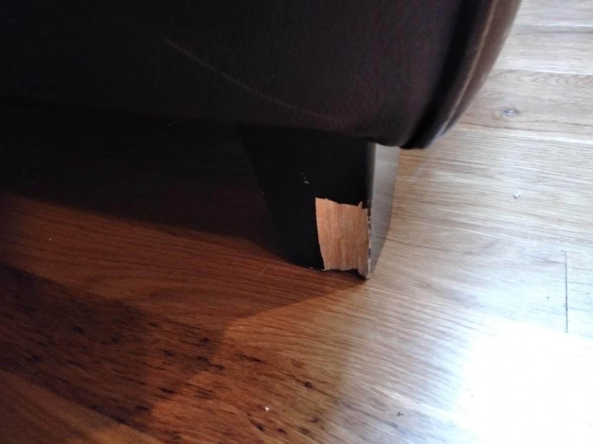 NICE BROWN PLEATHER CHAIR WITH BLACK FLOOR LAMP. CHAIR HAS SCRATCHES AND A CHIP OUT OF THE LEG AS SHOWN.