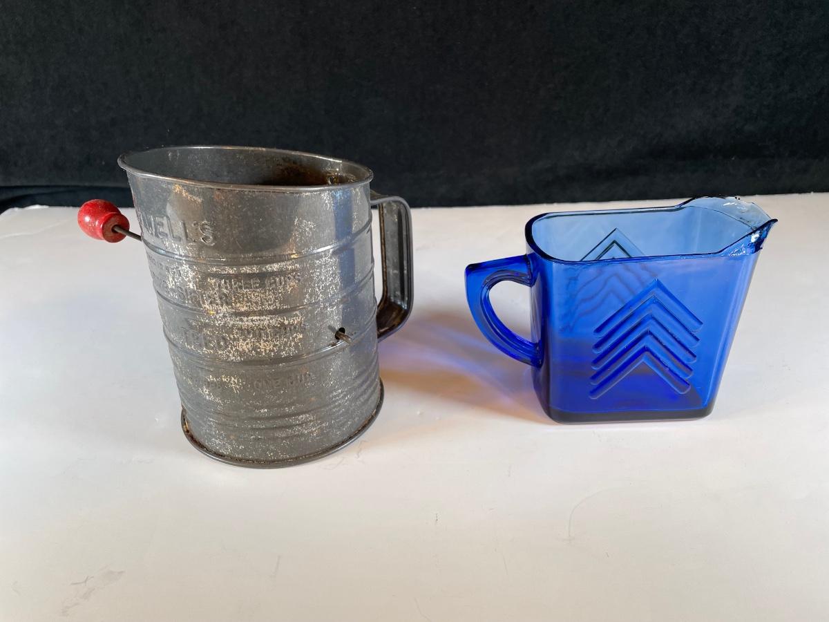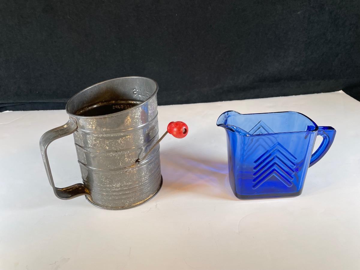 Antique cobalt bleu glass milk pitcher and antique sifter in good condition