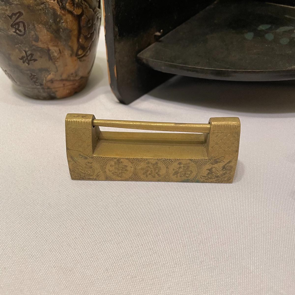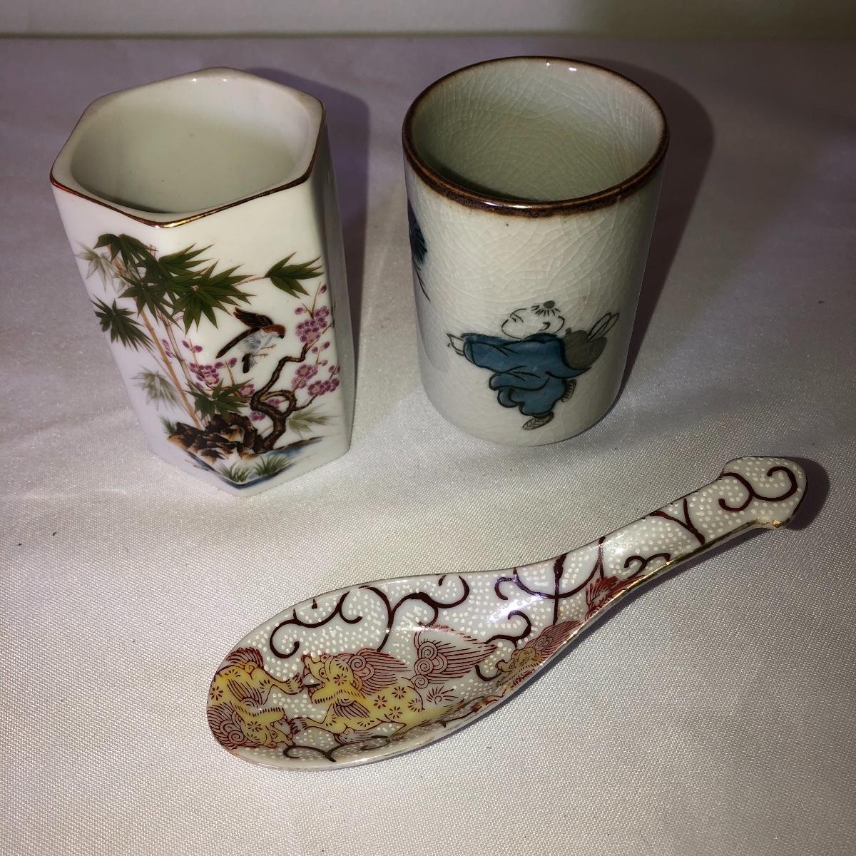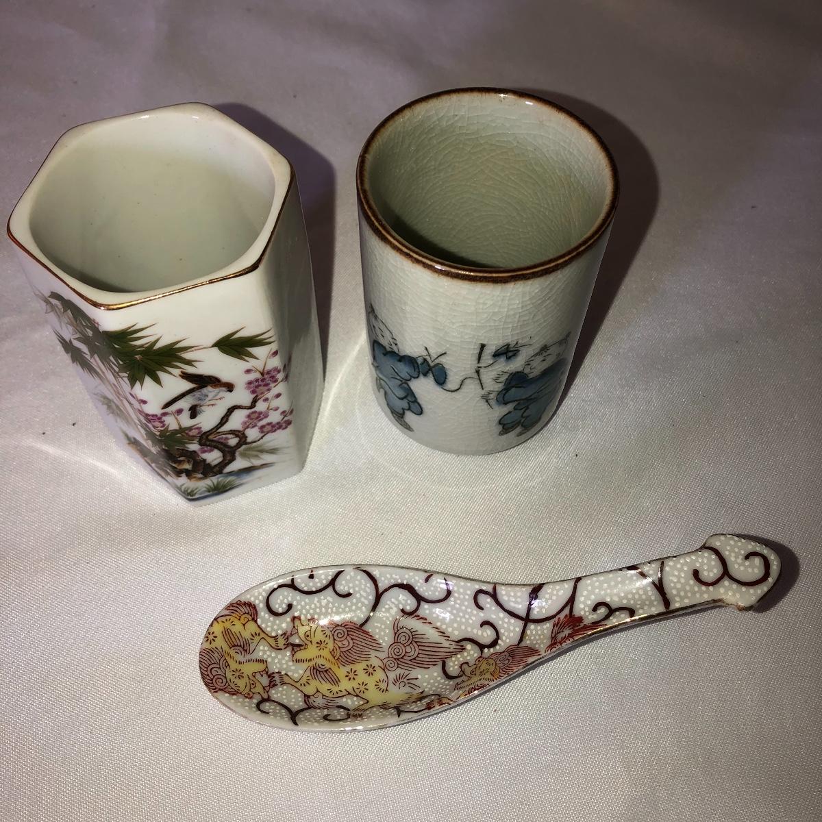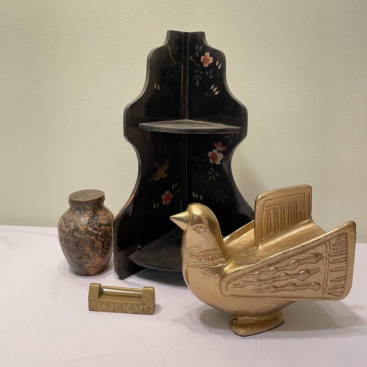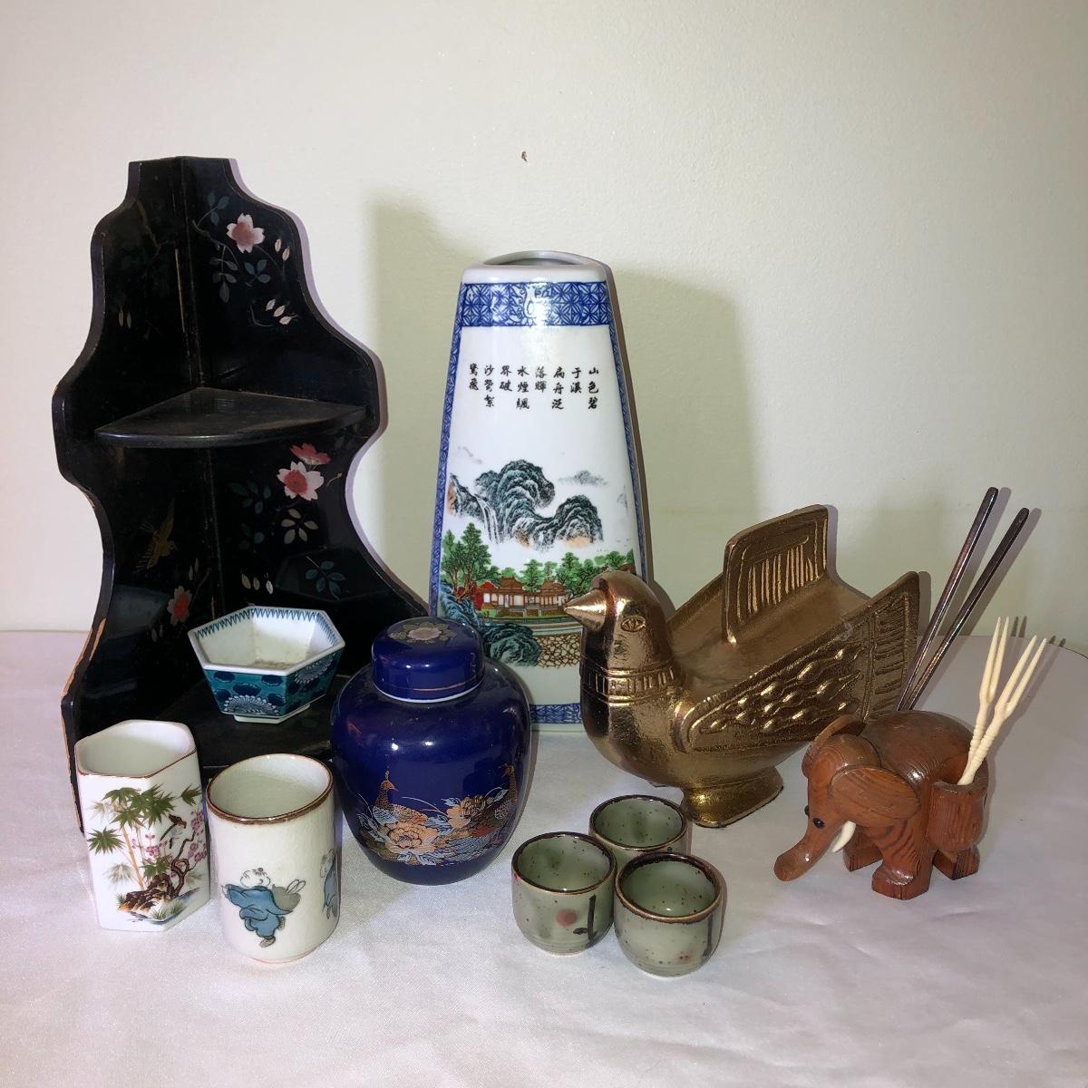 Collection of Asian-inspired ceramics and decor. Some of those items include a vase, dishes, and sake cups. A few other various items like a hair piece, a 13” tall corner shelf, a stone, probably marble urn with carvings and copper lid. Lot also features a fascinating ornate brass lock without a key and a golden metal bird statue are also included.