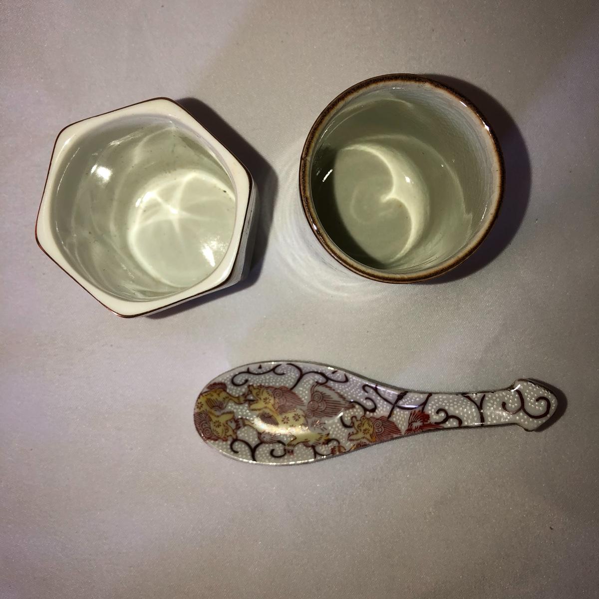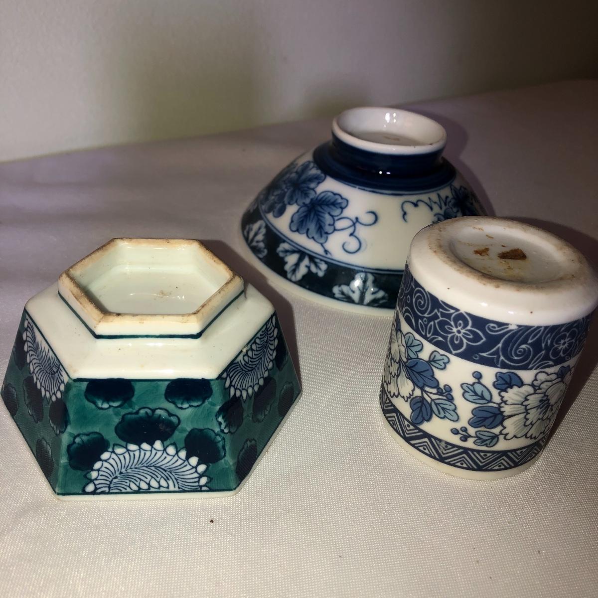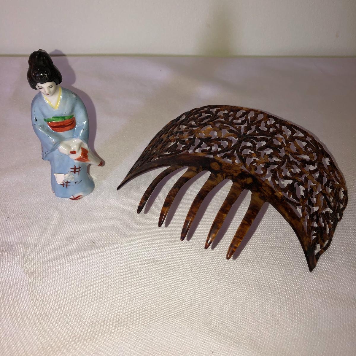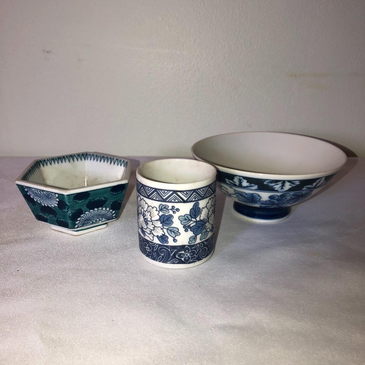 Collection of Asian-inspired ceramics and decor. Some of those items include a vase, dishes, and sake cups. A few other various items like a hair piece, a 13” tall corner shelf, a stone, probably marble urn with carvings and copper lid. Lot also features a fascinating ornate brass lock without a key and a golden metal bird statue are also included.