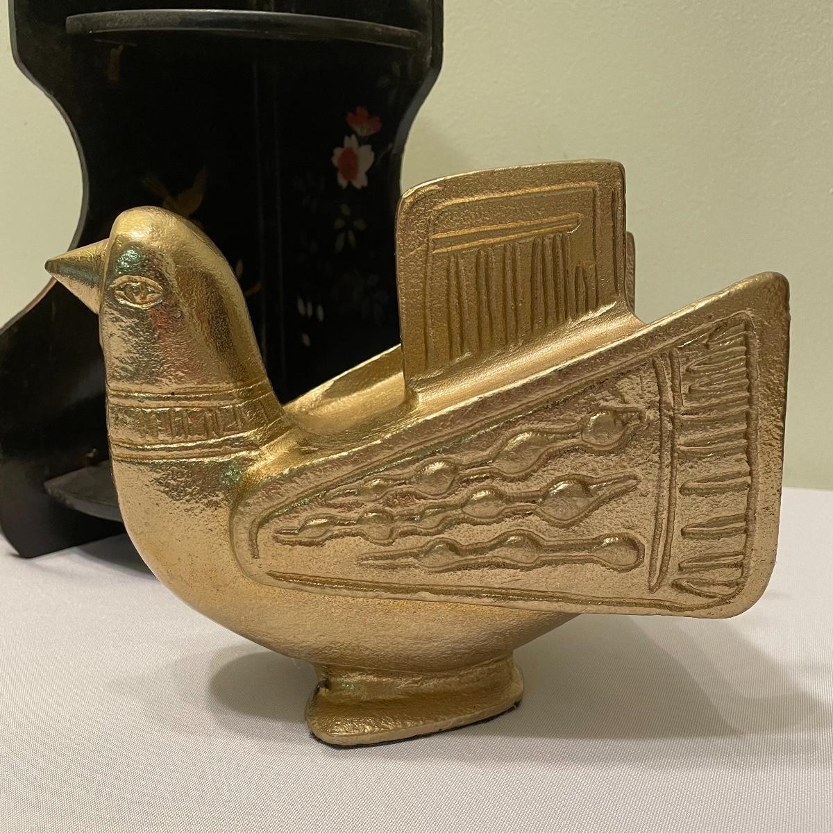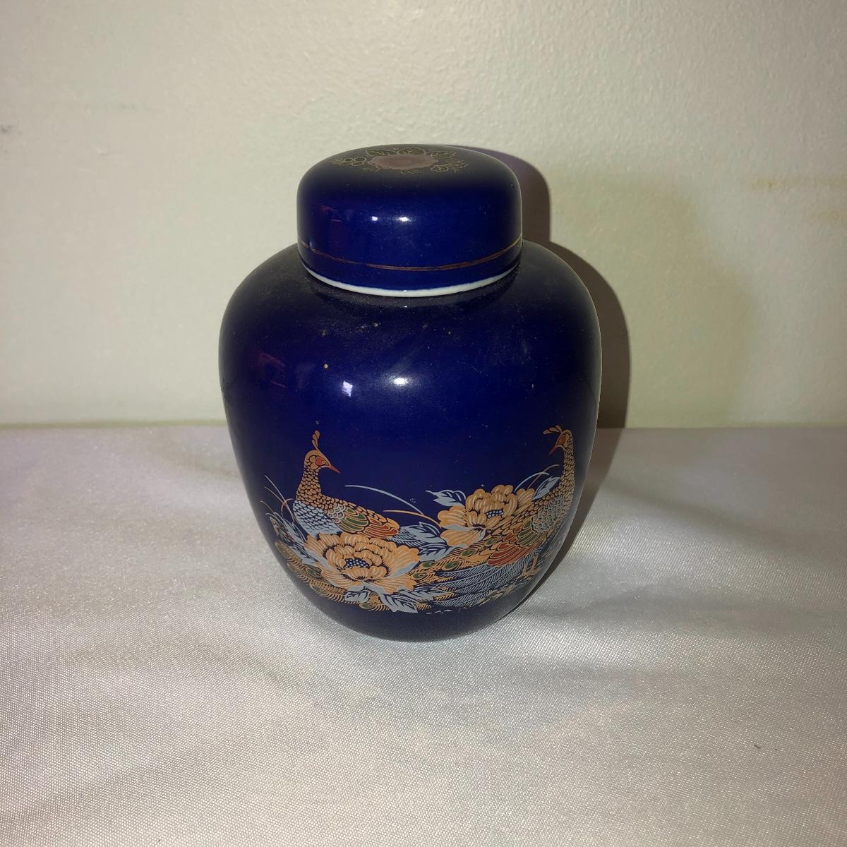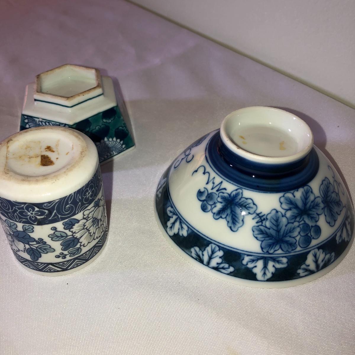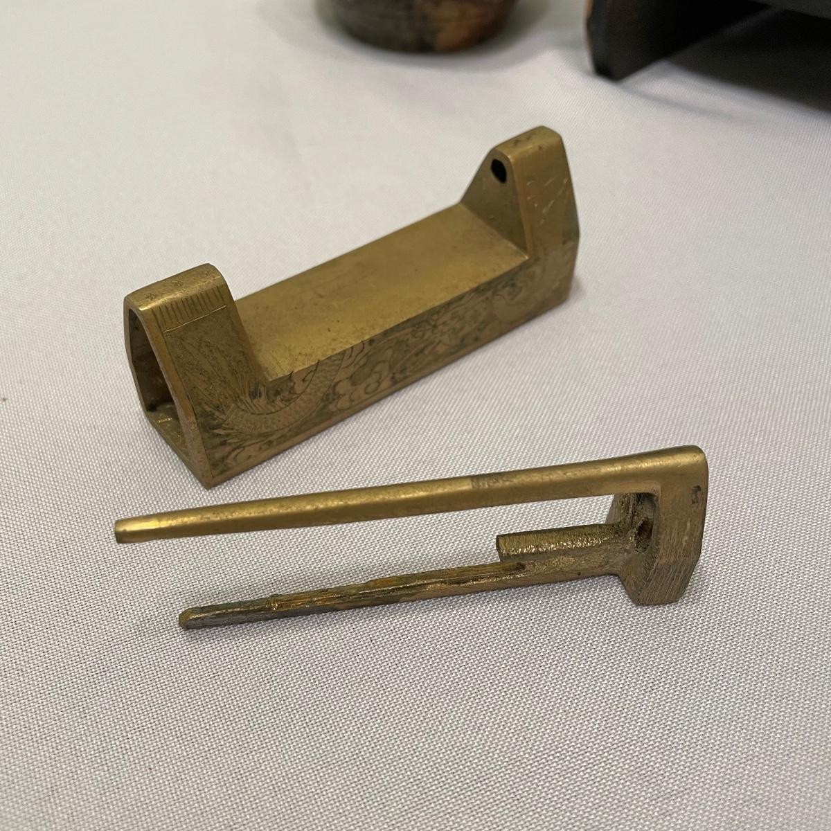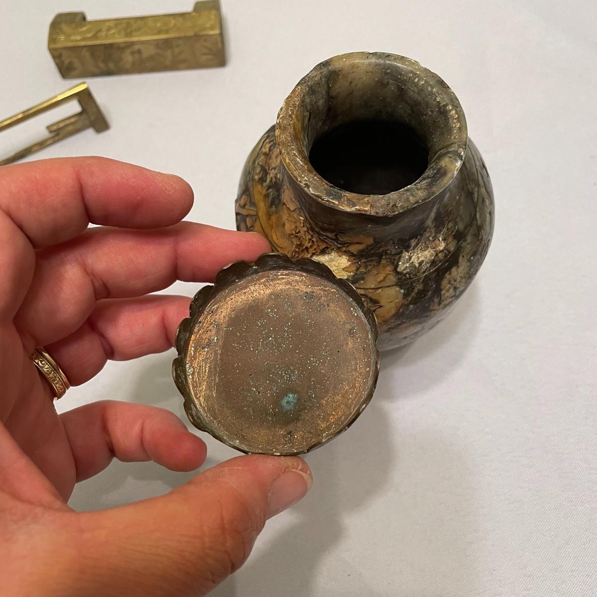 Collection of Asian-inspired ceramics and decor. Some of those items include a vase, dishes, and sake cups. A few other various items like a hair piece, a 13” tall corner shelf, a stone, probably marble urn with carvings and copper lid. Lot also features a fascinating ornate brass lock without a key and a golden metal bird statue are also included.