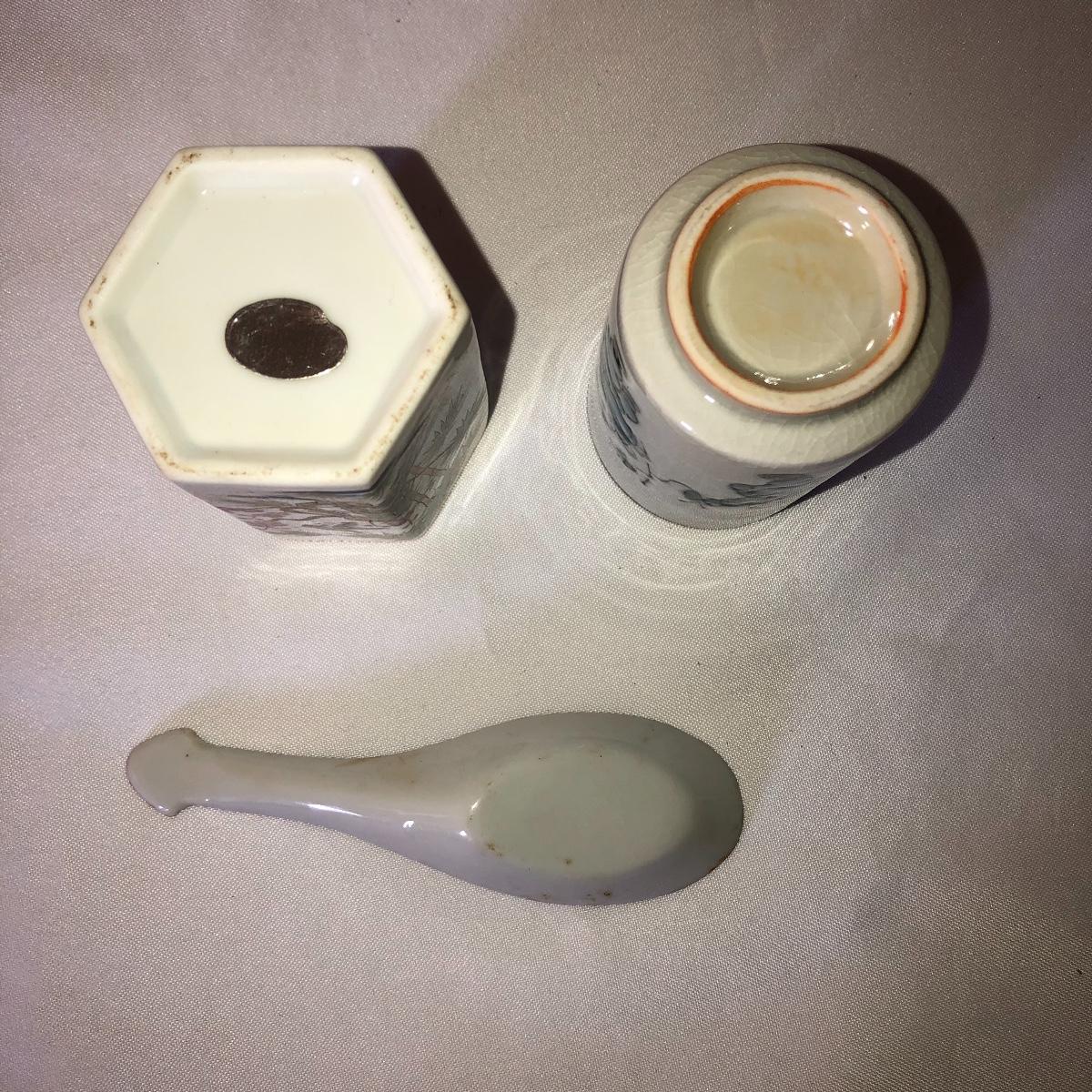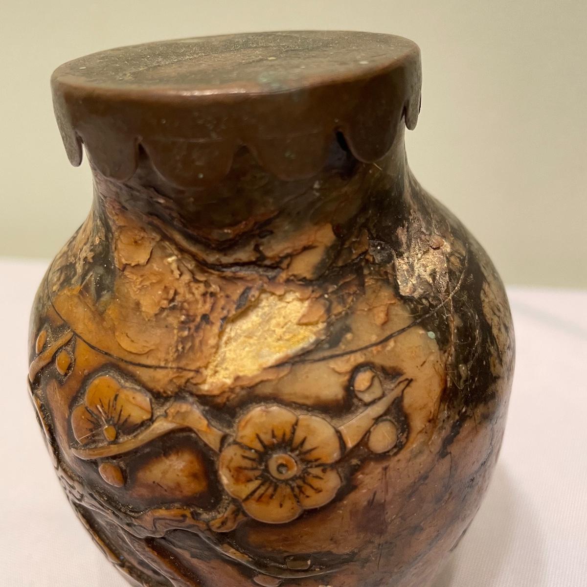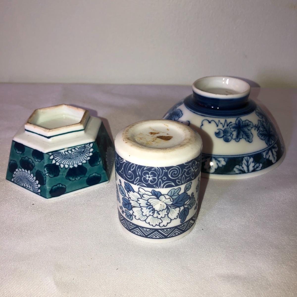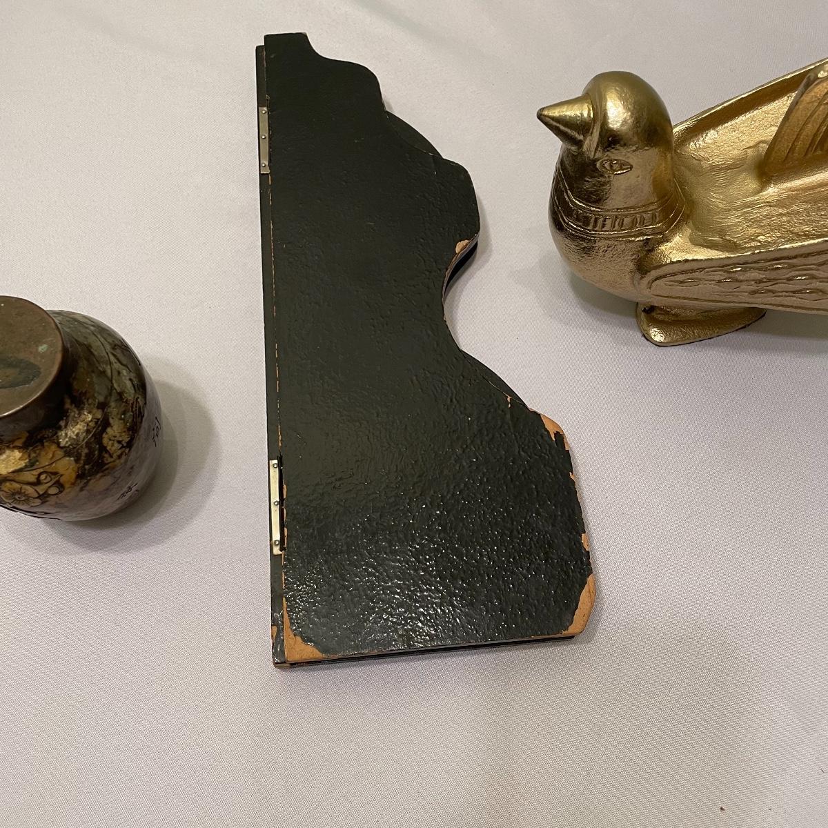 Collection of Asian-inspired ceramics and decor. Some of those items include a vase, dishes, and sake cups. A few other various items like a hair piece, a 13” tall corner shelf, a stone, probably marble urn with carvings and copper lid. Lot also features a fascinating ornate brass lock without a key and a golden metal bird statue are also included.