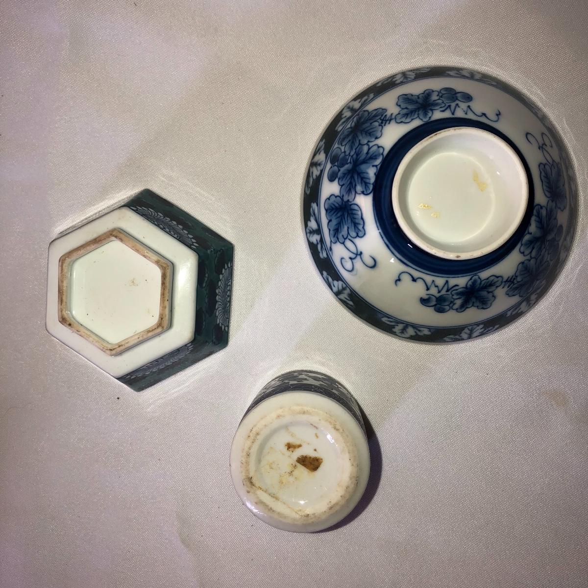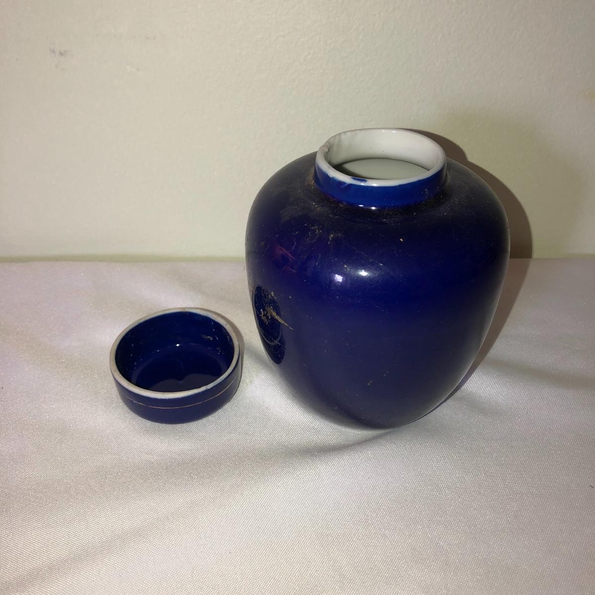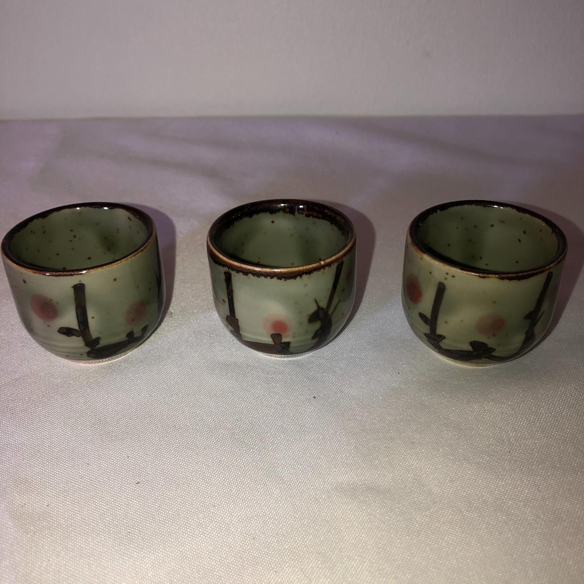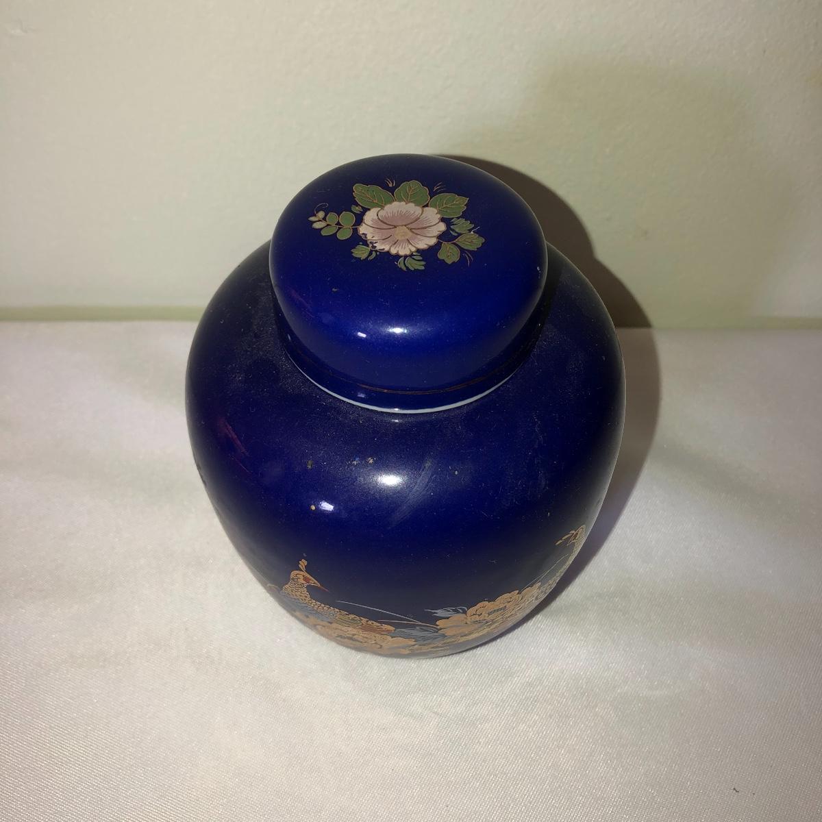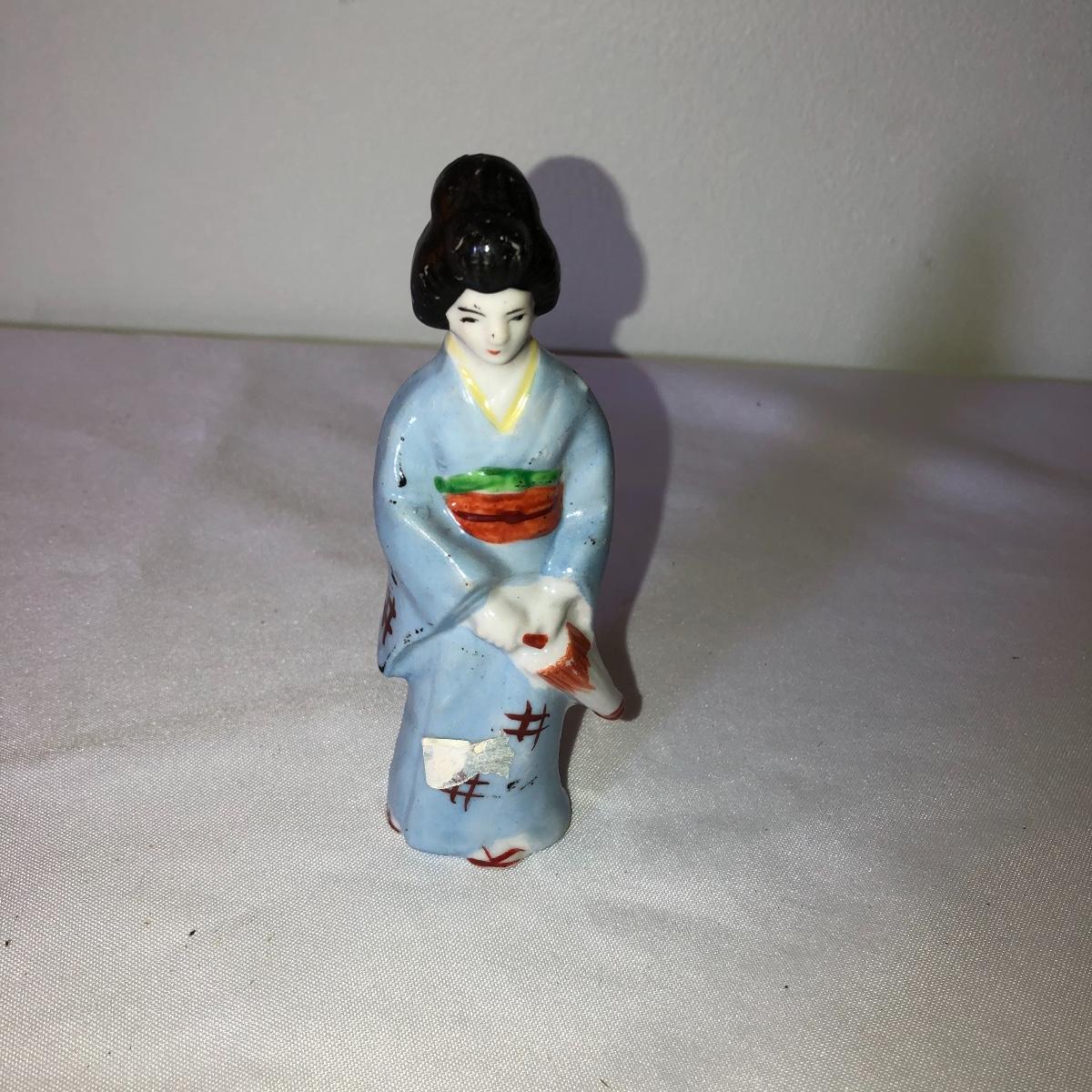 Collection of Asian-inspired ceramics and decor. Some of those items include a vase, dishes, and sake cups. A few other various items like a hair piece, a 13” tall corner shelf, a stone, probably marble urn with carvings and copper lid. Lot also features a fascinating ornate brass lock without a key and a golden metal bird statue are also included.