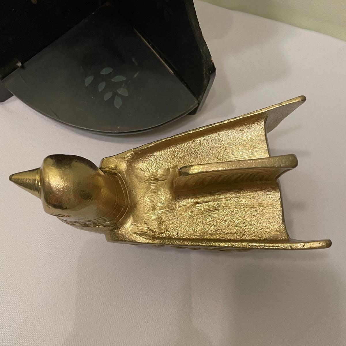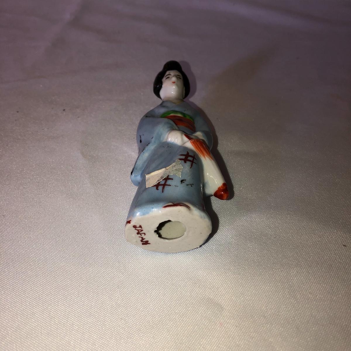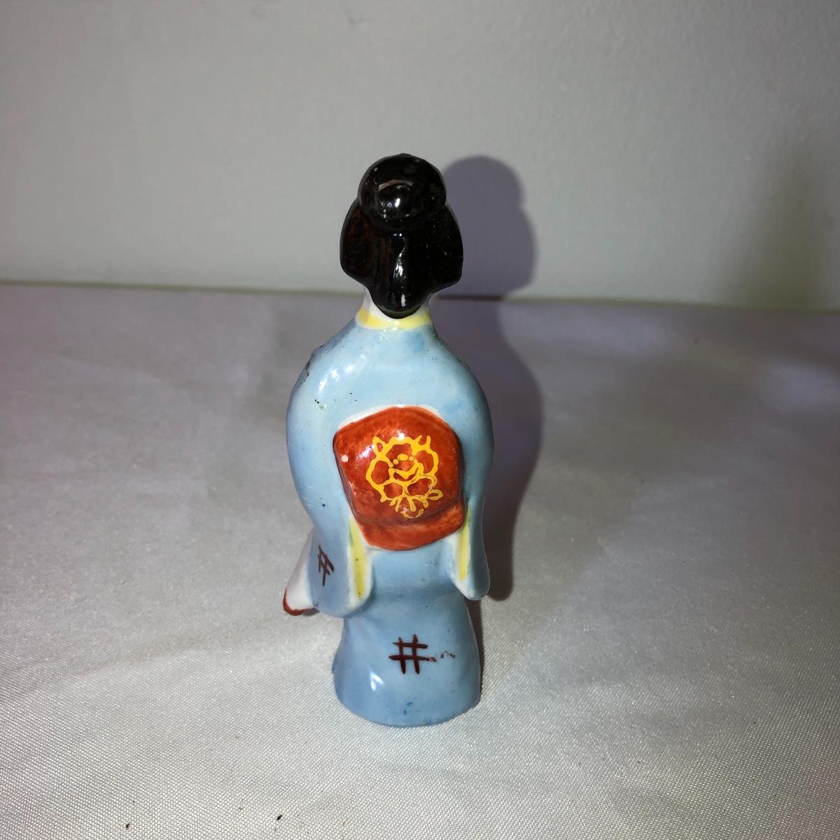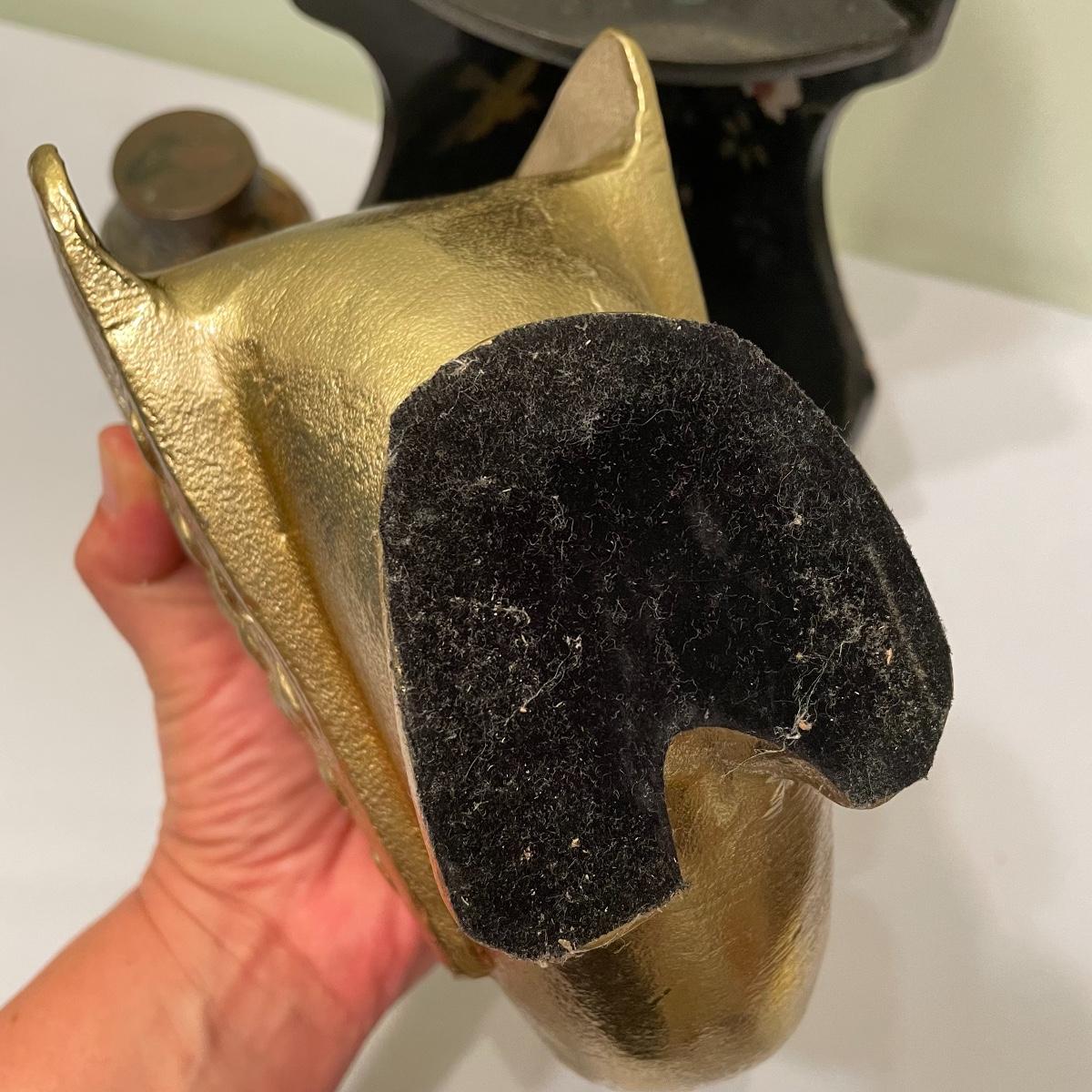 Collection of Asian-inspired ceramics and decor. Some of those items include a vase, dishes, and sake cups. A few other various items like a hair piece, a 13” tall corner shelf, a stone, probably marble urn with carvings and copper lid. Lot also features a fascinating ornate brass lock without a key and a golden metal bird statue are also included.