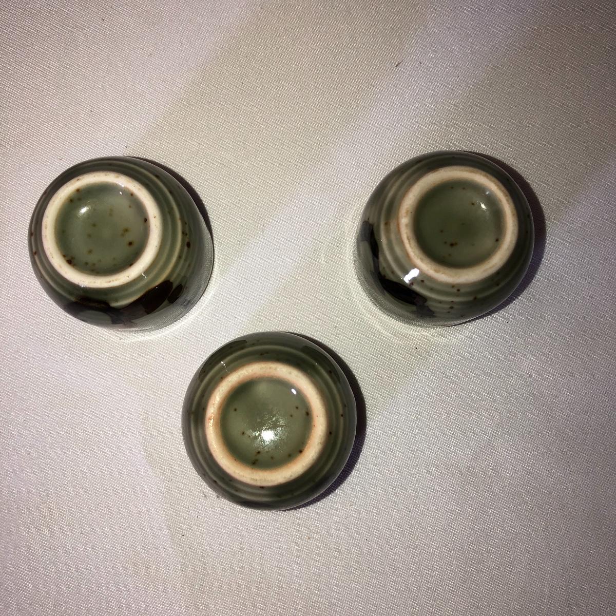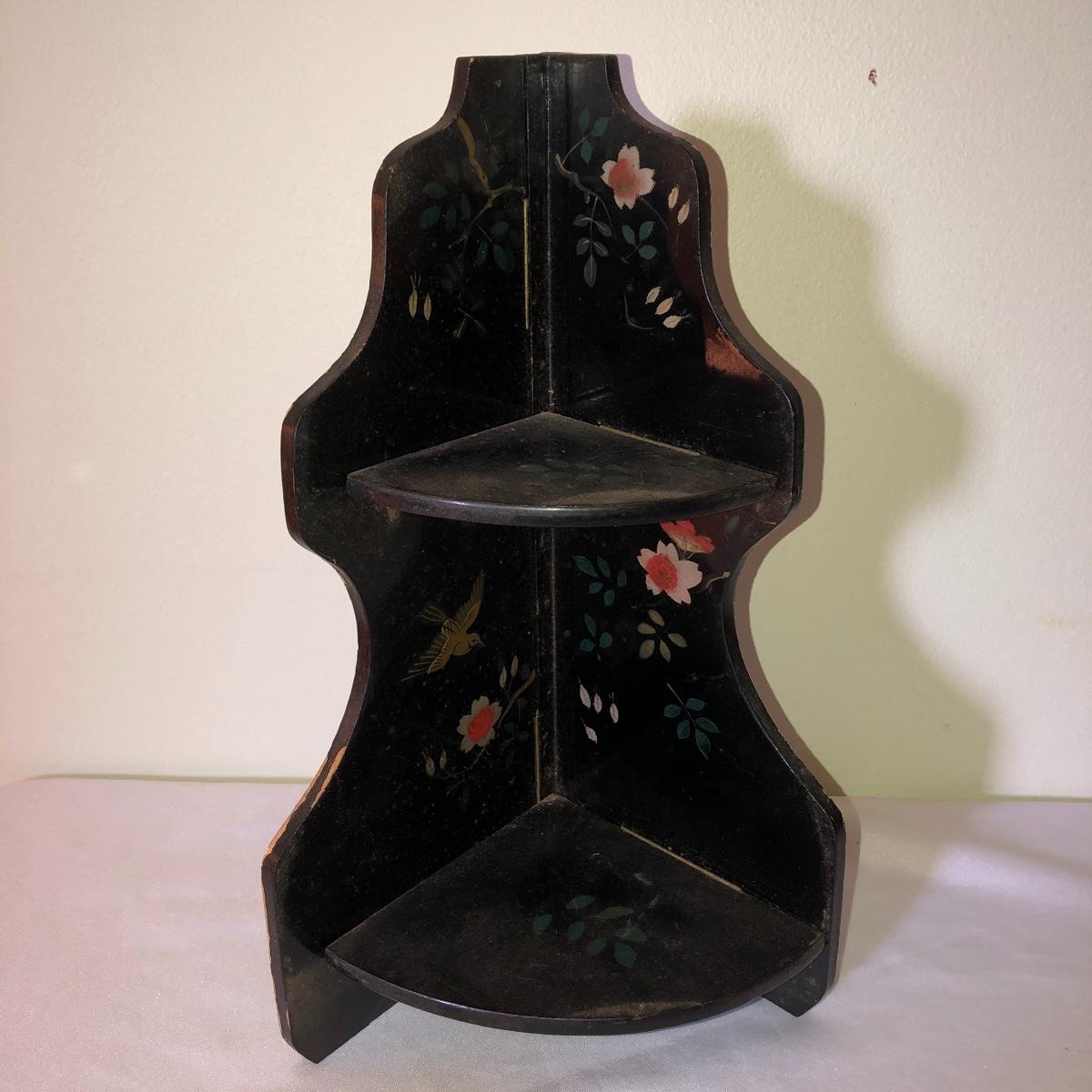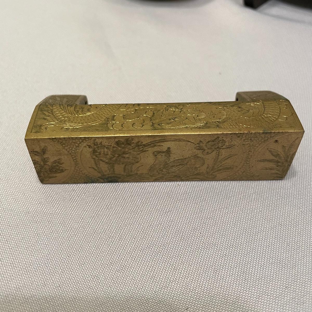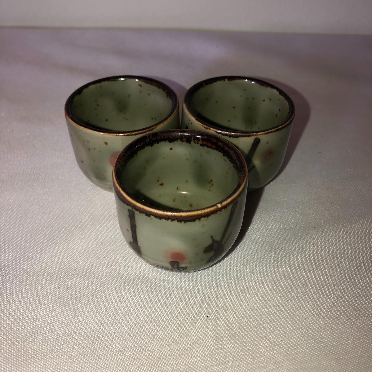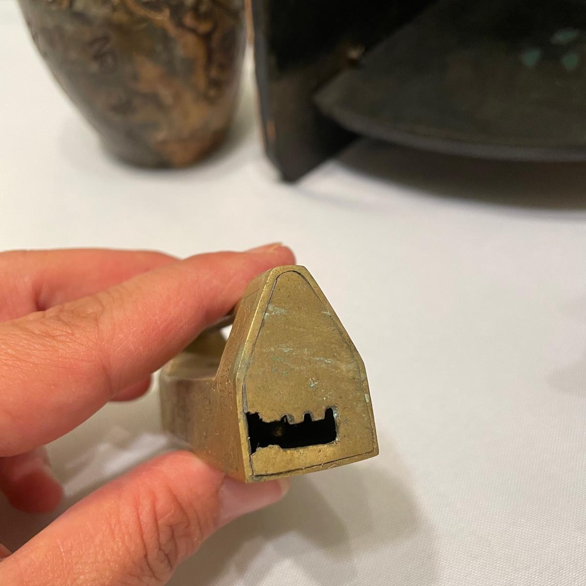 Collection of Asian-inspired ceramics and decor. Some of those items include a vase, dishes, and sake cups. A few other various items like a hair piece, a 13” tall corner shelf, a stone, probably marble urn with carvings and copper lid. Lot also features a fascinating ornate brass lock without a key and a golden metal bird statue are also included.