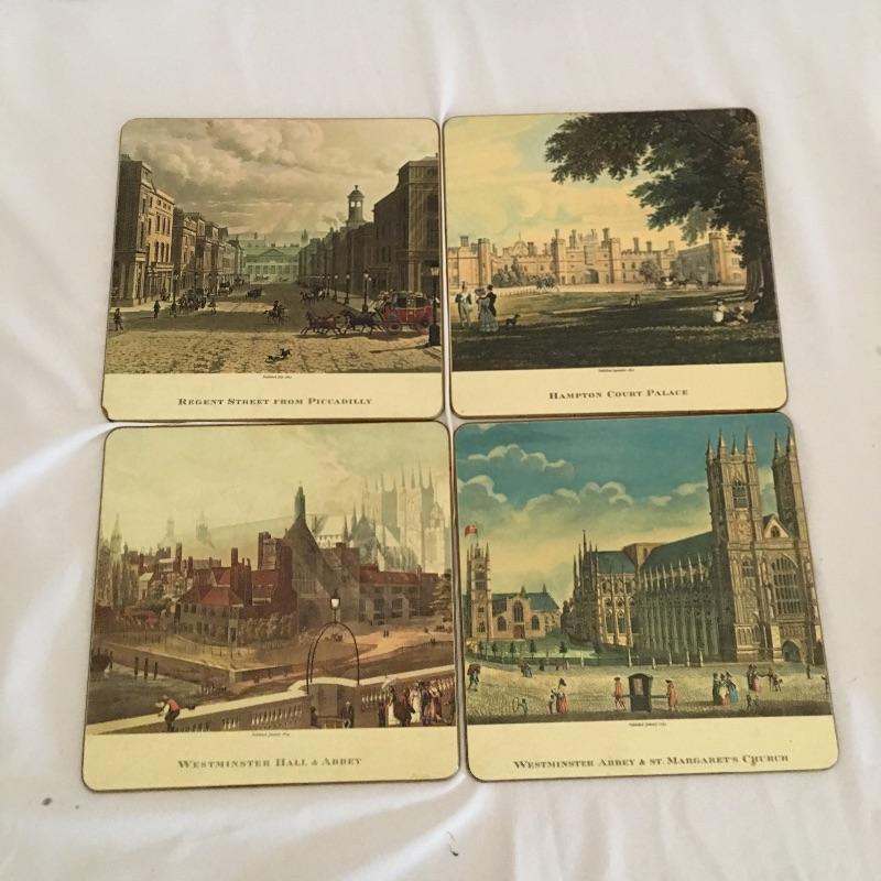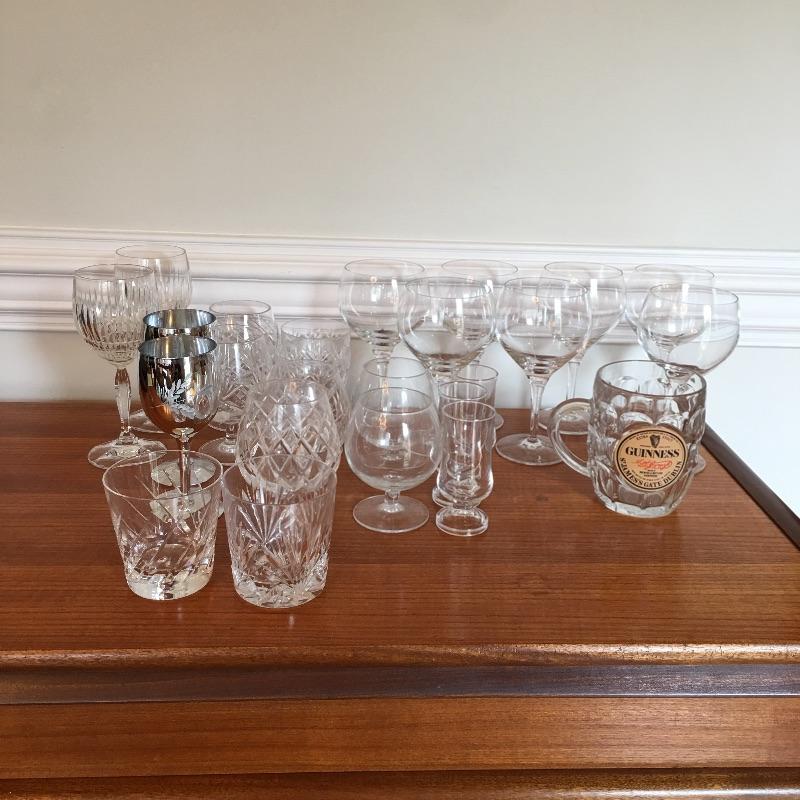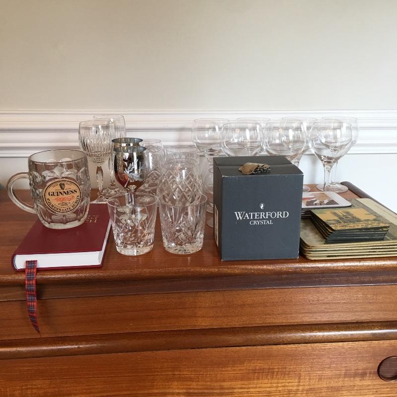 Traditional collection perfect for your home bar! Barware & placemats including glasses in many sizes and shapes. Some glassware highlights are the Guinness mug, Waterford crystal liqueur glasses. Lot also features placemats of landmarks in London, coasters, and more! See photos.