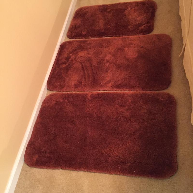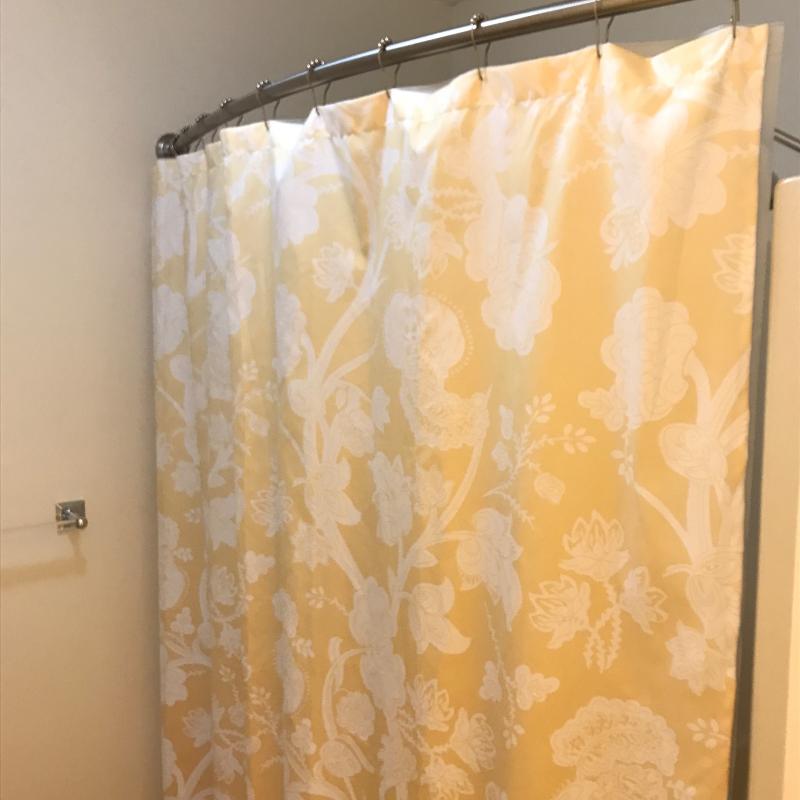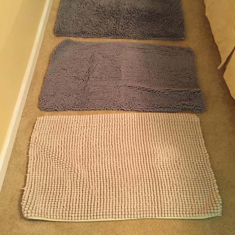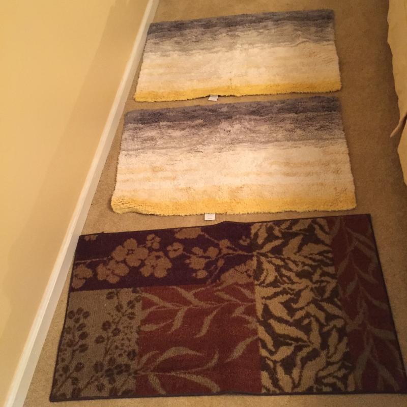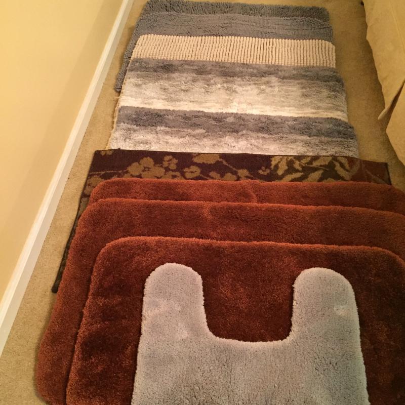 Large Assortment of Bathroom Rugs and a yellow Shower Curtain. Largest Rug Measures 40”x 23.50”. Local Pickup Only