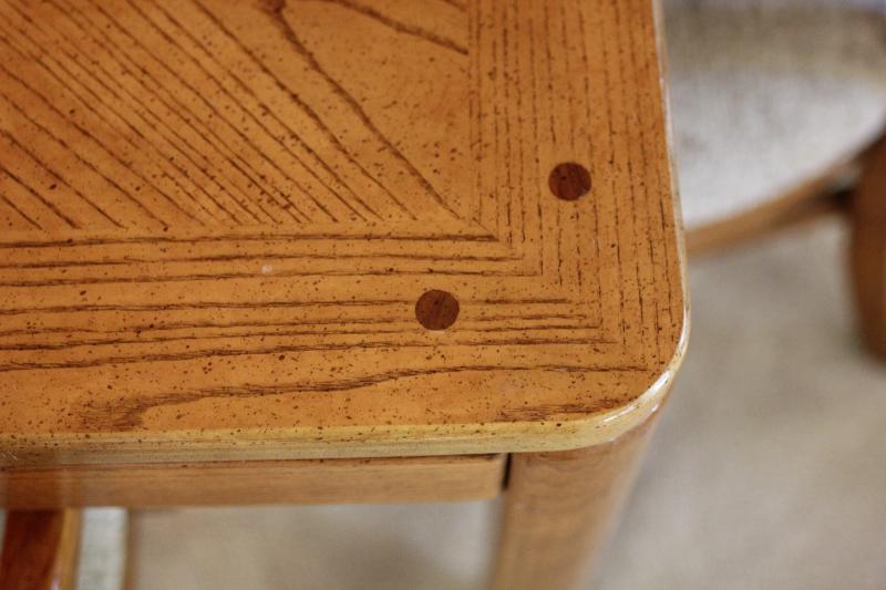 Two extra leafs, two captain chairs and 6 armless chairs.