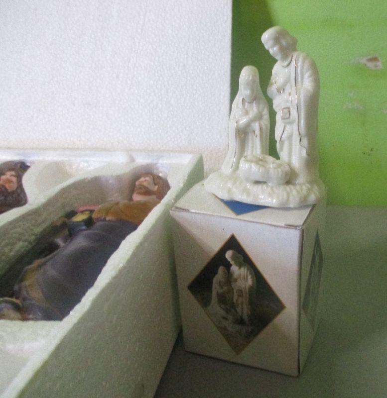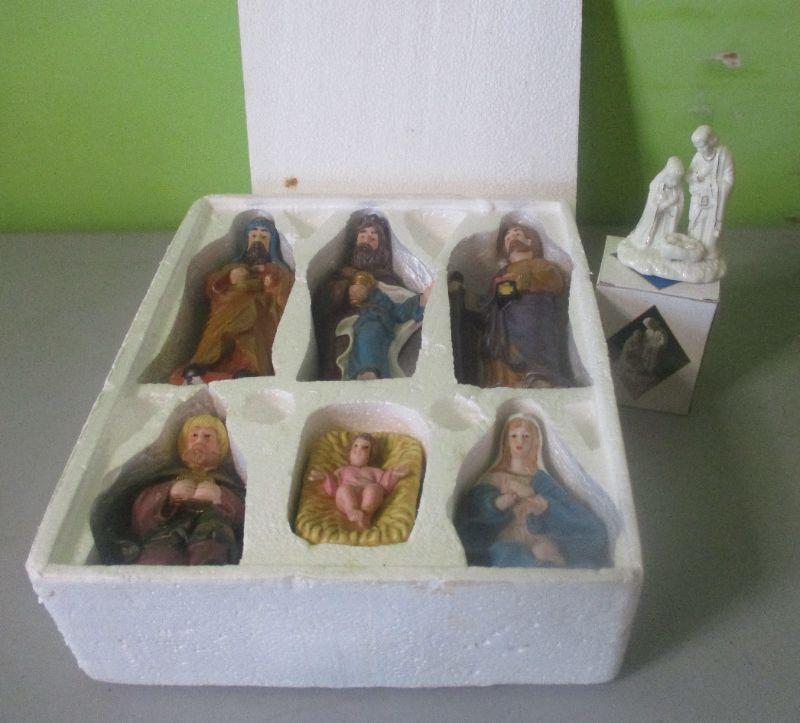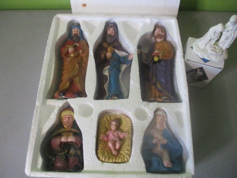 All of the pieces are ceramic and all are in excellent condition. The small white one to the side is 3.75" tall and the tallest of the other set is 8".