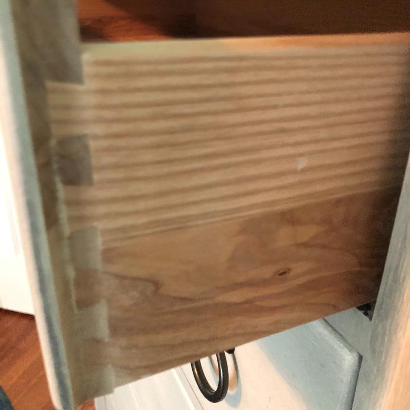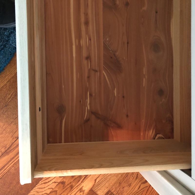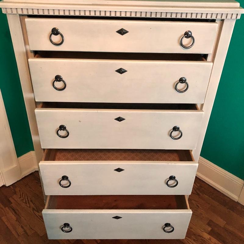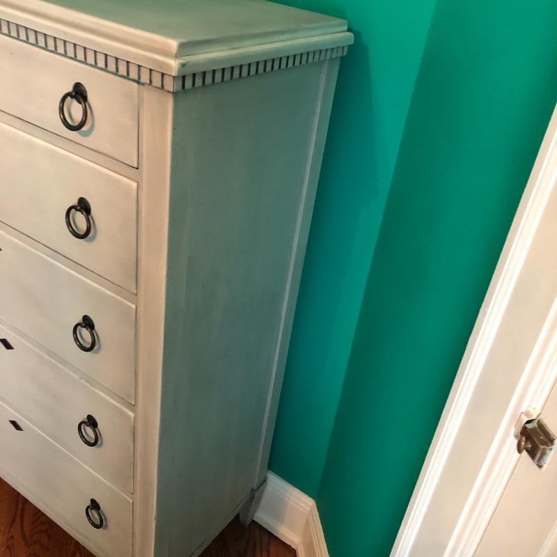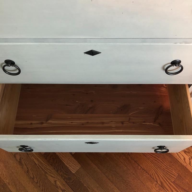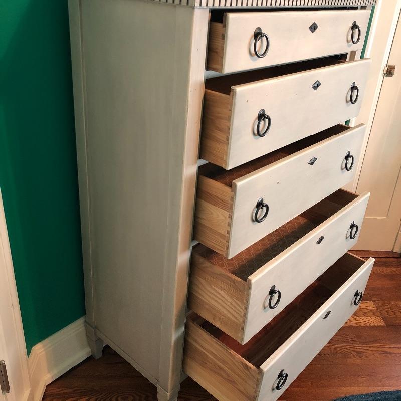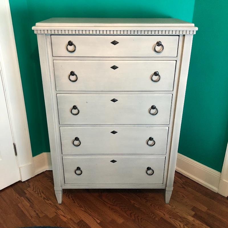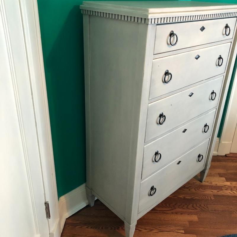 This five drawer chest of drawers is just what you have been looking for. Chest has five dovetailed drawers with the bottom drawer having a cedar bottom. Chest is in excellent shape and is grey in color.