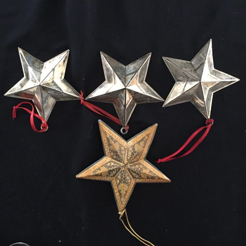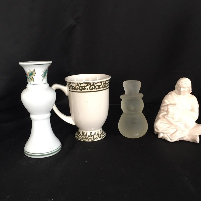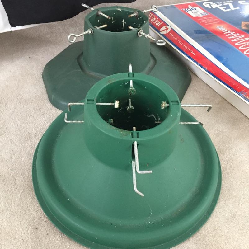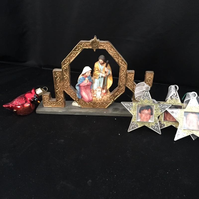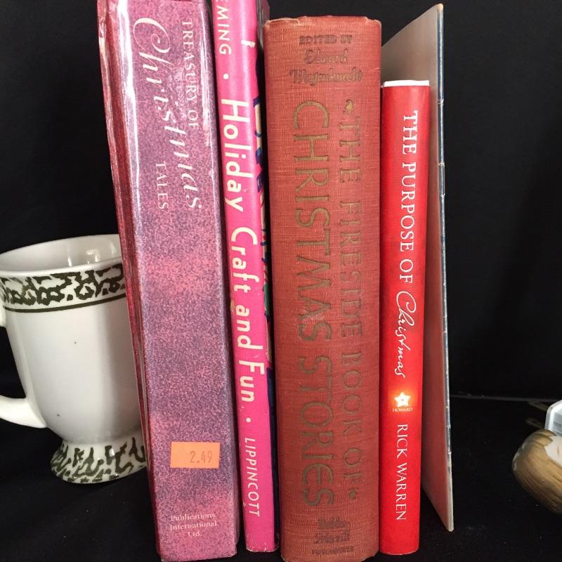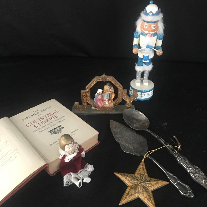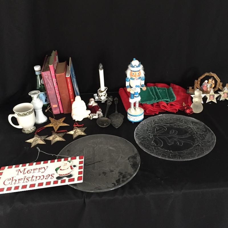 Large selection of Christmas Essentials including a pair or tree stands , two glass serving platters, Christmas books, musical nutcracker, ornaments, Silver plated serving pieces and more.