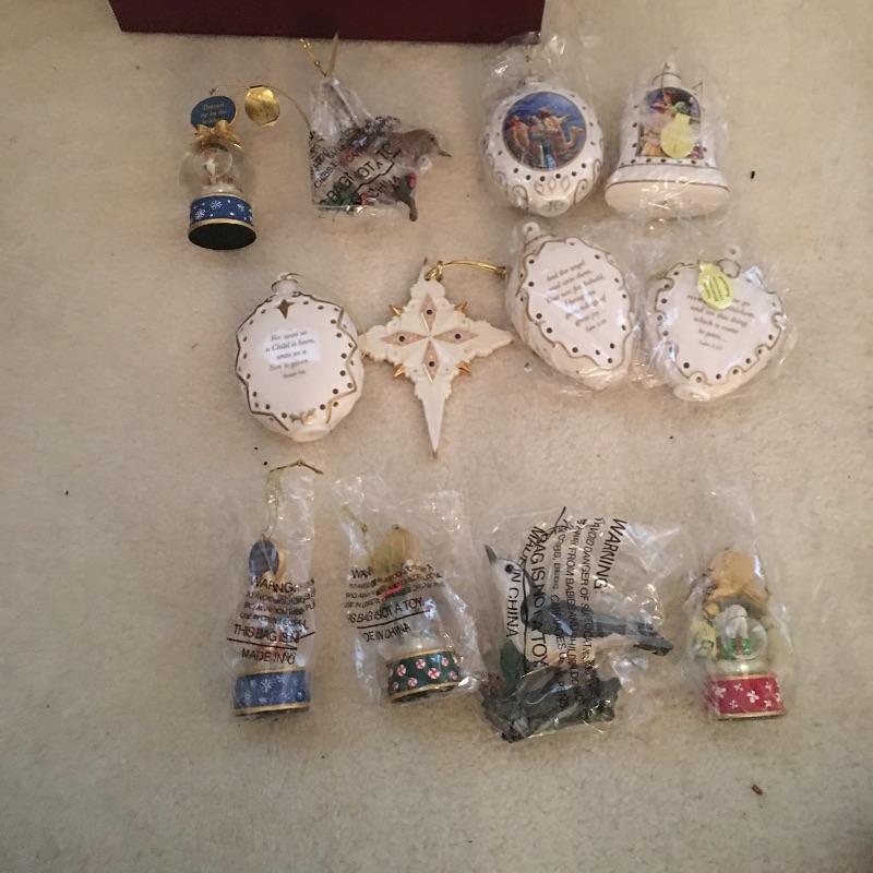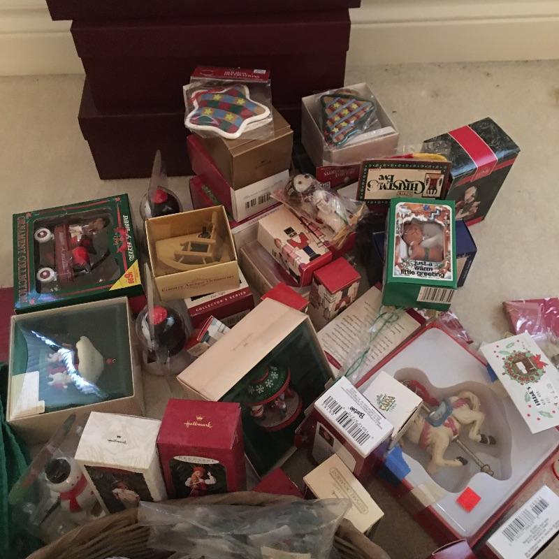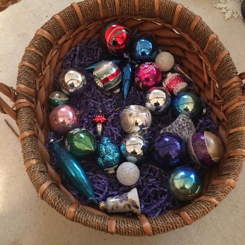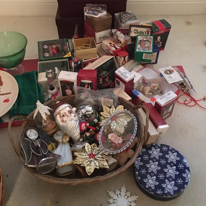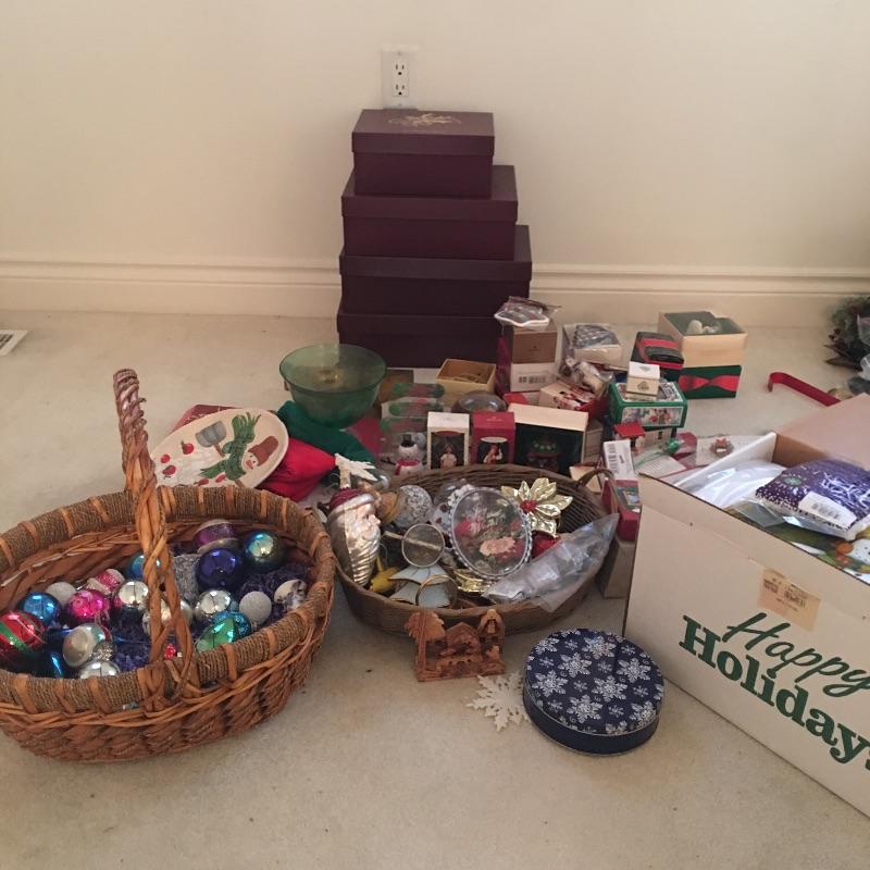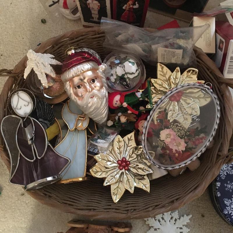 Christmas ornaments and more includes Musical snow globe, a large array of ornaments in a variety of styles, shapes and colors that include some vintage ornaments, small nativity scene, snowman plate, basket and more.