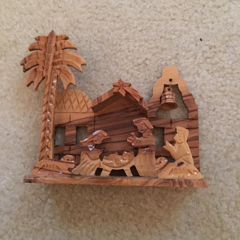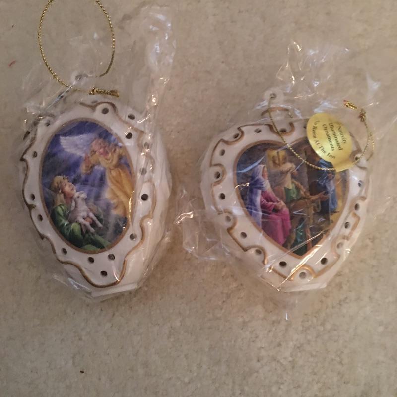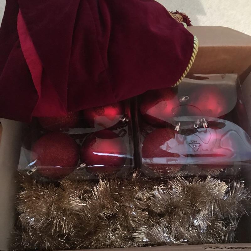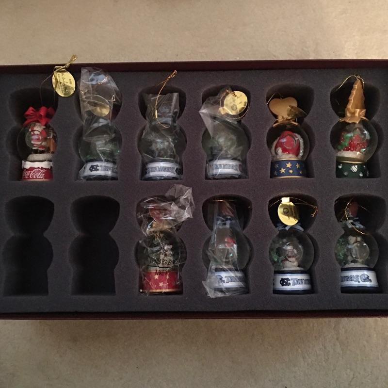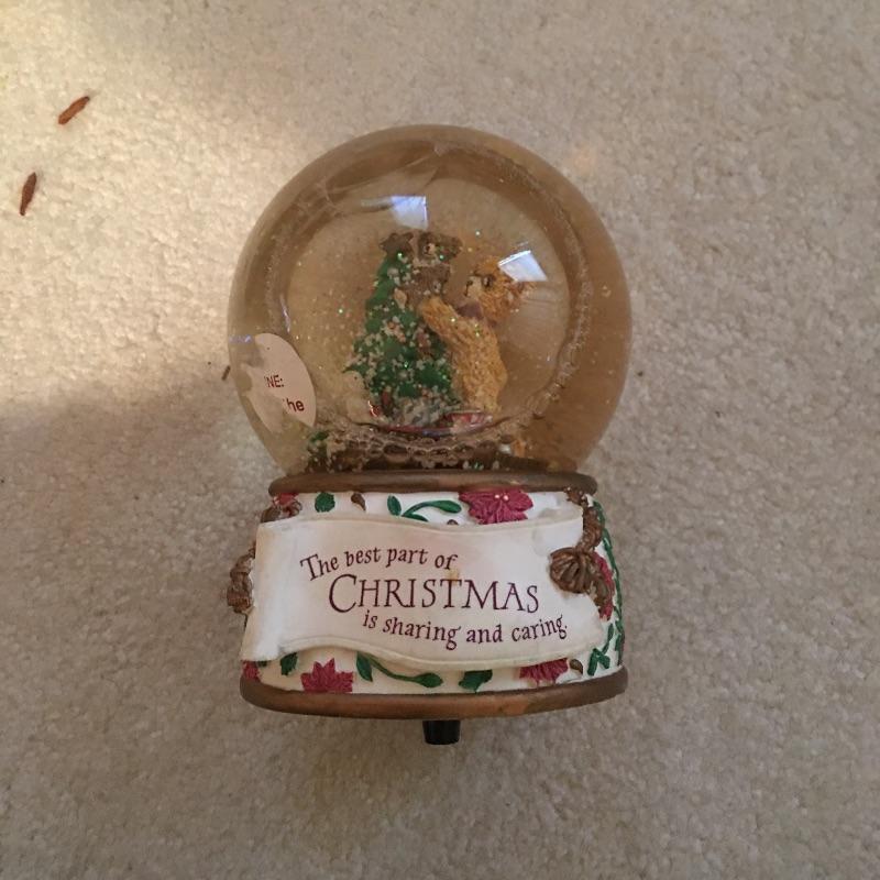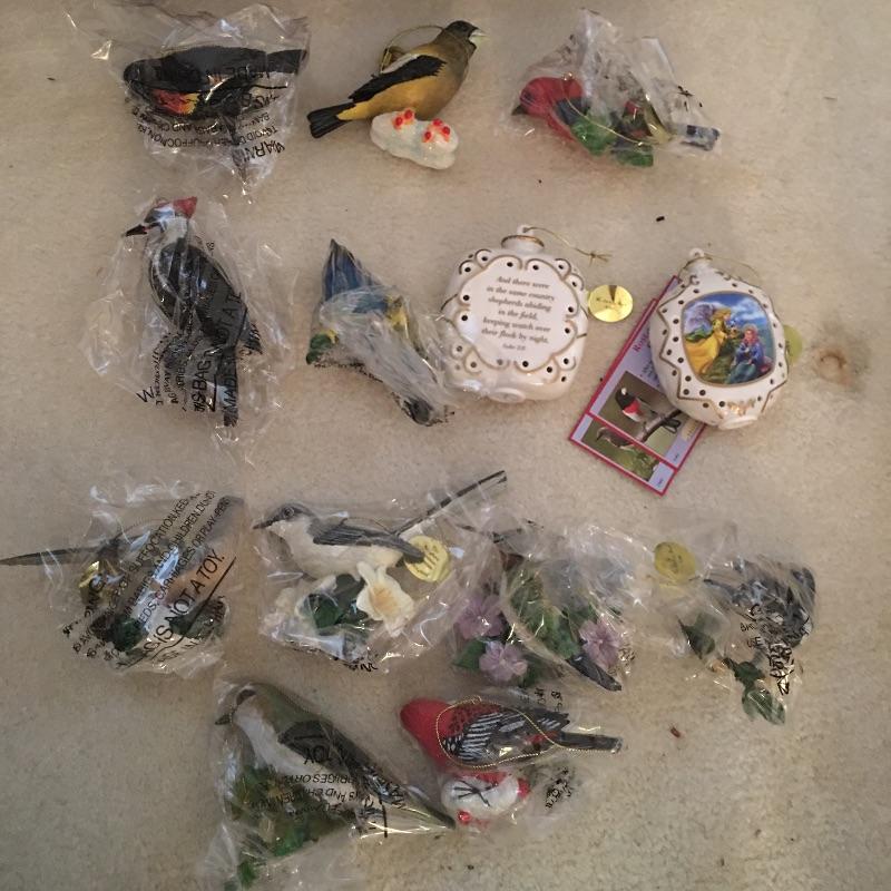 Christmas ornaments and more includes Musical snow globe, a large array of ornaments in a variety of styles, shapes and colors that include some vintage ornaments, small nativity scene, snowman plate, basket and more.