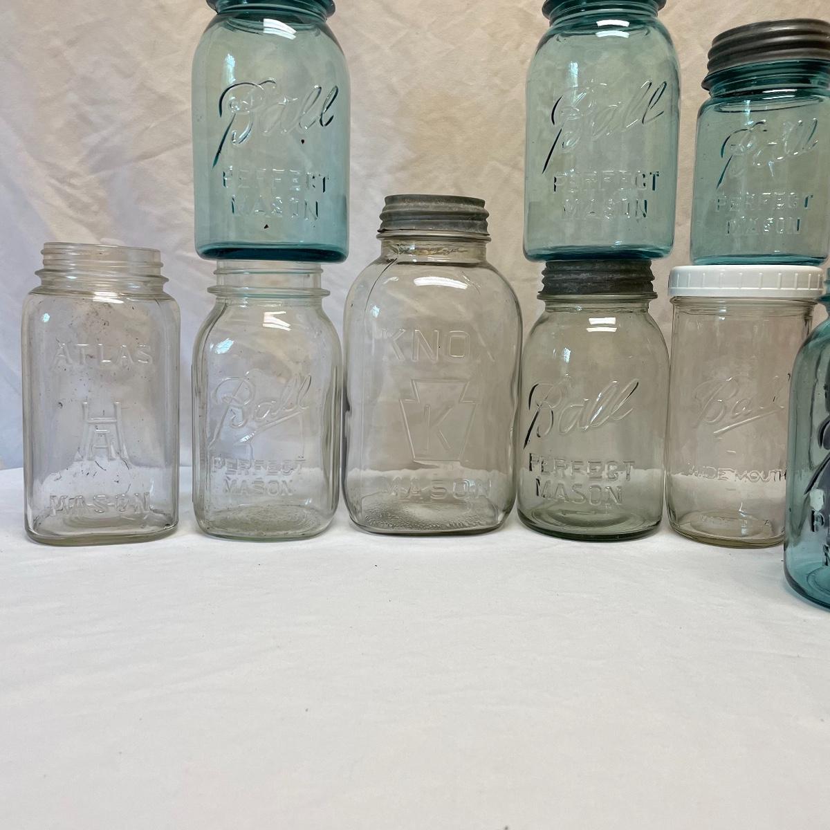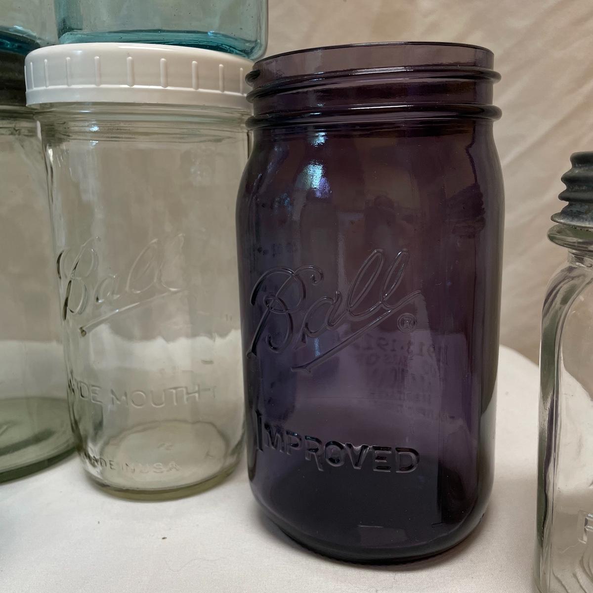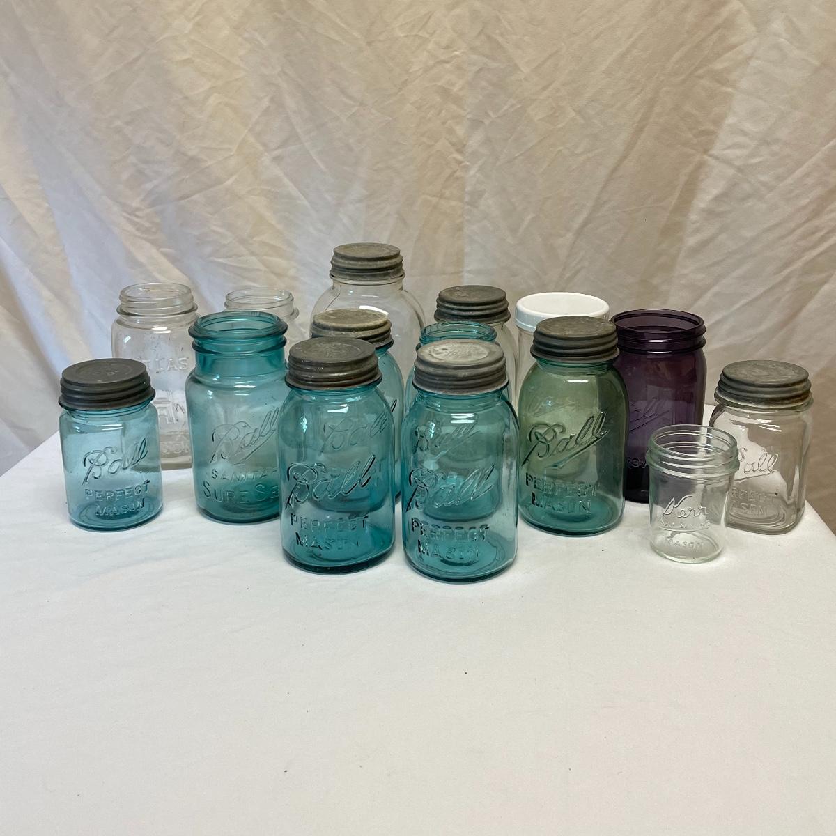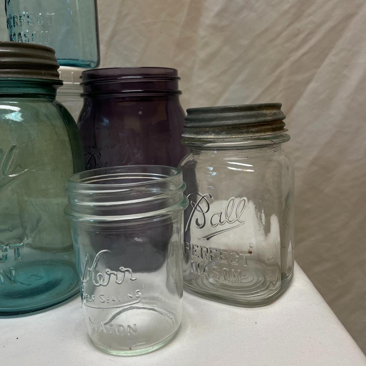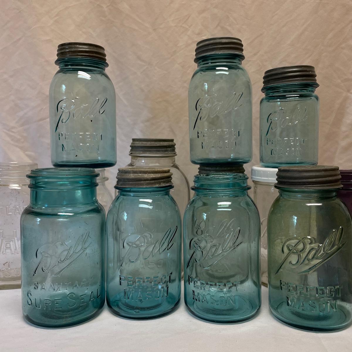 This lot includes seven collectible aqua blue Ball jars with numbers ranging from 2-13. One of the #2 jars is a wide mouth “Sanitary Sure Seal”. Other jars include Knox Mason, more Perfect Masons by Ball, a Kerr jelly jar, a decorative purple Ball and eight zinc lids. See images. Shipping available.