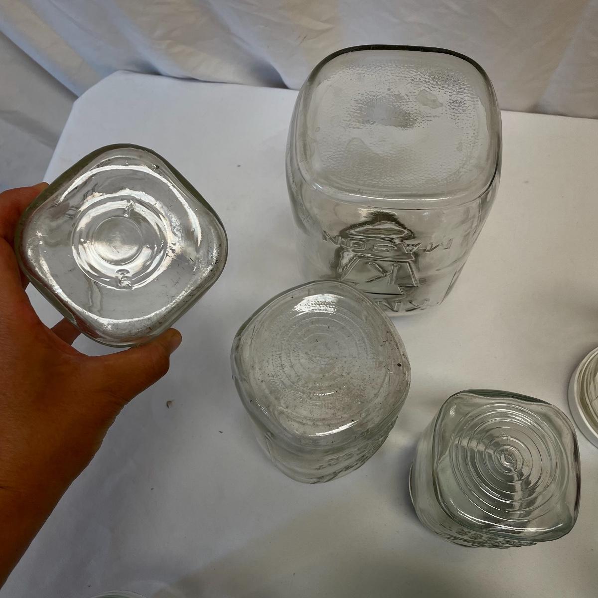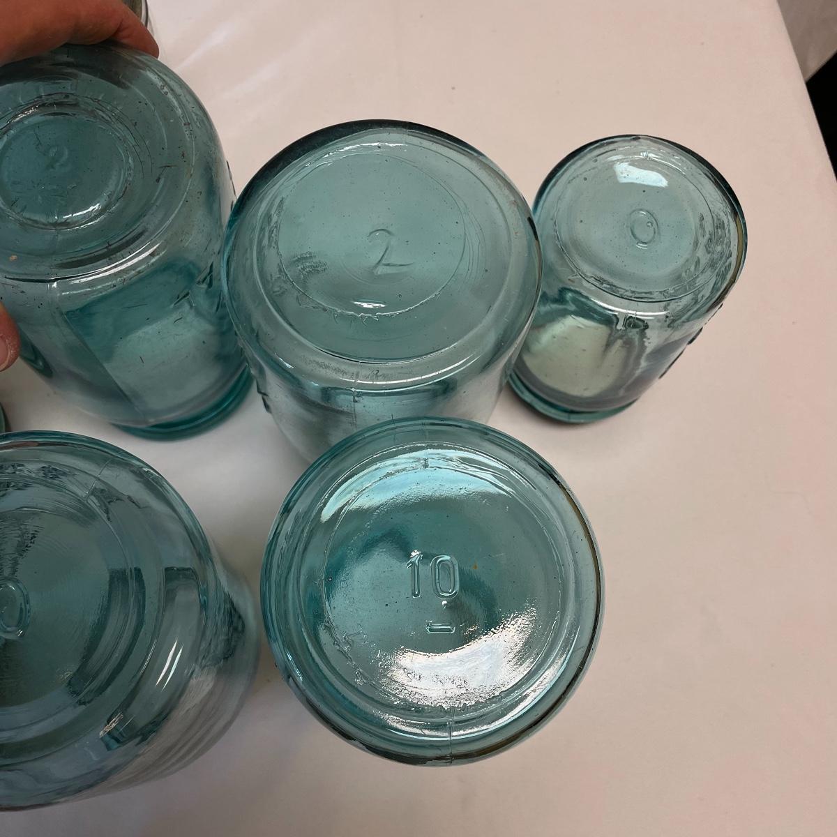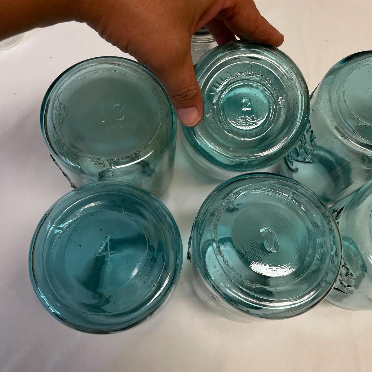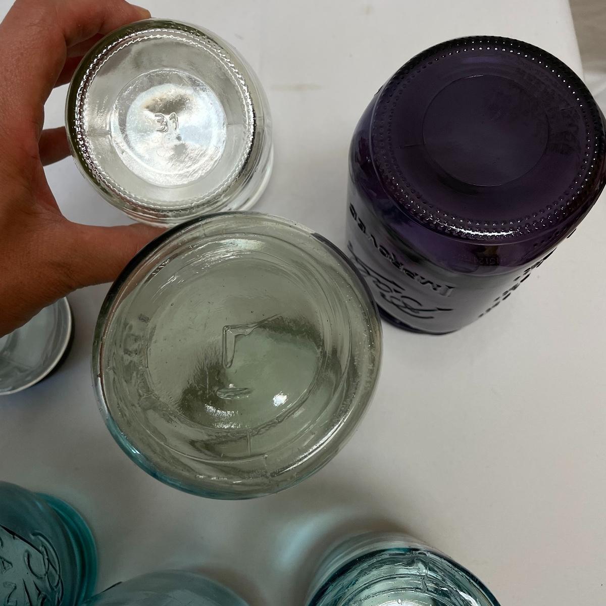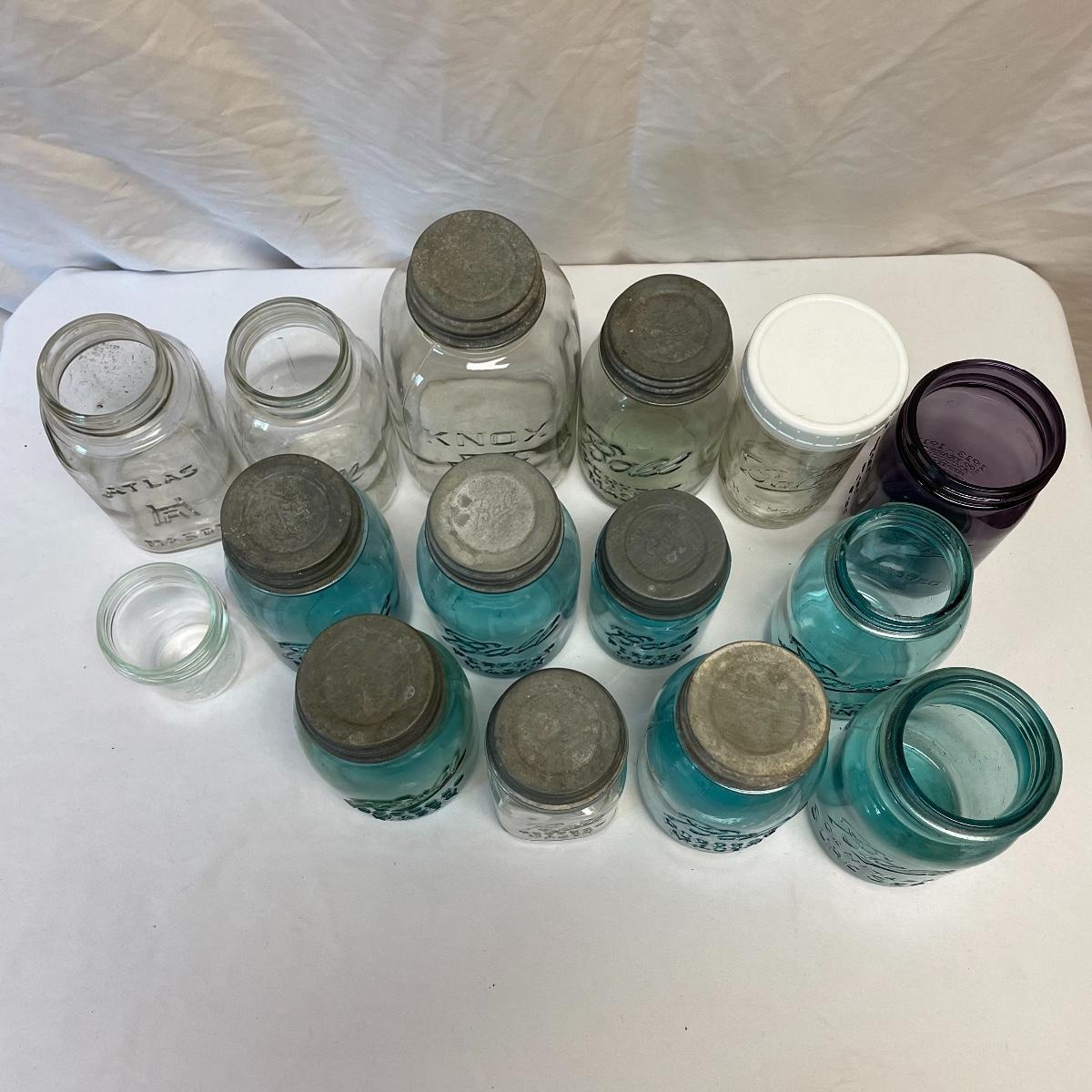 This lot includes seven collectible aqua blue Ball jars with numbers ranging from 2-13. One of the #2 jars is a wide mouth “Sanitary Sure Seal”. Other jars include Knox Mason, more Perfect Masons by Ball, a Kerr jelly jar, a decorative purple Ball and eight zinc lids. See images. Shipping available.