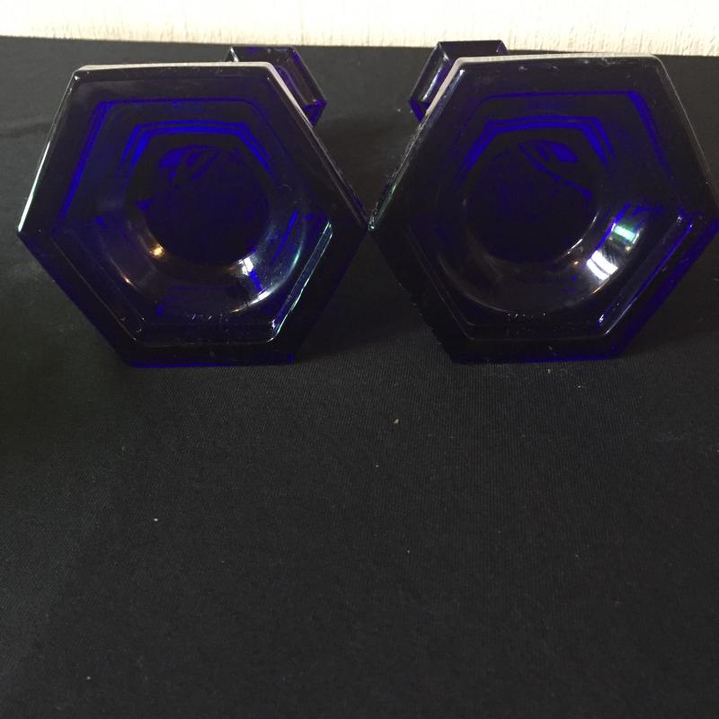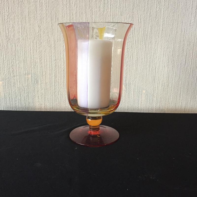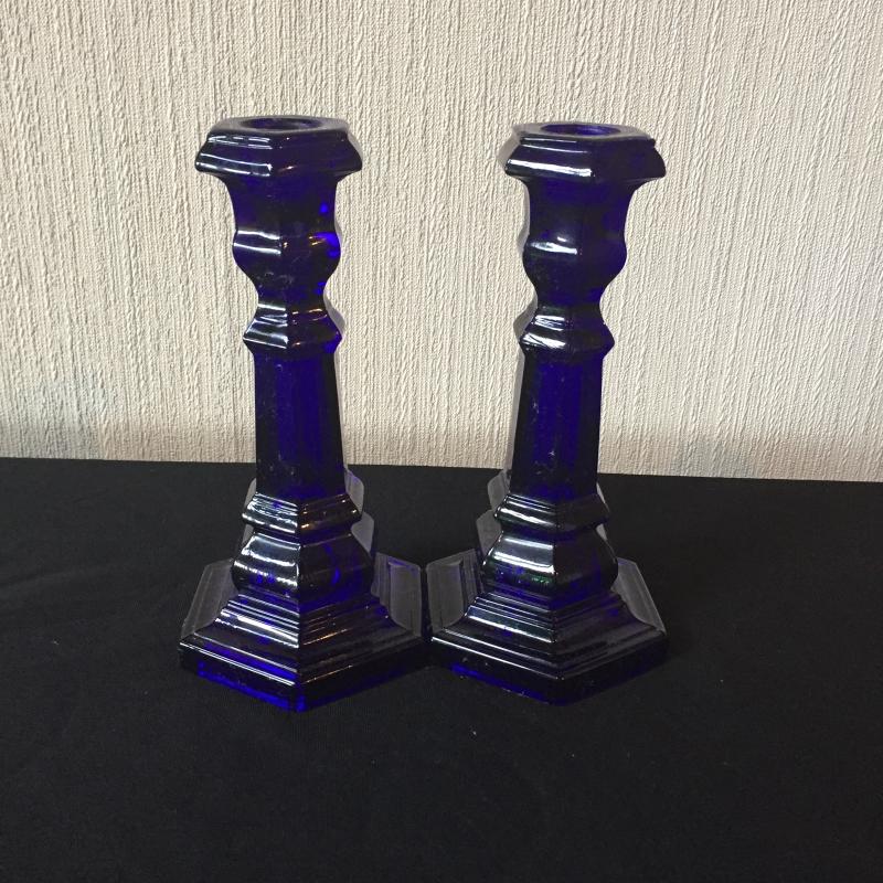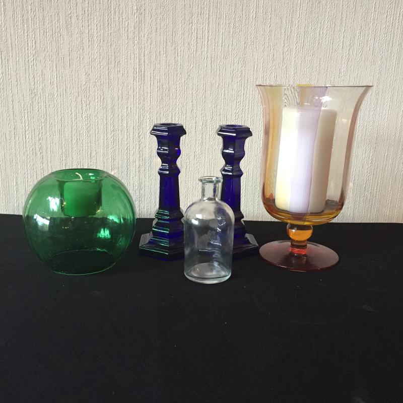 Assortment of Colored Glass Candle Sticks and Candle Holders. Be ready for the next power outage. Largest candle holder Measures 10” Tall 6” D.