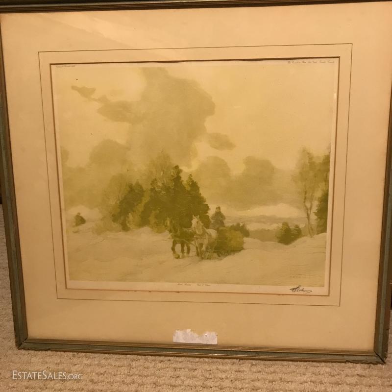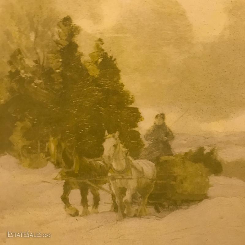 "March Morning" Print by Canadian Artist, Frederick Coburn. Print is signed by the artist. Nice snow sled scene in muted tones. Frame has sticker residue on glass that can be removed and may need a little reinforcing. Measures 25" x 23." Shipping available or local pick up in Asheville, NC.