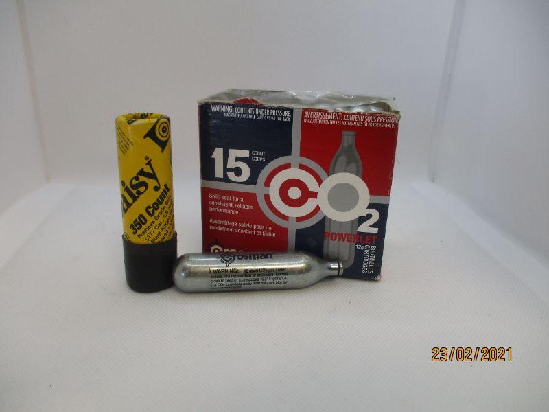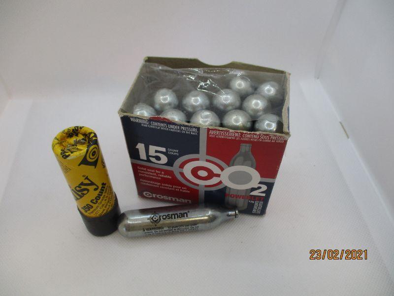 There is one tube of Daisy BBs which originally contained 350 BBs and is almost full. There are 12 canisters of CO2 by Crosman.