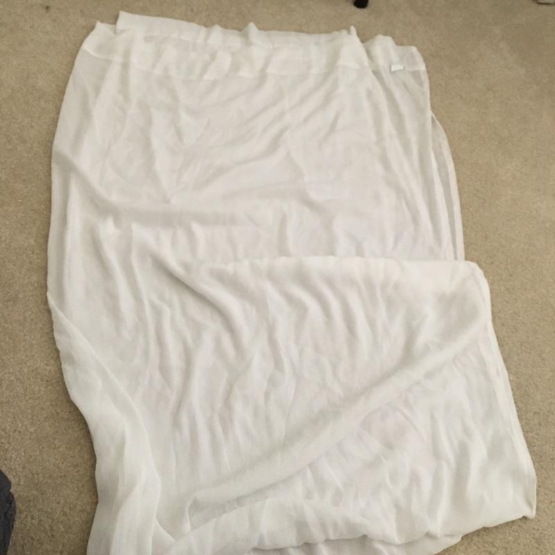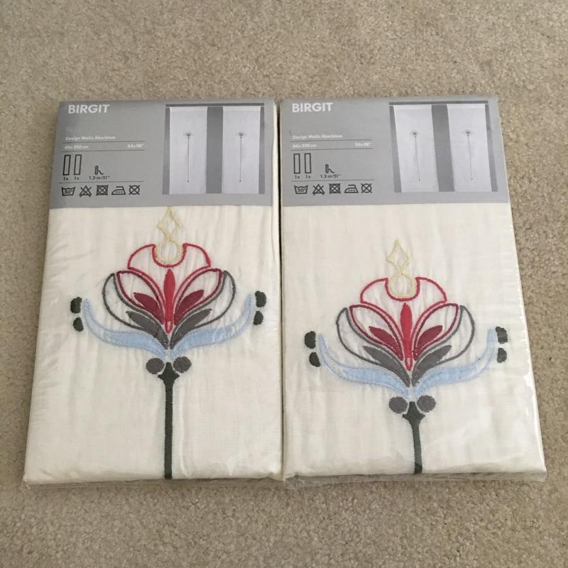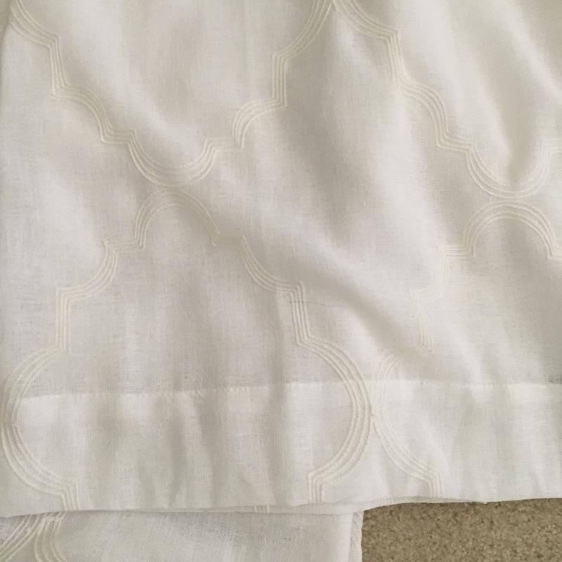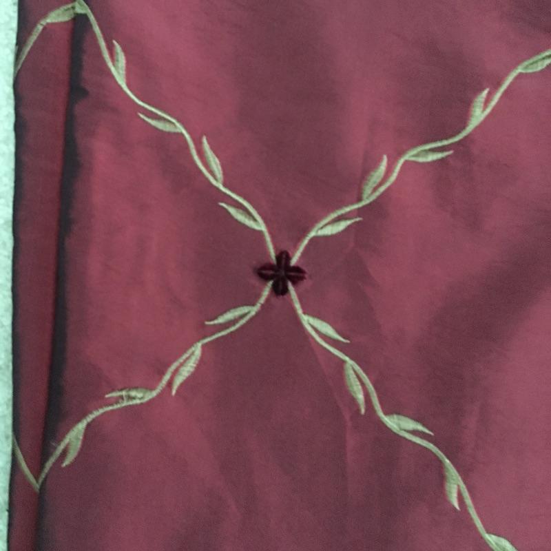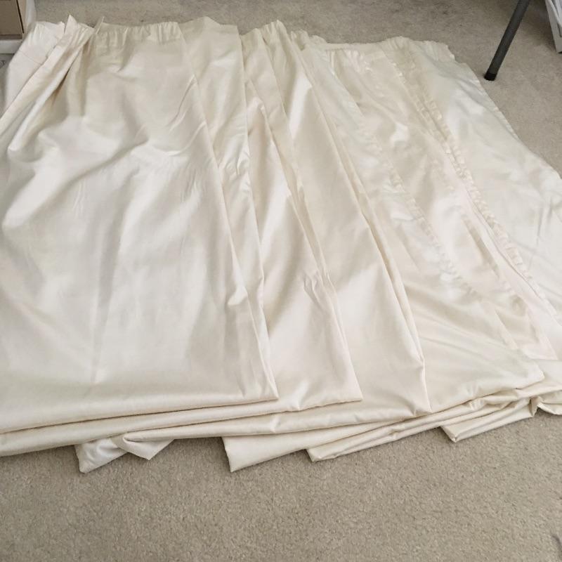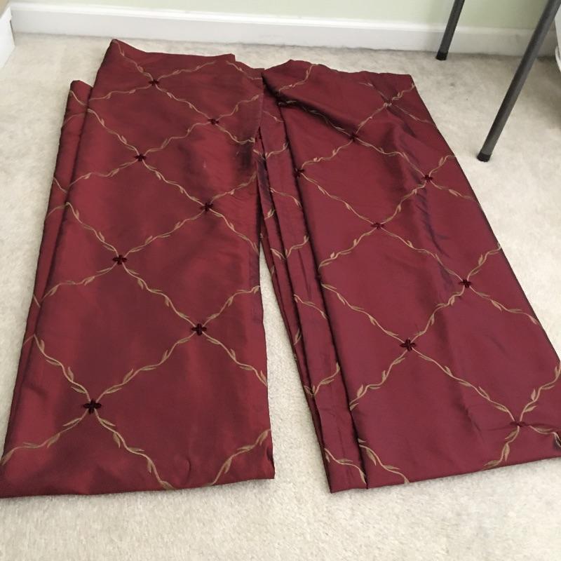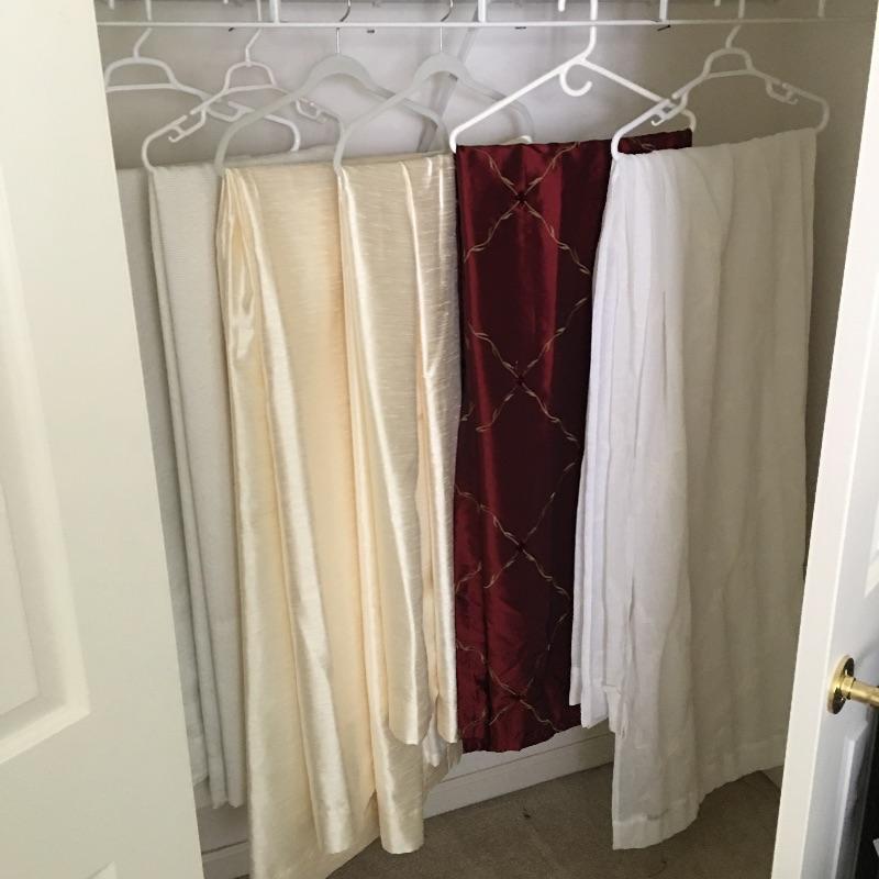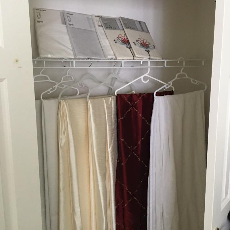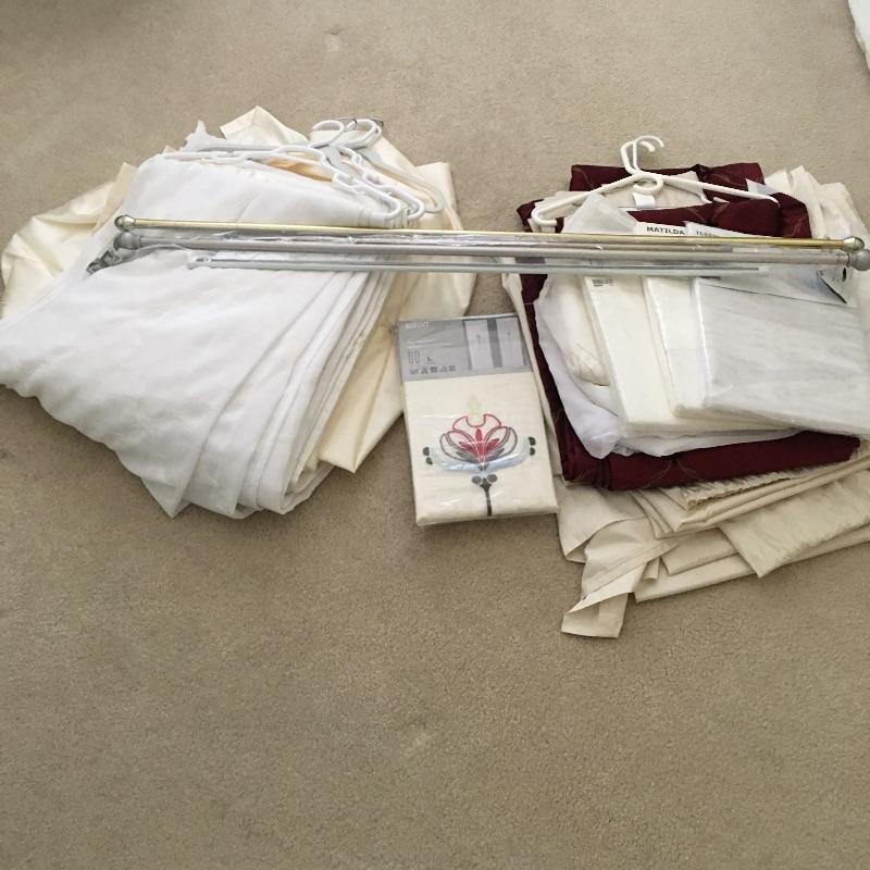 A plethora of curtain panels is included in this great lot. Lot includes still in package curtain panels, see pictures for size. Also includes two 56” x 83” panels, four cream and two burgundy colored panels that measure 53” x 83”, two 40” x 83”, six cream colored panels that measure 42” x 84”, curtain rods and a few single panels.