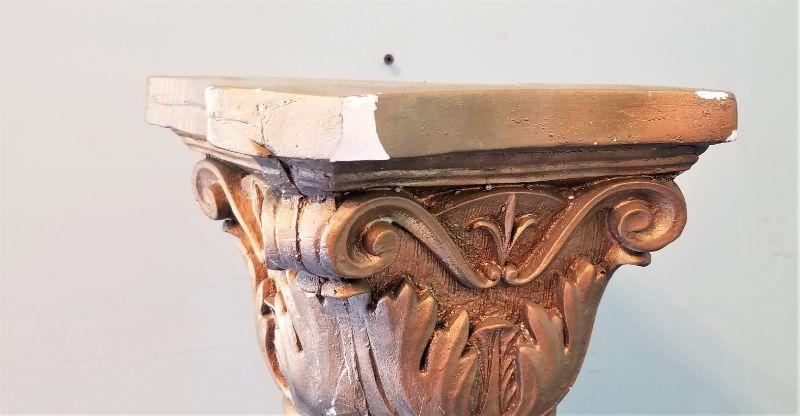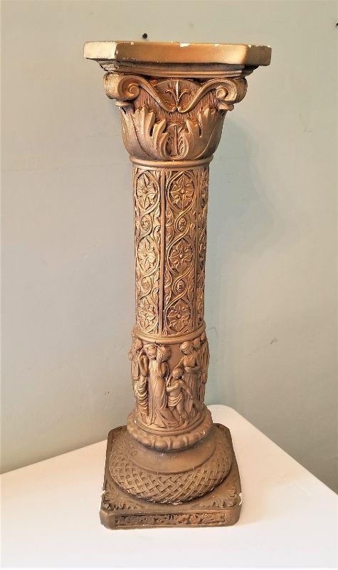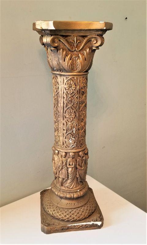 This plaster column was made in Mexico - classical styling - "old gold" color - you can see it's chippy, but that's a "thing" now. 29" tall, top is 9.5" x 9.5". Has some weight to it.