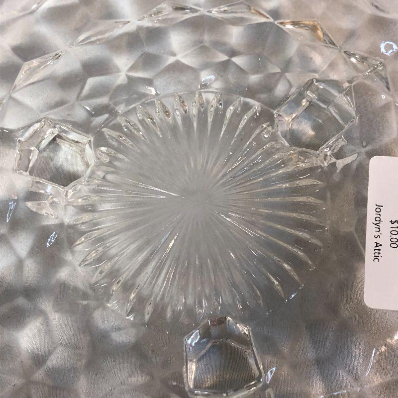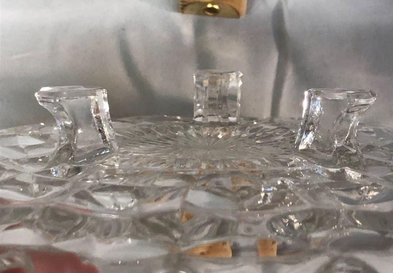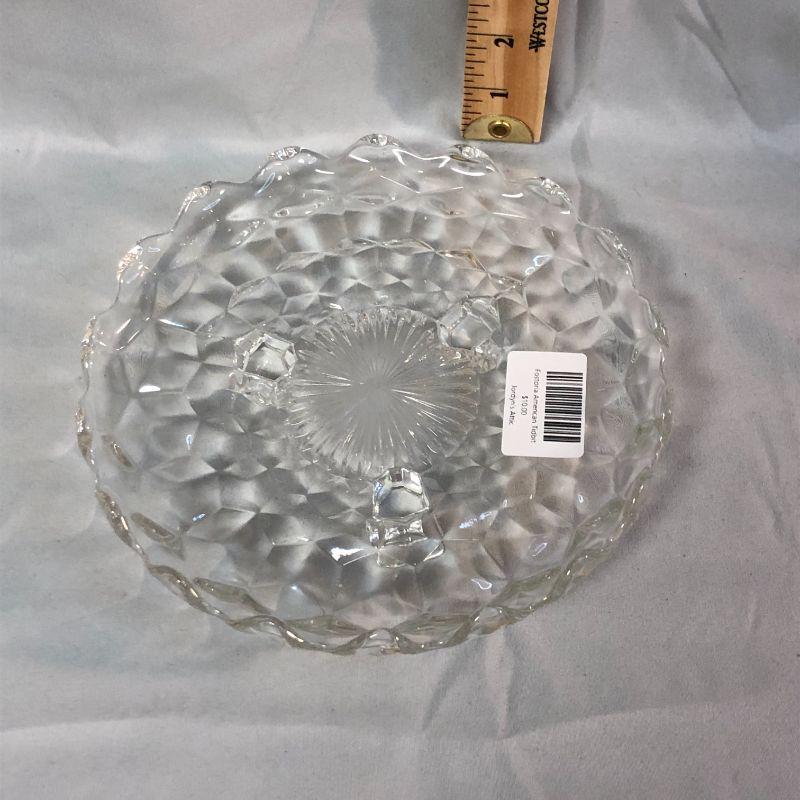 I am using the skinny lines in the center and the feet on this dish to identify it as Fostoria as opposed to Whitehall by Colony. It is in excellent condition and is about 7" in diameter.