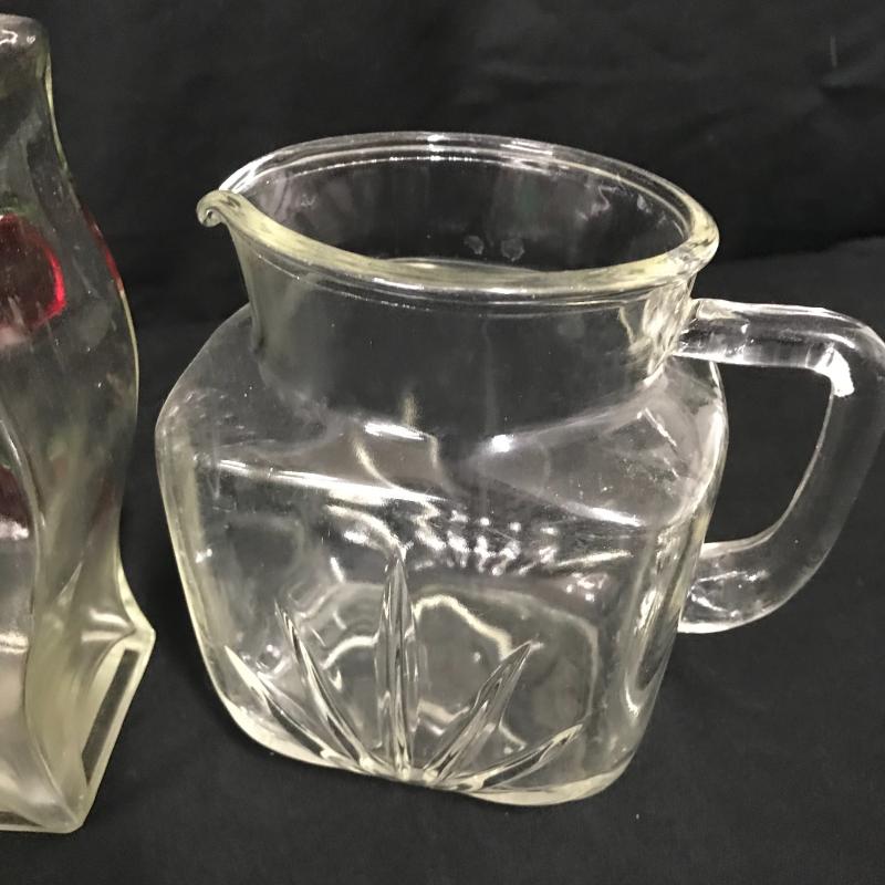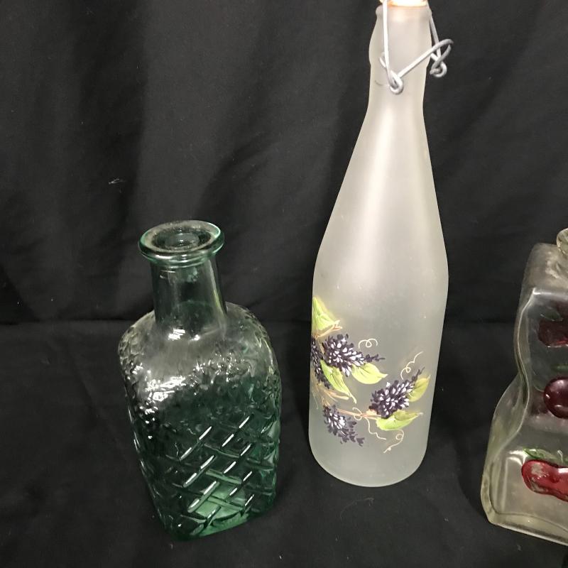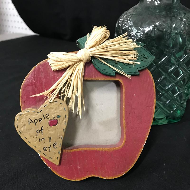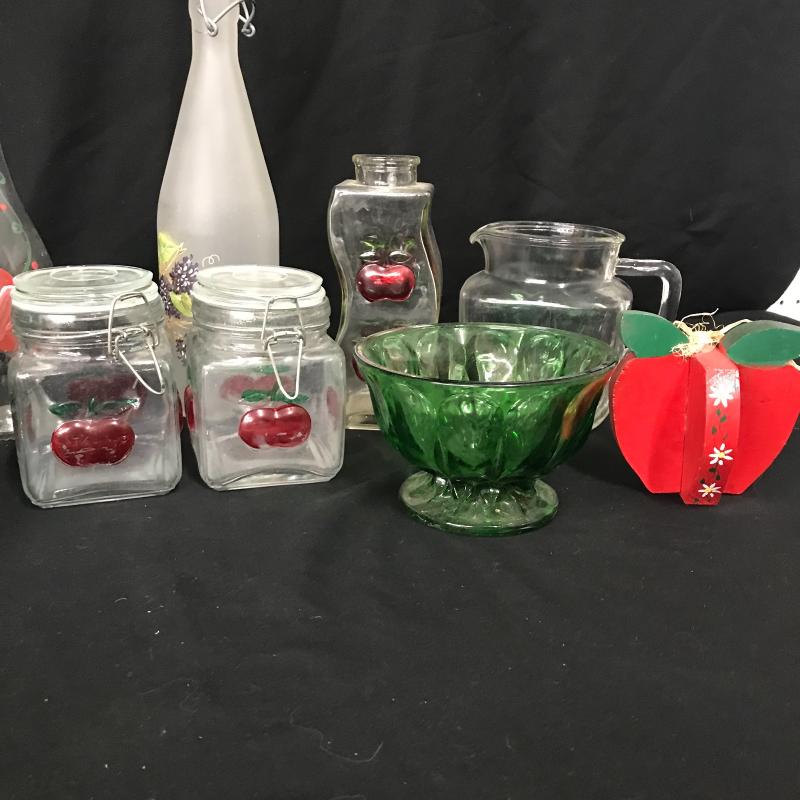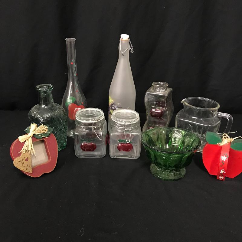 Green and clear glass. Some pieces have raised painted apples on them. Two wood apple decor pieces and vintage glass pitcher. Lot is available for local pick up in Maggie Valley, NC only.