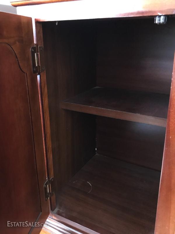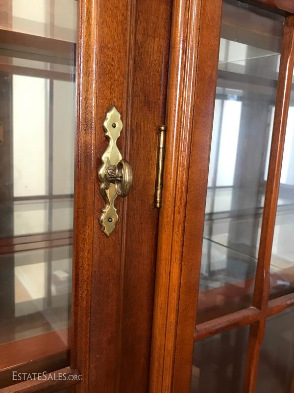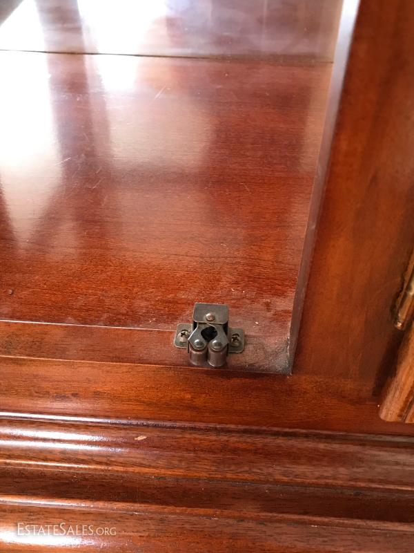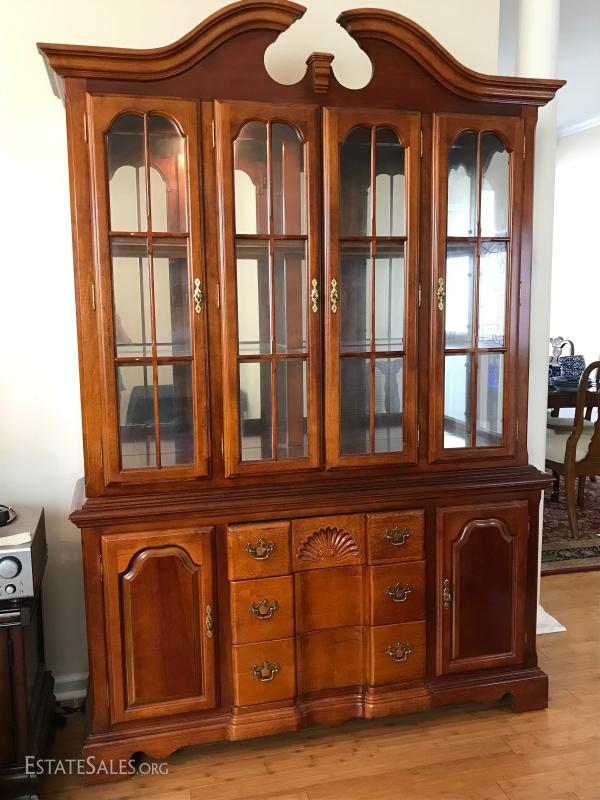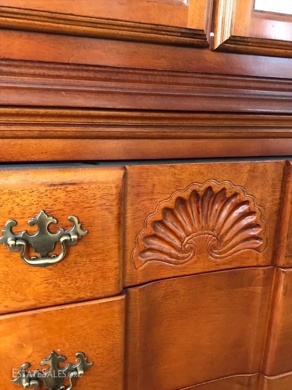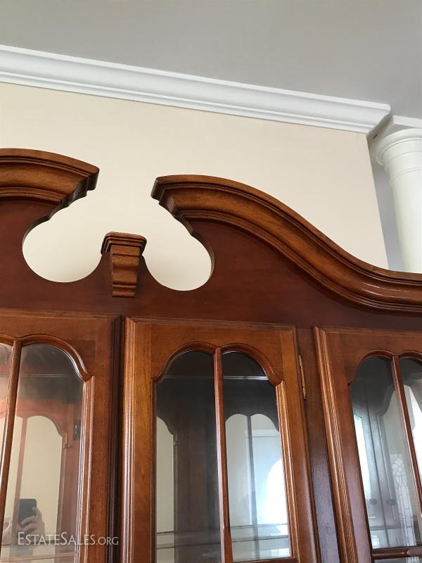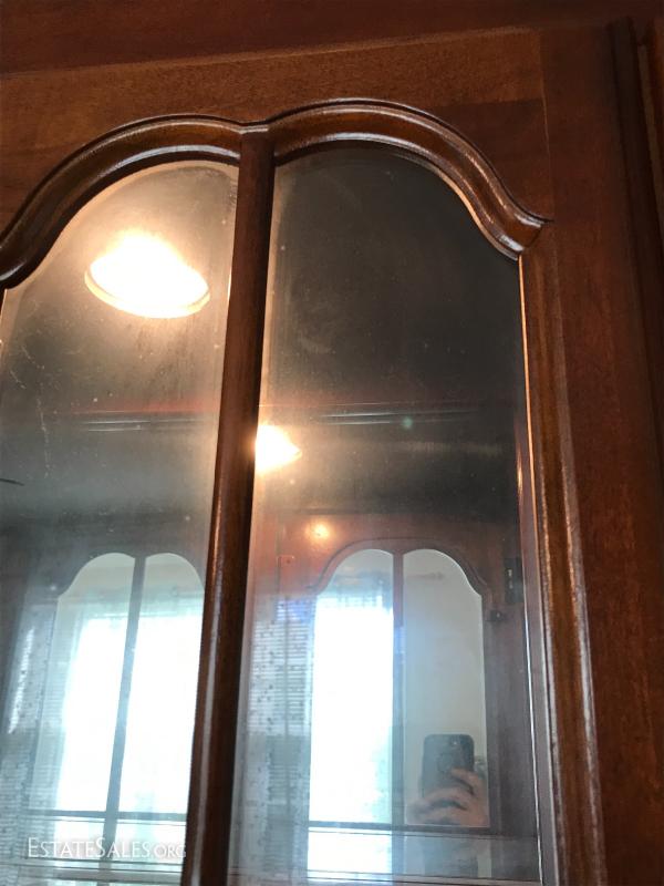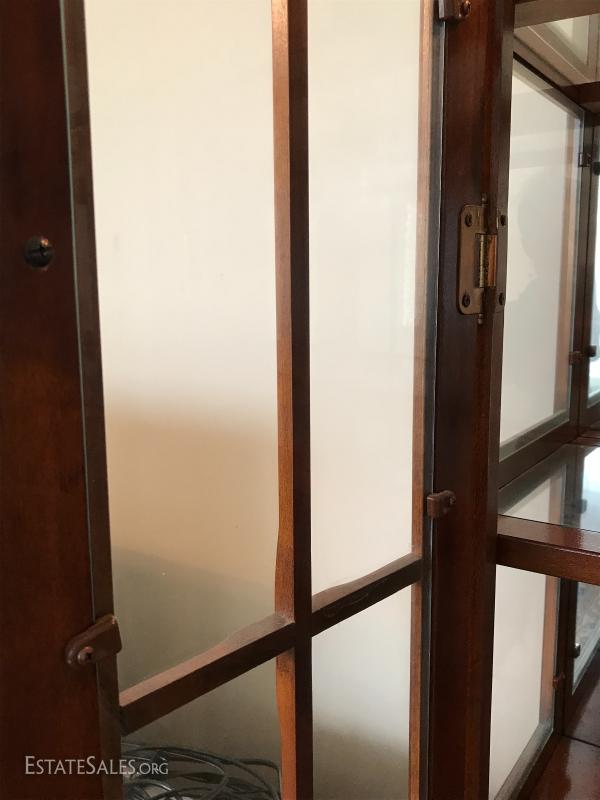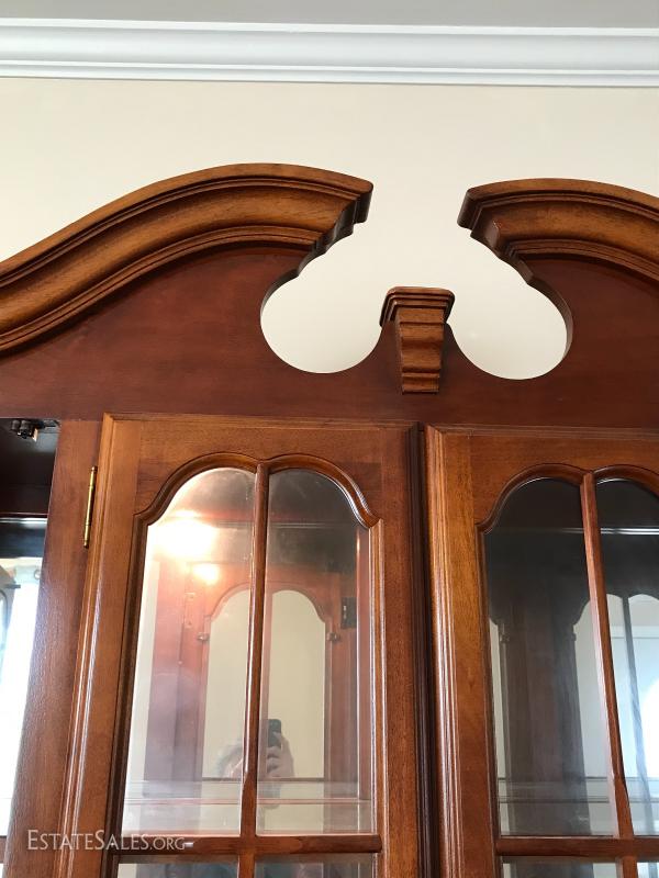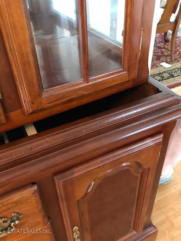 Two-piece hutch with built-in accent lighting. Bottom has three drawers and two doors, top has four glass-pained doors. 57.5"l x 16.5"w x 84"h.
