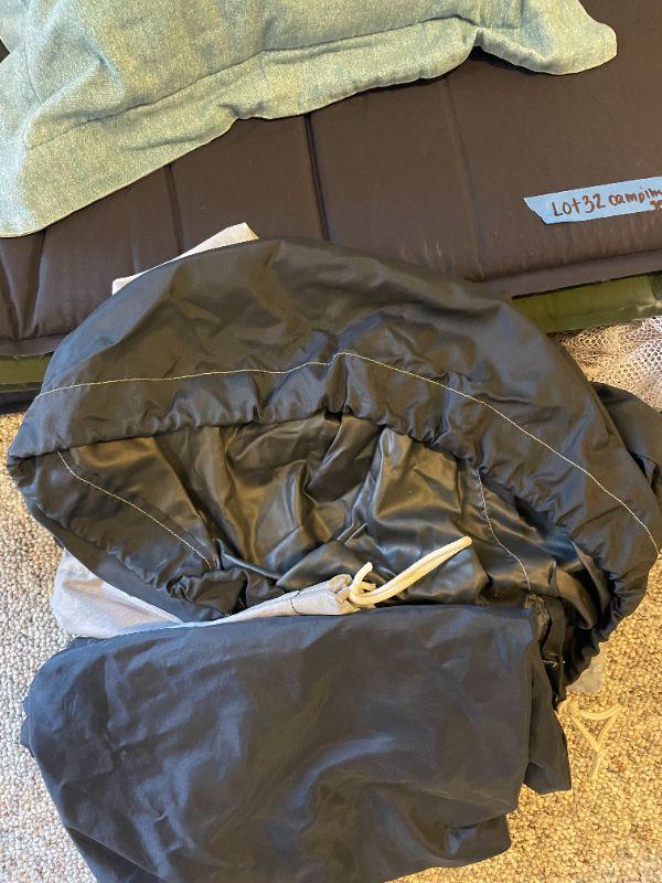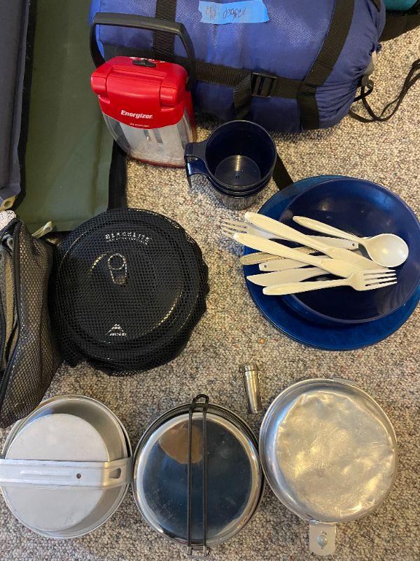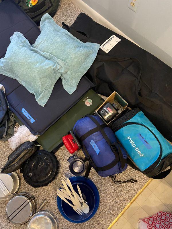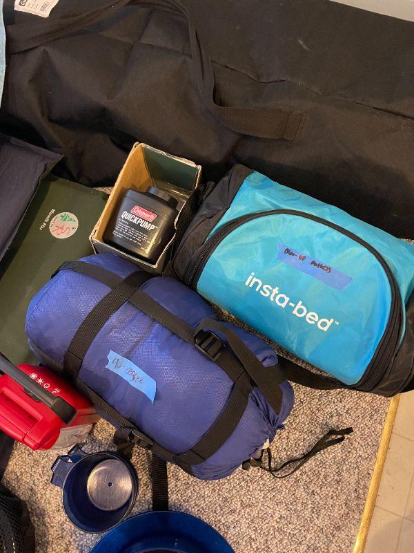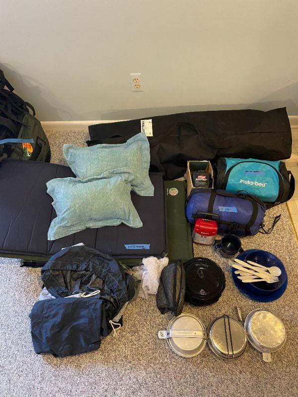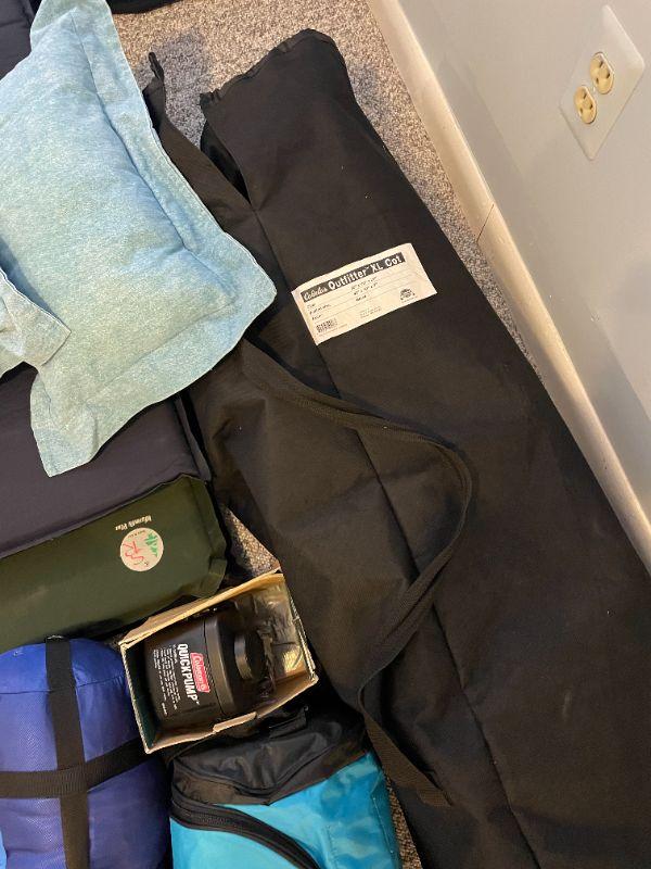 Cabela's outfitter xl cot, insta-bed blow up mattress, Coleman quick pump, (2) 1 inch sleeping pads, 40 degree sleeping bag, eating set, (3) pan sets, energizer led light, (2) pillows, group of bags for packing.