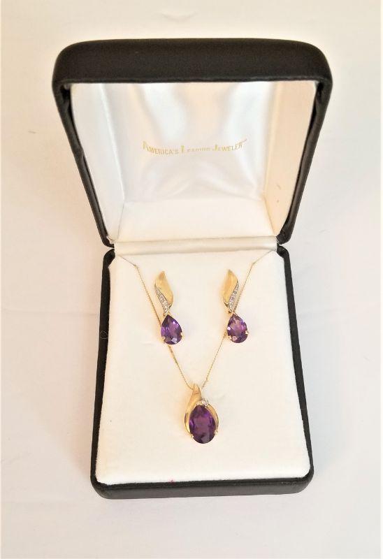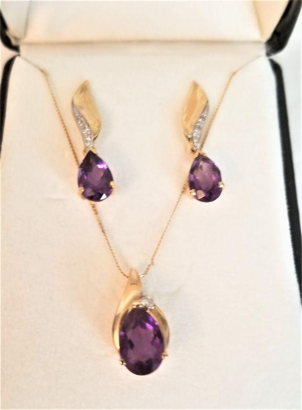 Very pretty set with oval amethysts set in 14kt gold (marked). Pierced earrings and necklace - all have diamond chips for accents. Earrings are 1.25" long. Necklace is 17 inches long. Classic beauty.