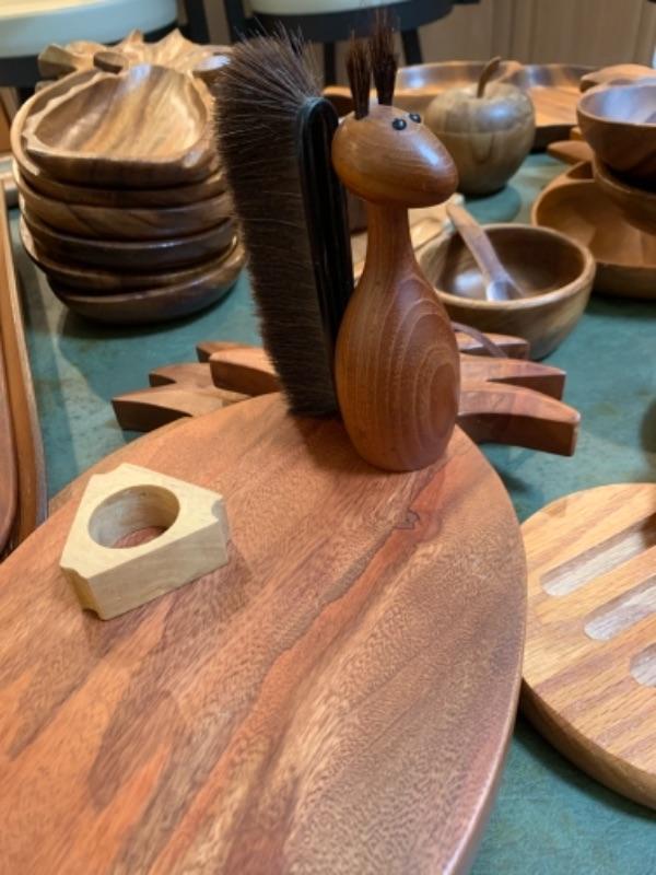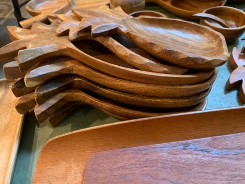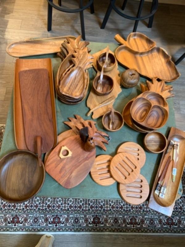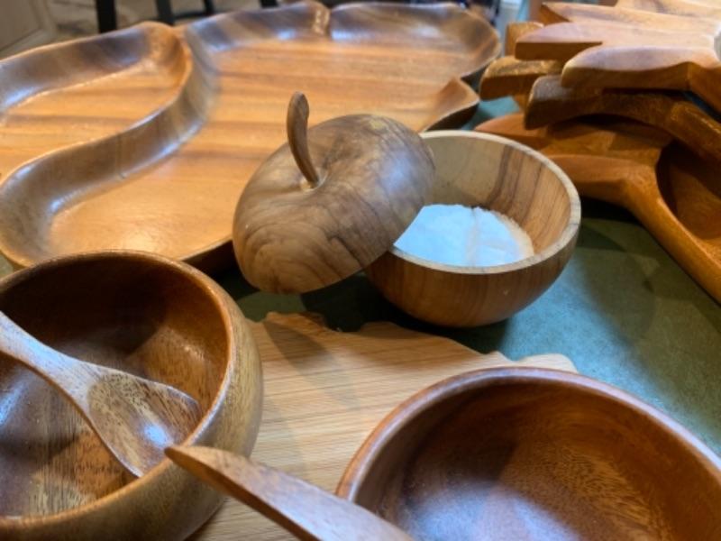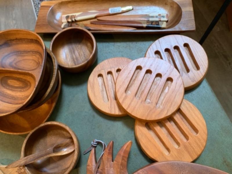 Lot 32. Mid Century Wooden bowls, platters, four letter openers, Hawaiian monkey pod serving bowls, cutting boards, wooden utensils, etc.“” $150