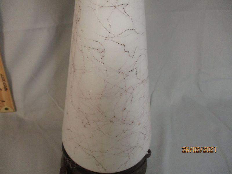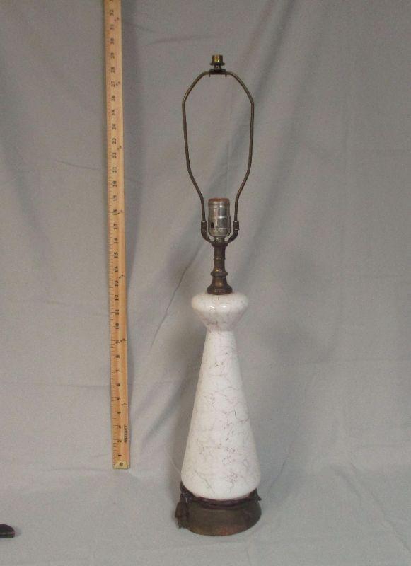Consignor states that the lamp worked the last time she plugged it in and had a light bulb in it. It is milk glass with a gold paint design. It does seem to need a new thingie where the light bulb screws in which is an easy fix (even I can do it!). It stands 28.5" to the top of the finial.