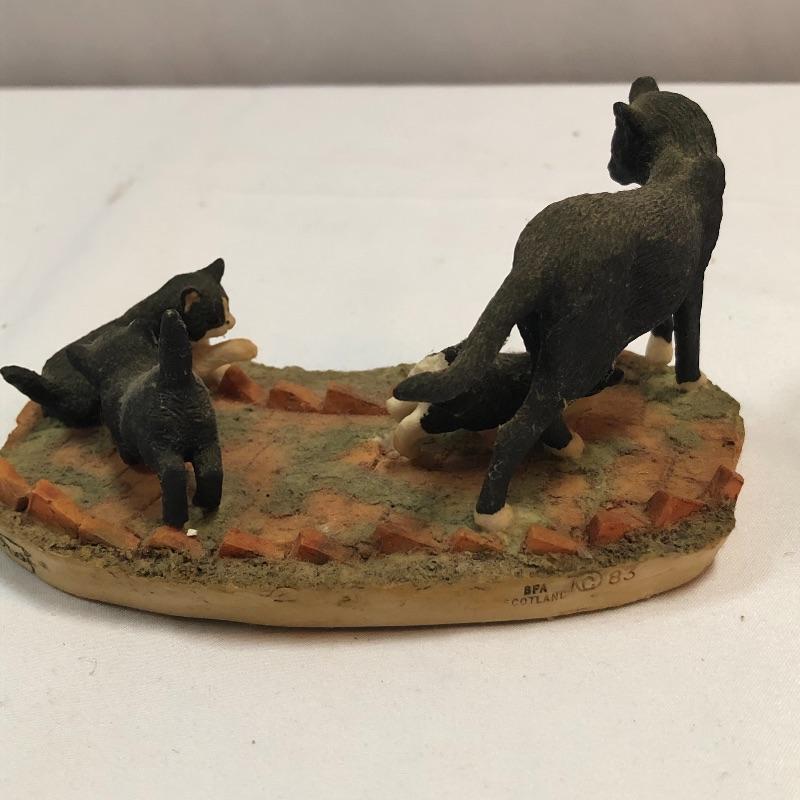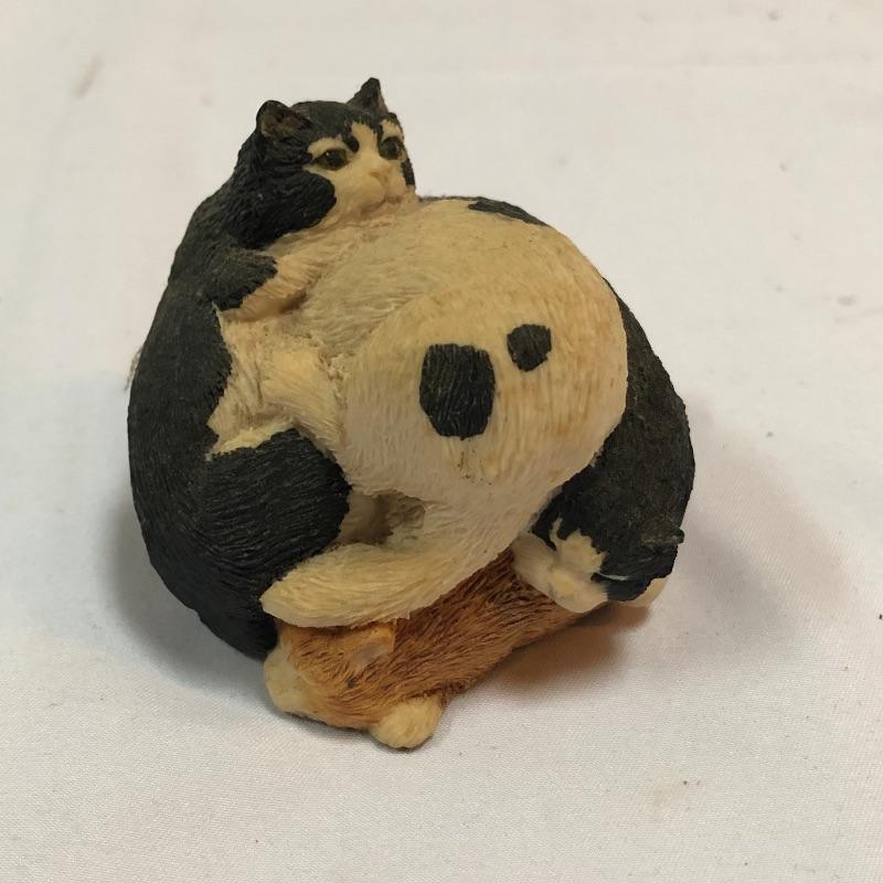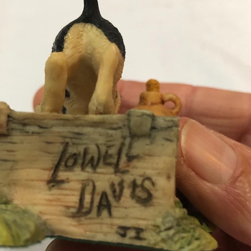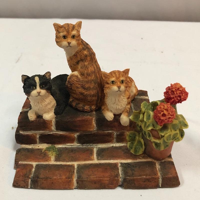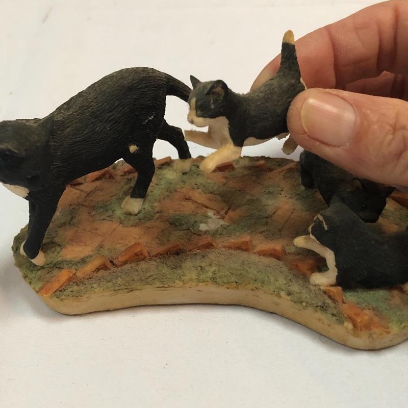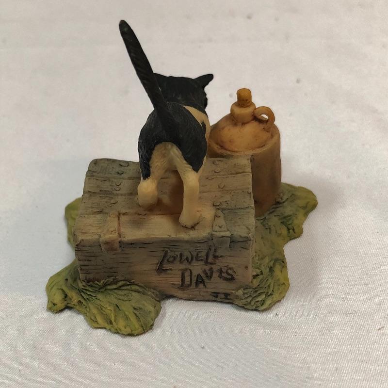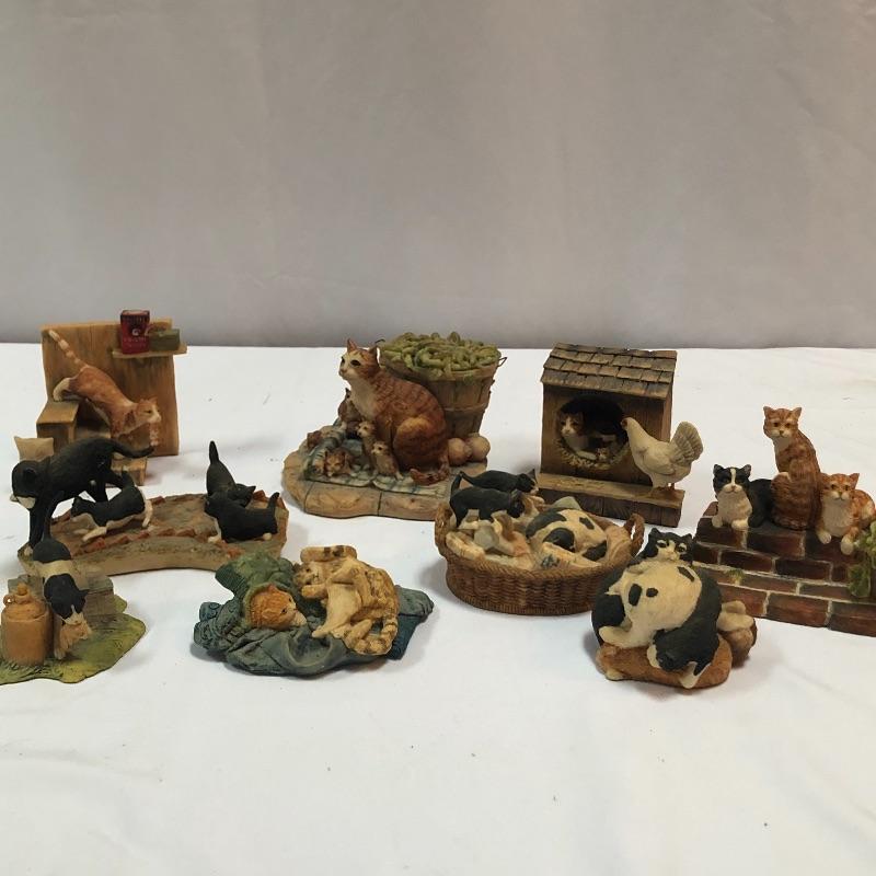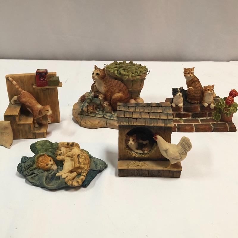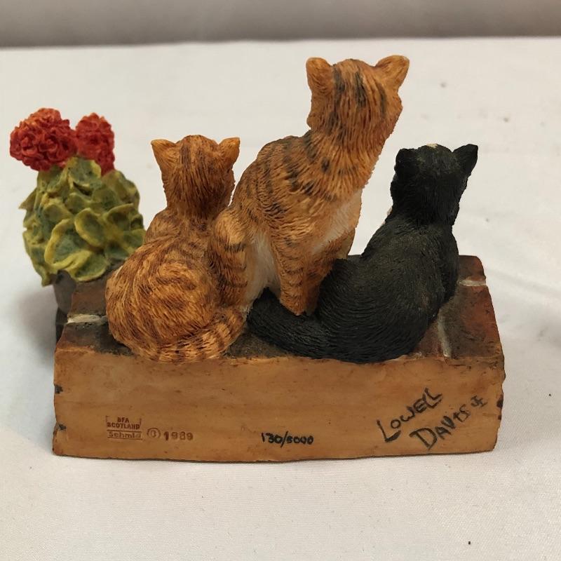 A total of nine cat figurines in this lot. The first 5 pictured have Lowell Davis makers marks and the last 4 are marked differently, but with a similar look to them. One figurine has a an animal cat that it has become unattached that could easily be glued back into place; this is shown in the images.