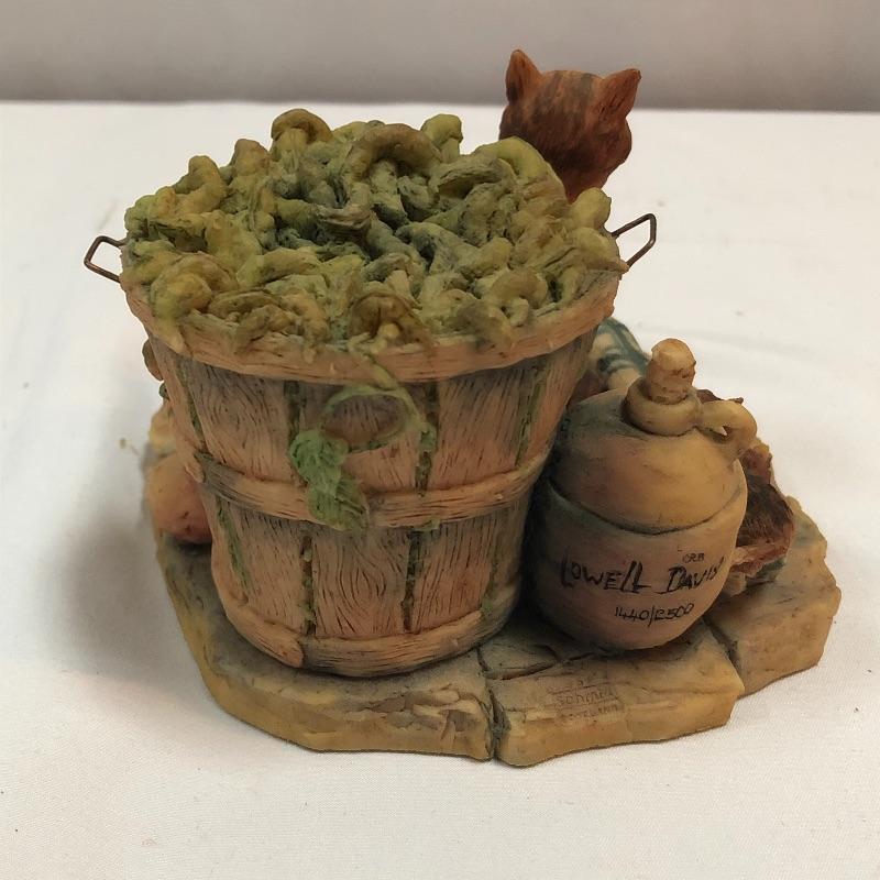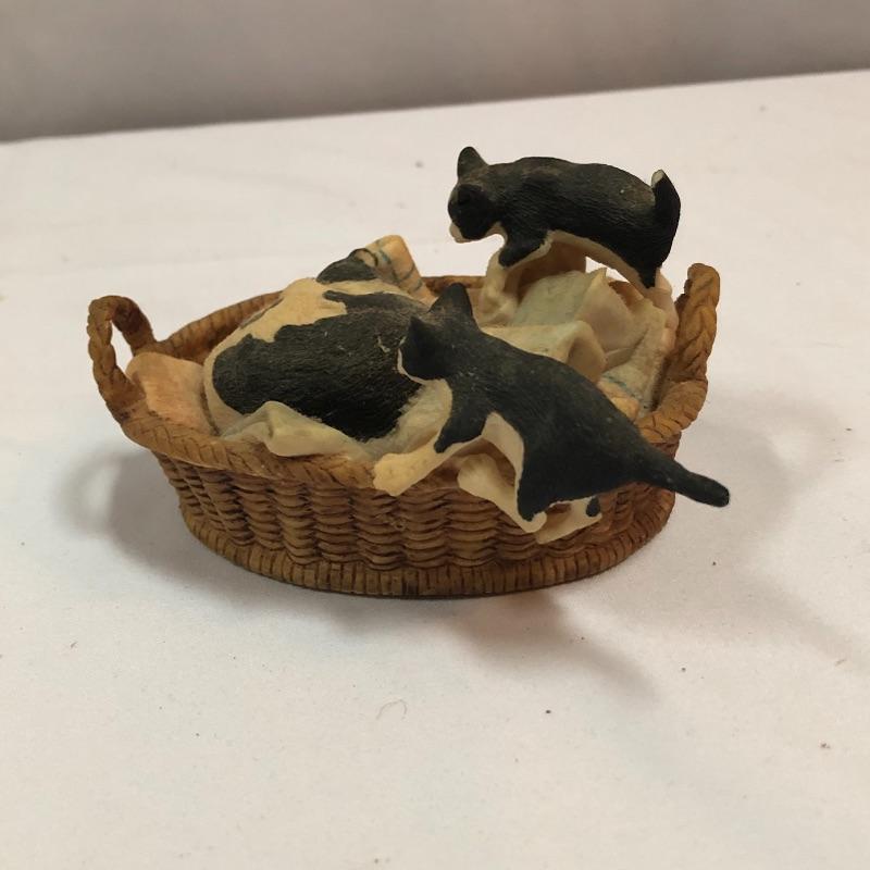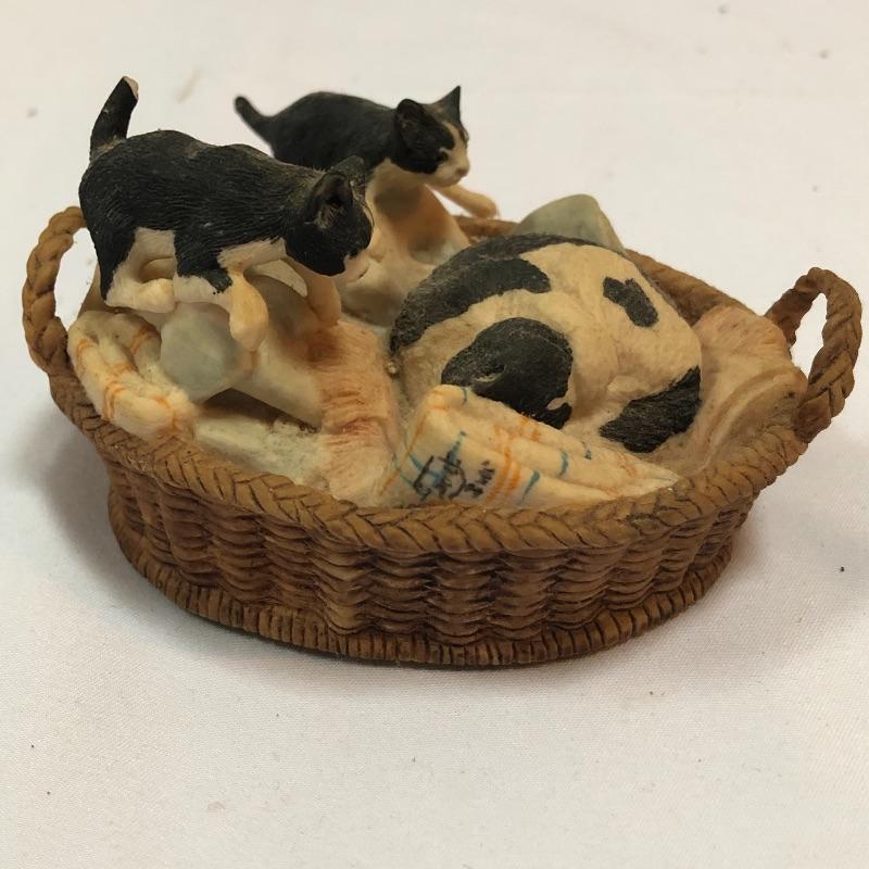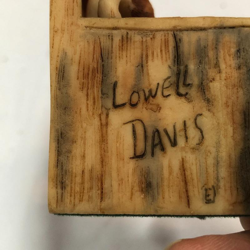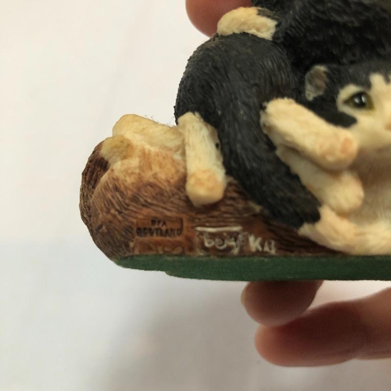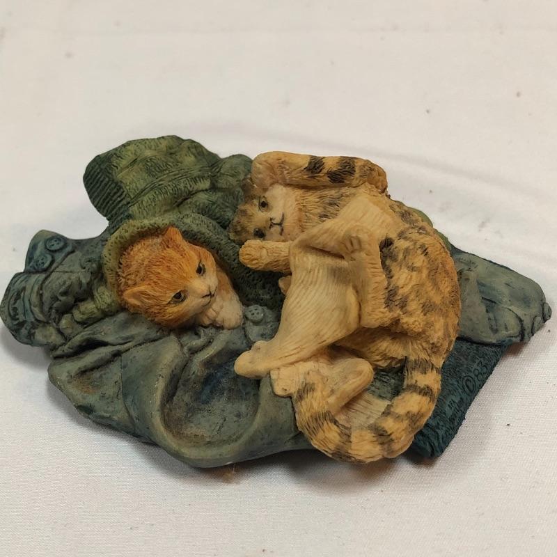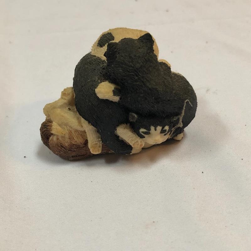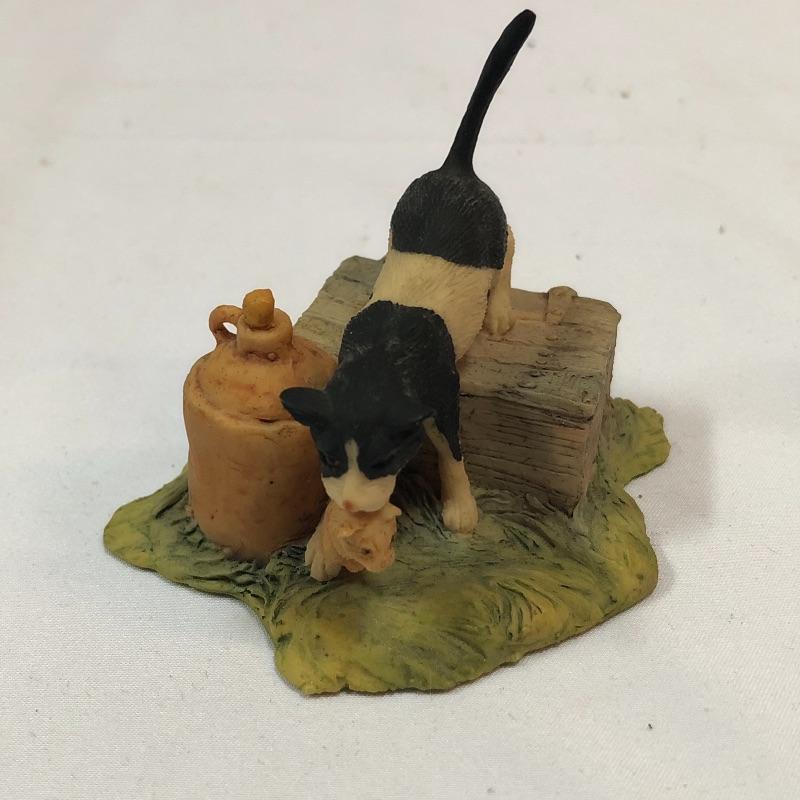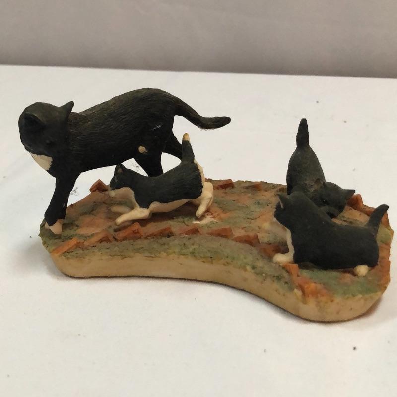 A total of nine cat figurines in this lot. The first 5 pictured have Lowell Davis makers marks and the last 4 are marked differently, but with a similar look to them. One figurine has a an animal cat that it has become unattached that could easily be glued back into place; this is shown in the images.