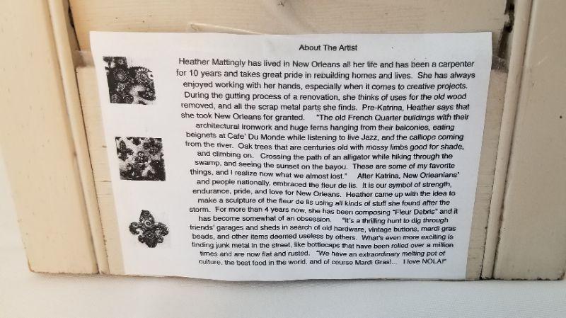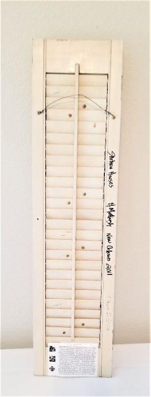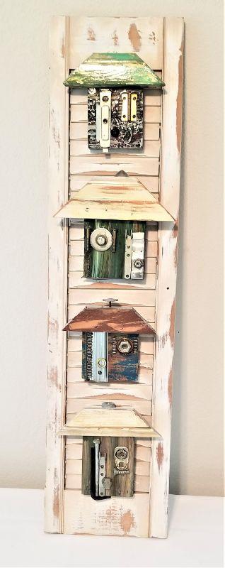 Very cute mixed media piece done on an old shutter - "Shotgun Houses". Dated 2011, done by local artist Heather Mattingly. 32" tall, 8" across. Good condition. You'll like this one.