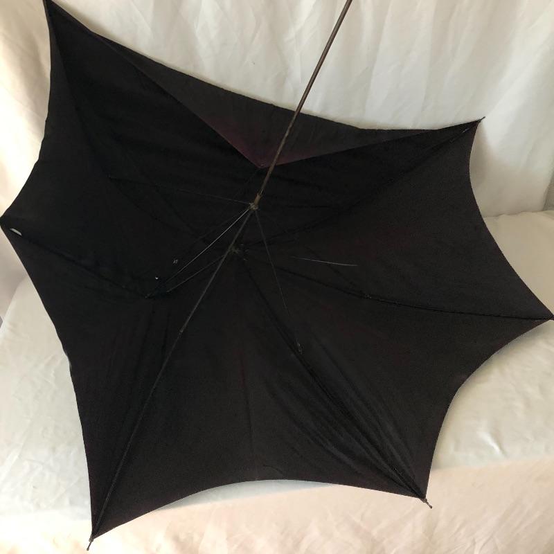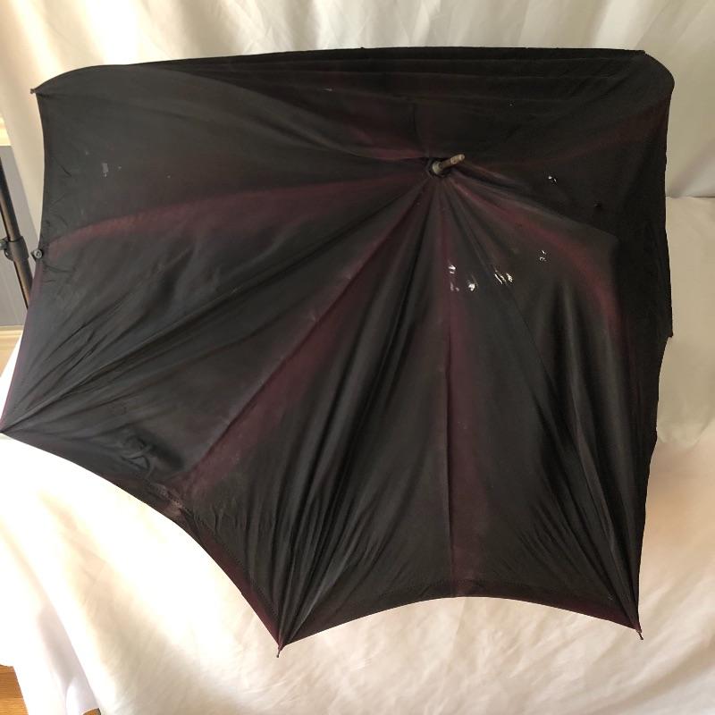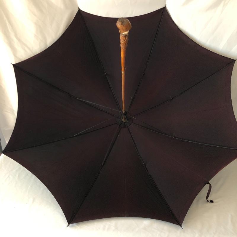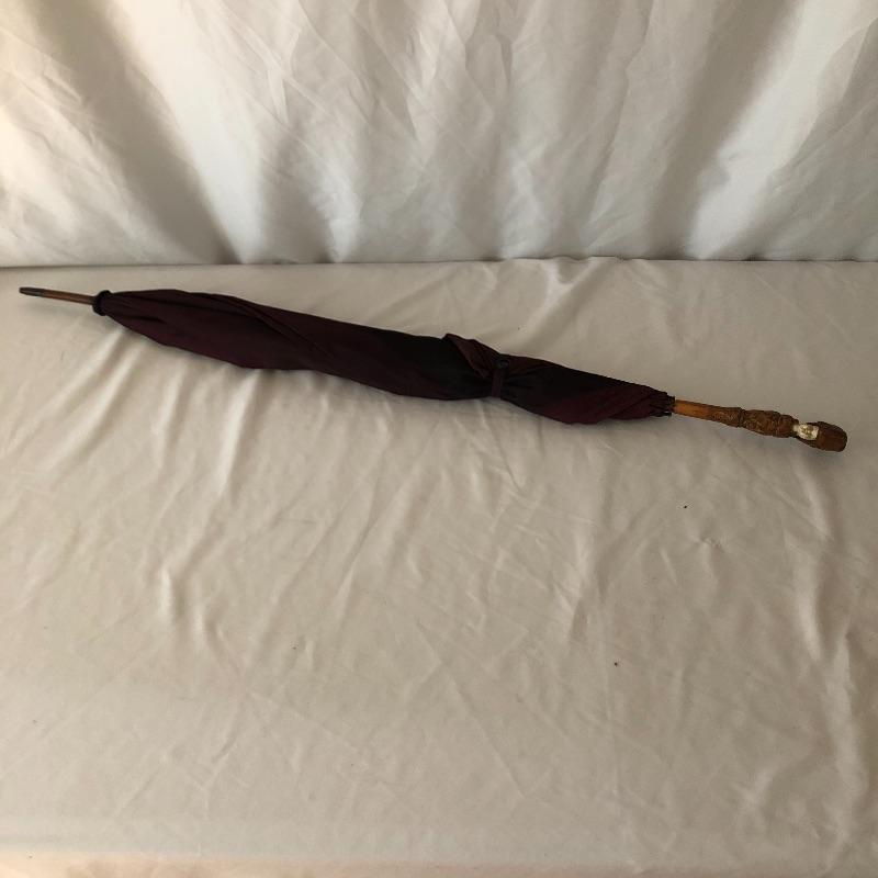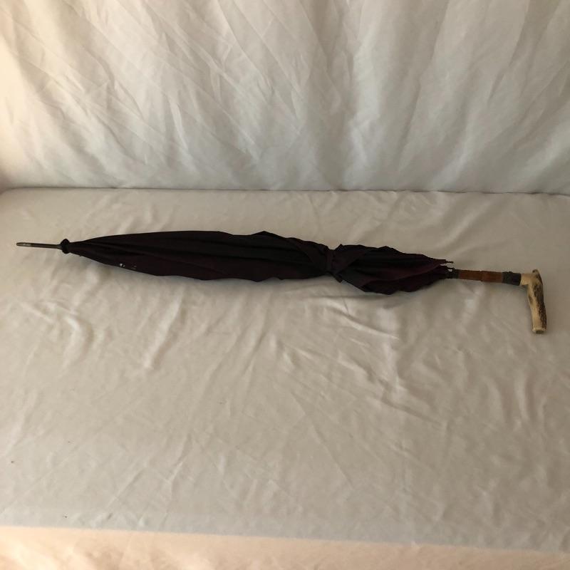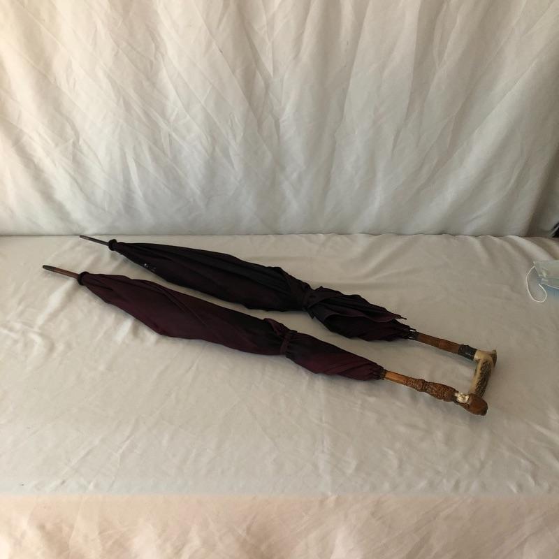Stay stylish and keep dry with this pair of umbrellas. Lot includes one carved wooden handled umbrella that is in good shape with some fading on the material. The second umbrella has a carved handle that appears to be antler, this umbrella has a piece that is not attached and some holes in the fabric. Largest umbrella measures 44”D.