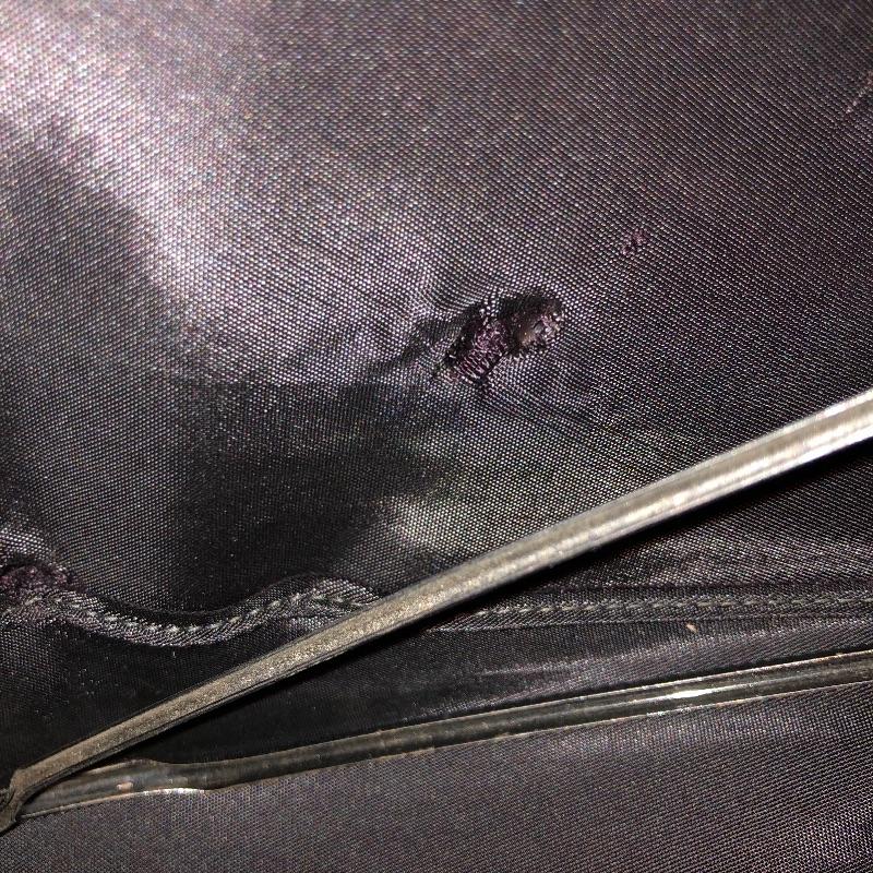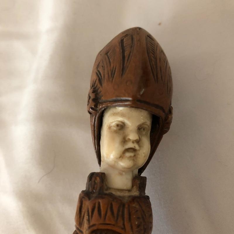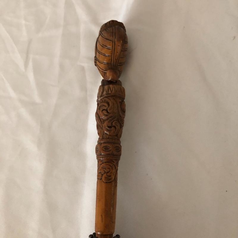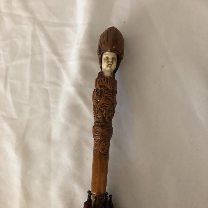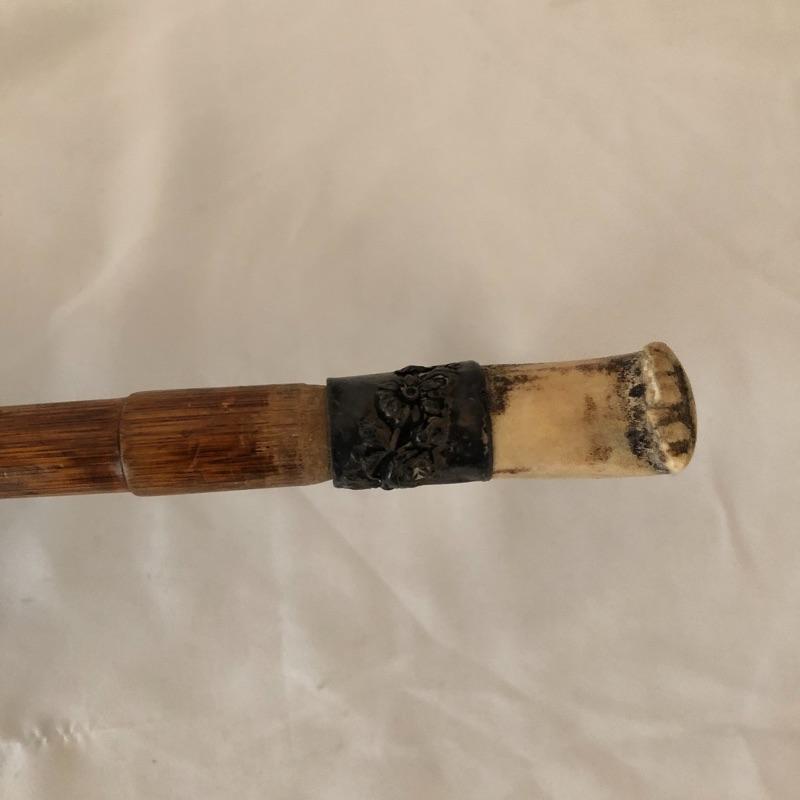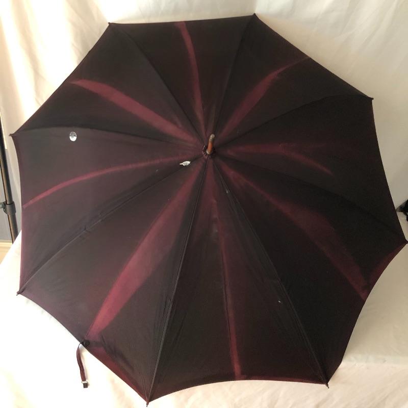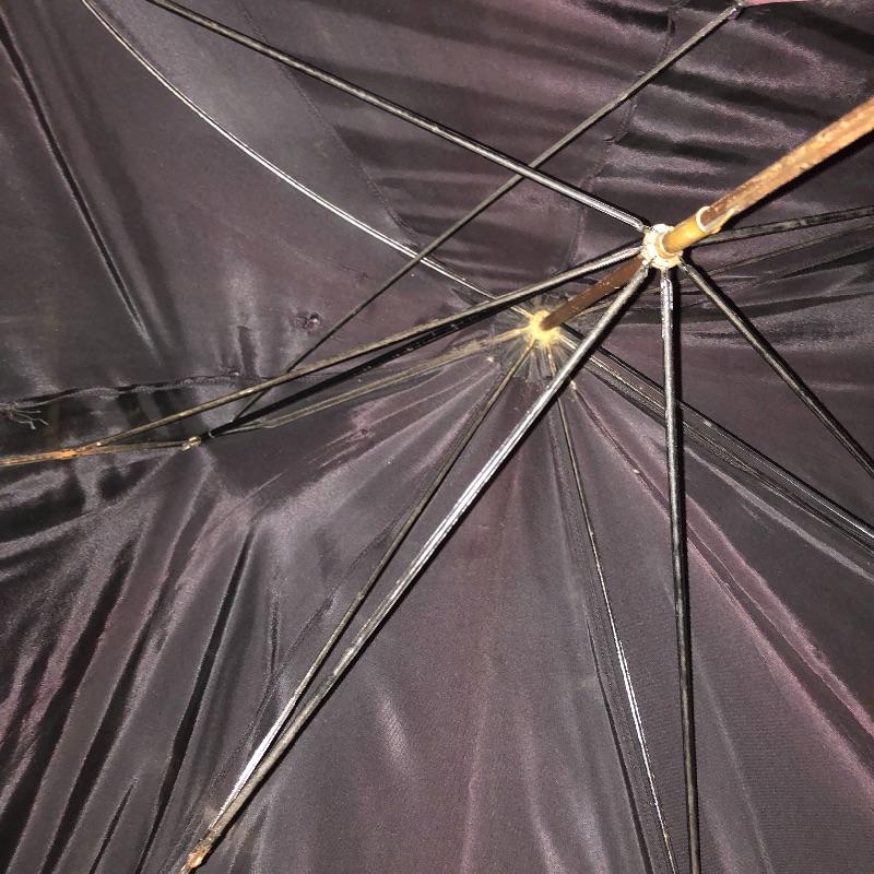 Stay stylish and keep dry with this pair of umbrellas. Lot includes one carved wooden handled umbrella that is in good shape with some fading on the material. The second umbrella has a carved handle that appears to be antler, this umbrella has a piece that is not attached and some holes in the fabric. Largest umbrella measures 44”D.