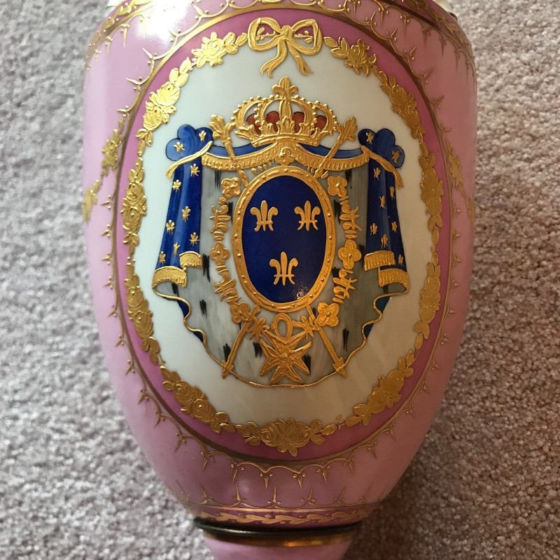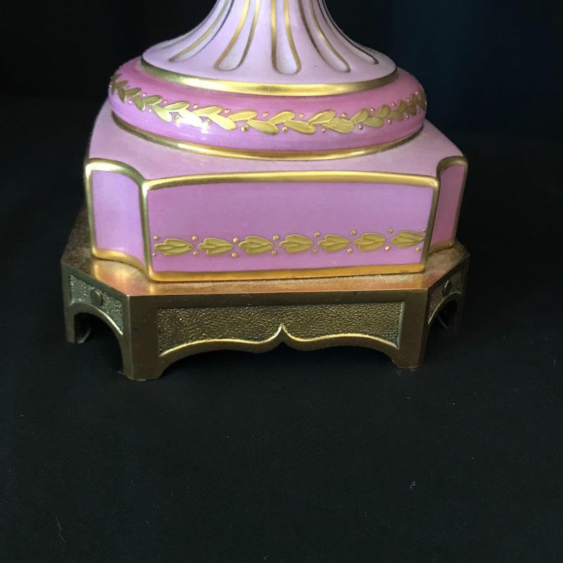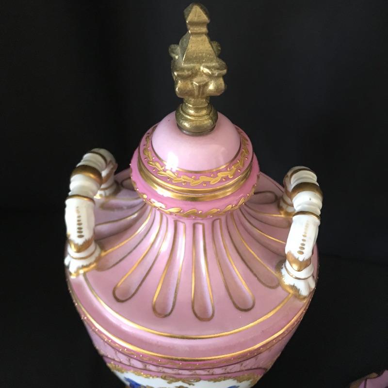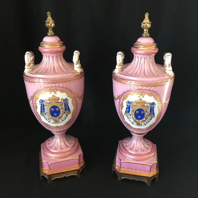 This lovely pair of pink metal “urns” would be a great addition to matching bedside tables or as adornment in an elegant bathroom or living room. Pieces do not open. Decoration only. Shipping available.