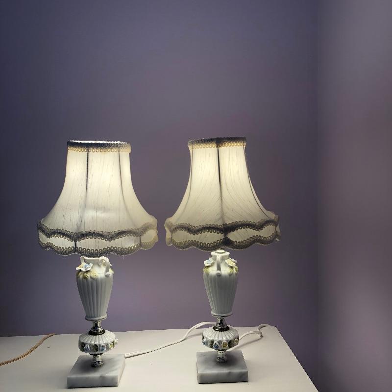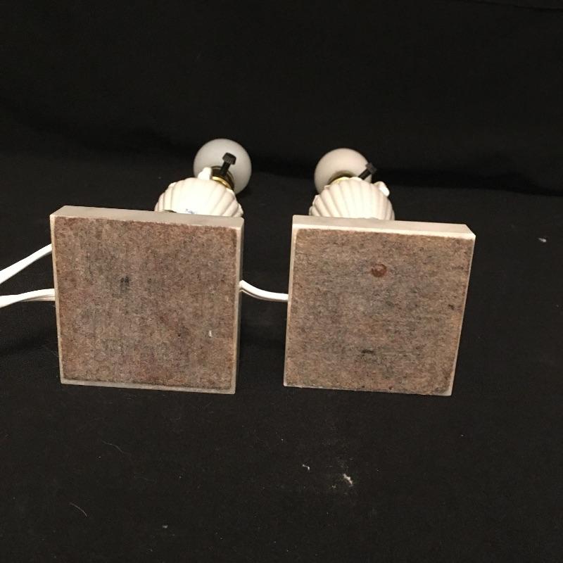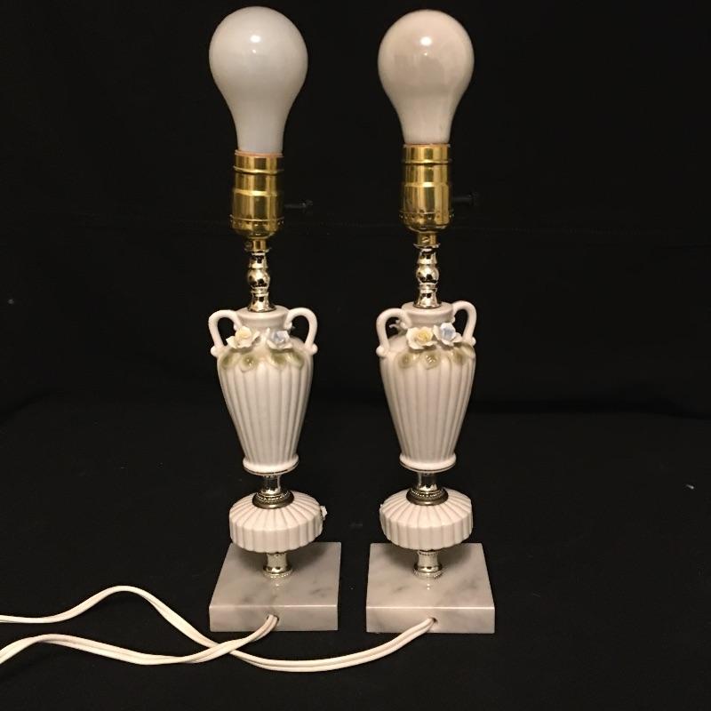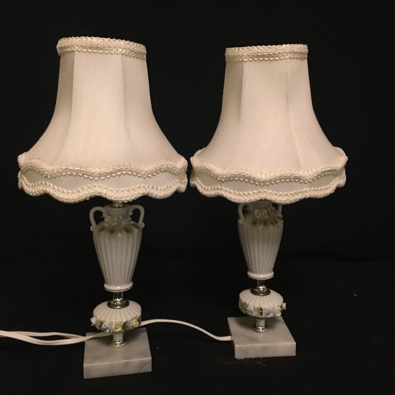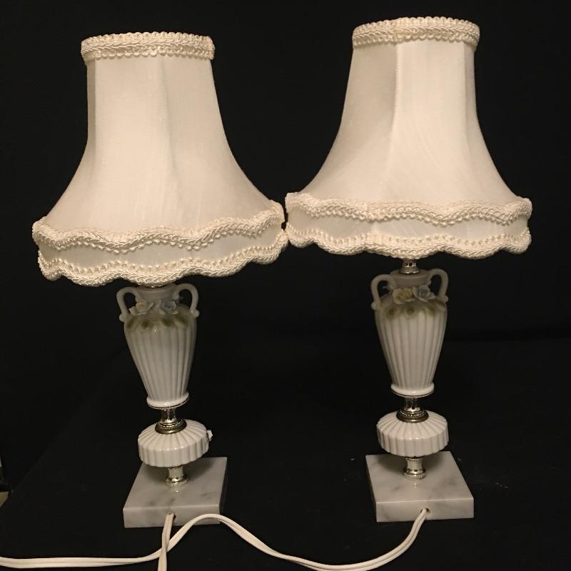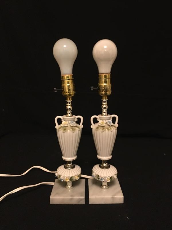 Pair of matching table lamps with precious dainty flowers and what appears to be a stone base. Both lamps come with matching ivory shades and worked when switched on. Lamps measure 17” tall.
