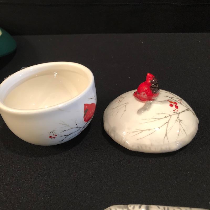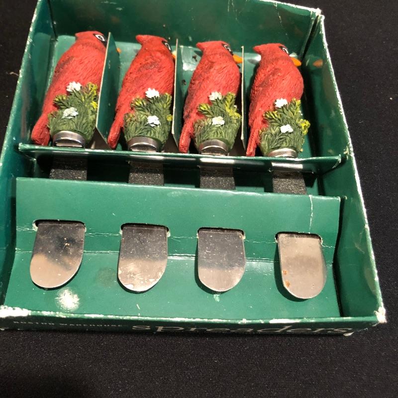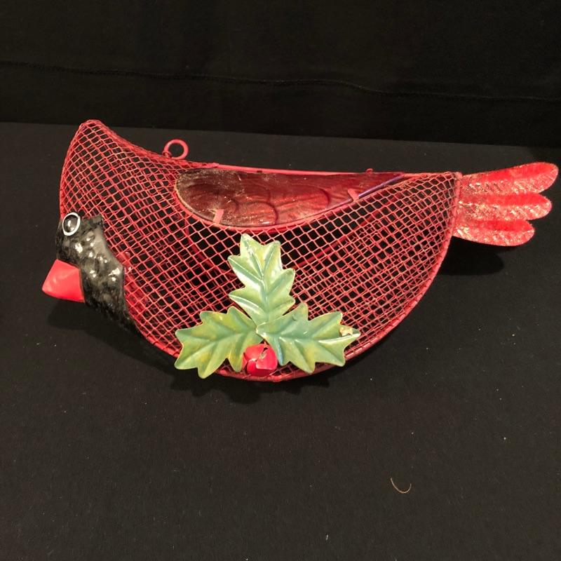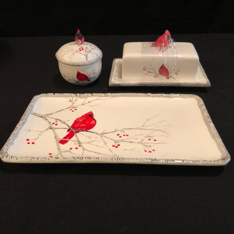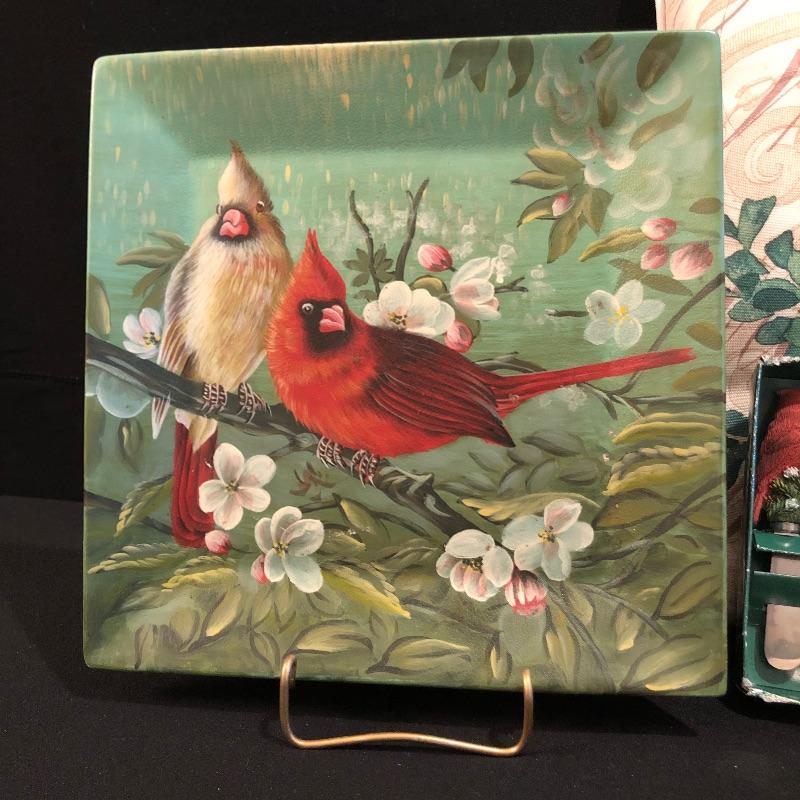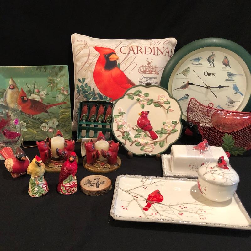 This large lot celebrates our state bird, the Red Cardinal. A wonderful assortment of items that includes a salt & pepper shaker set, decorative plates and a pillow. Lot also features a cheese knife set, a 19” x 29” doormat, a metal bird feeder with poinsettia accents, pair of candles with tag, votive holder, a small stamped wooden decorative coaster, Orvis clock, and a serving dish set that includes a platter, an unopened butter dish and lidded bowl. Clock measures 12”d and could use a quick cleaning. It also needs AA batteries and was not tested. The bird feeder needs a small repair to be able to hang it for its intended purpose. See pictures for known blemishes.